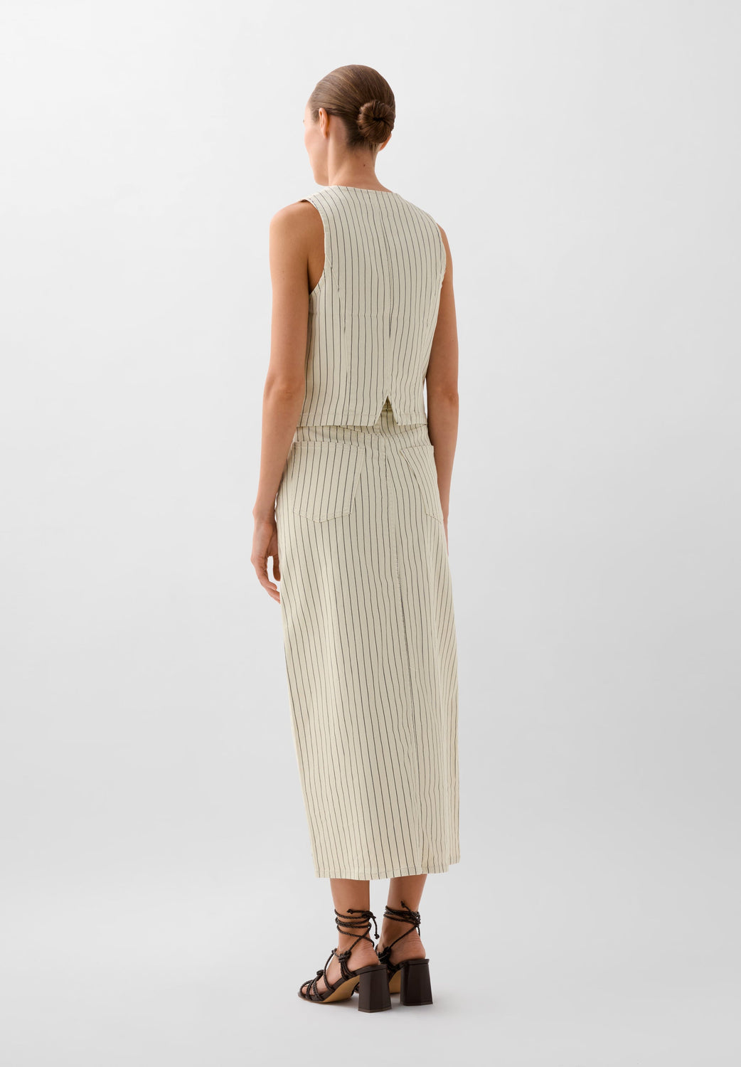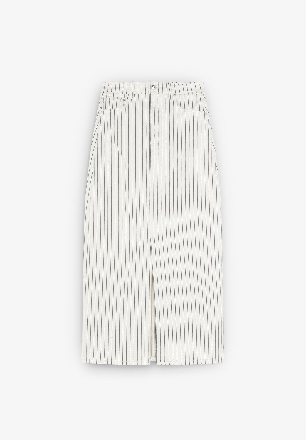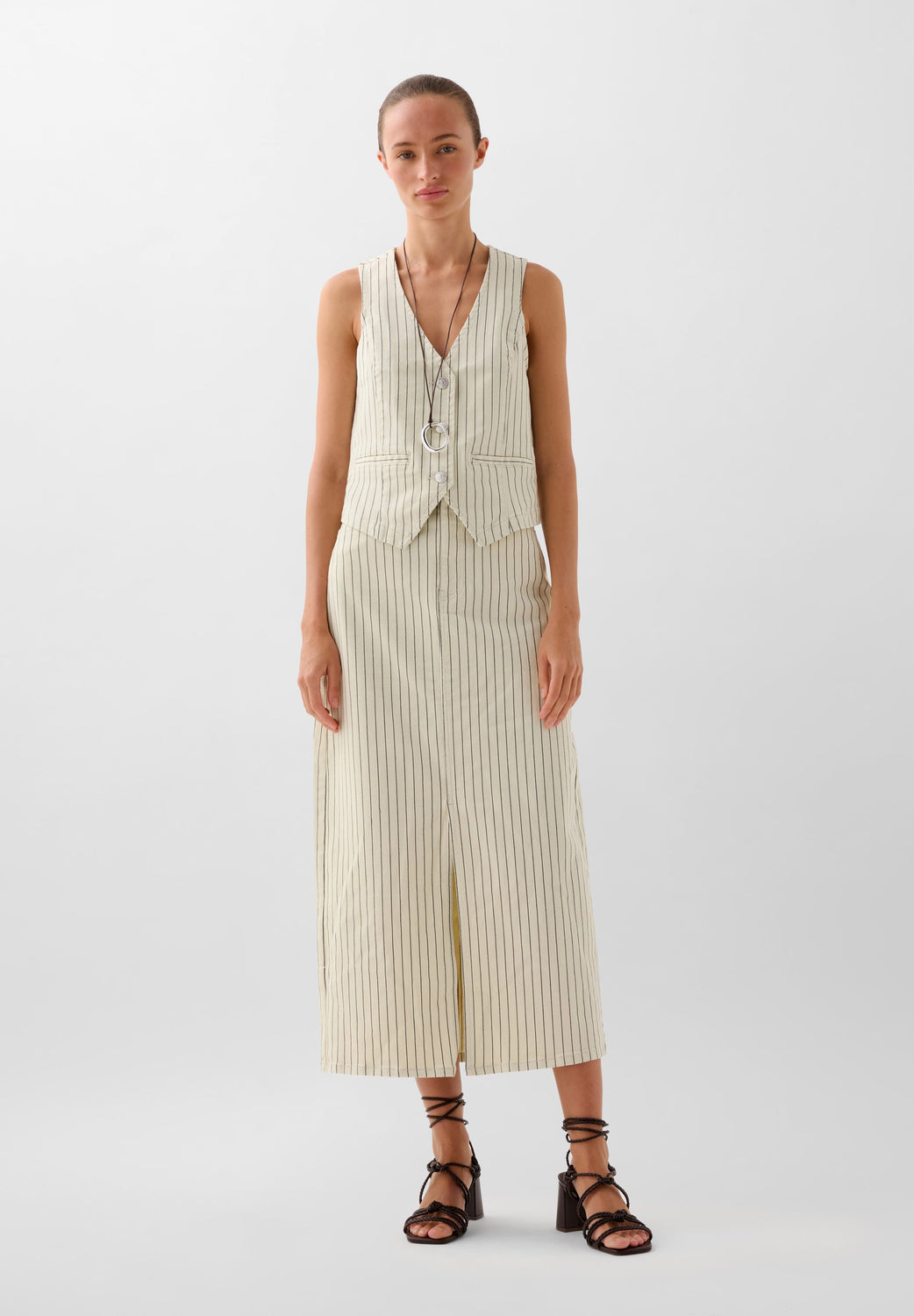Falda denim confeccionada en mezcla de algodón y elastano con estampado de rayas. Cierre de cremallera y botón con bolsillos inclinados frontales. Abertura frontal.
