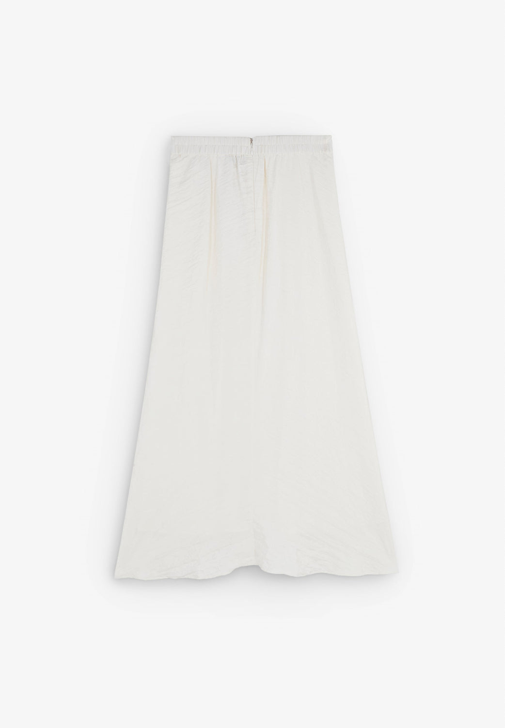 Falda midi textura con ajuste elástico en cintura y cierre oculto con cremallera en la parte trasera.