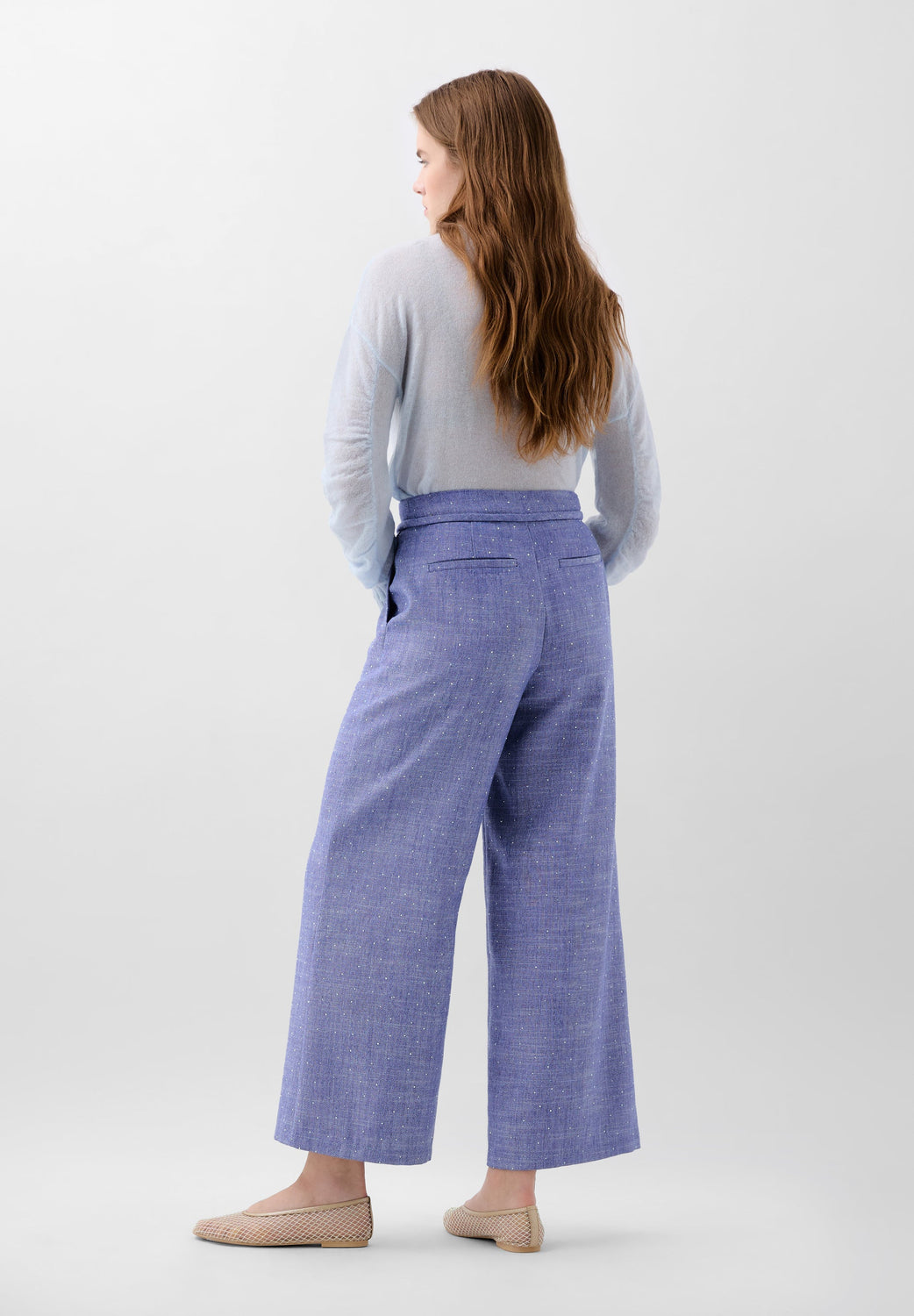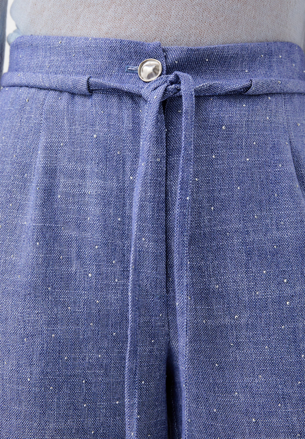 Pantalón confeccionado en mezcla de algodón y lino con detalles de strass. Corte culotte, regular fit, con cierre de cremallera y botón con detalle ajustable de cuerda. Bolsillos de pliegue laterales.