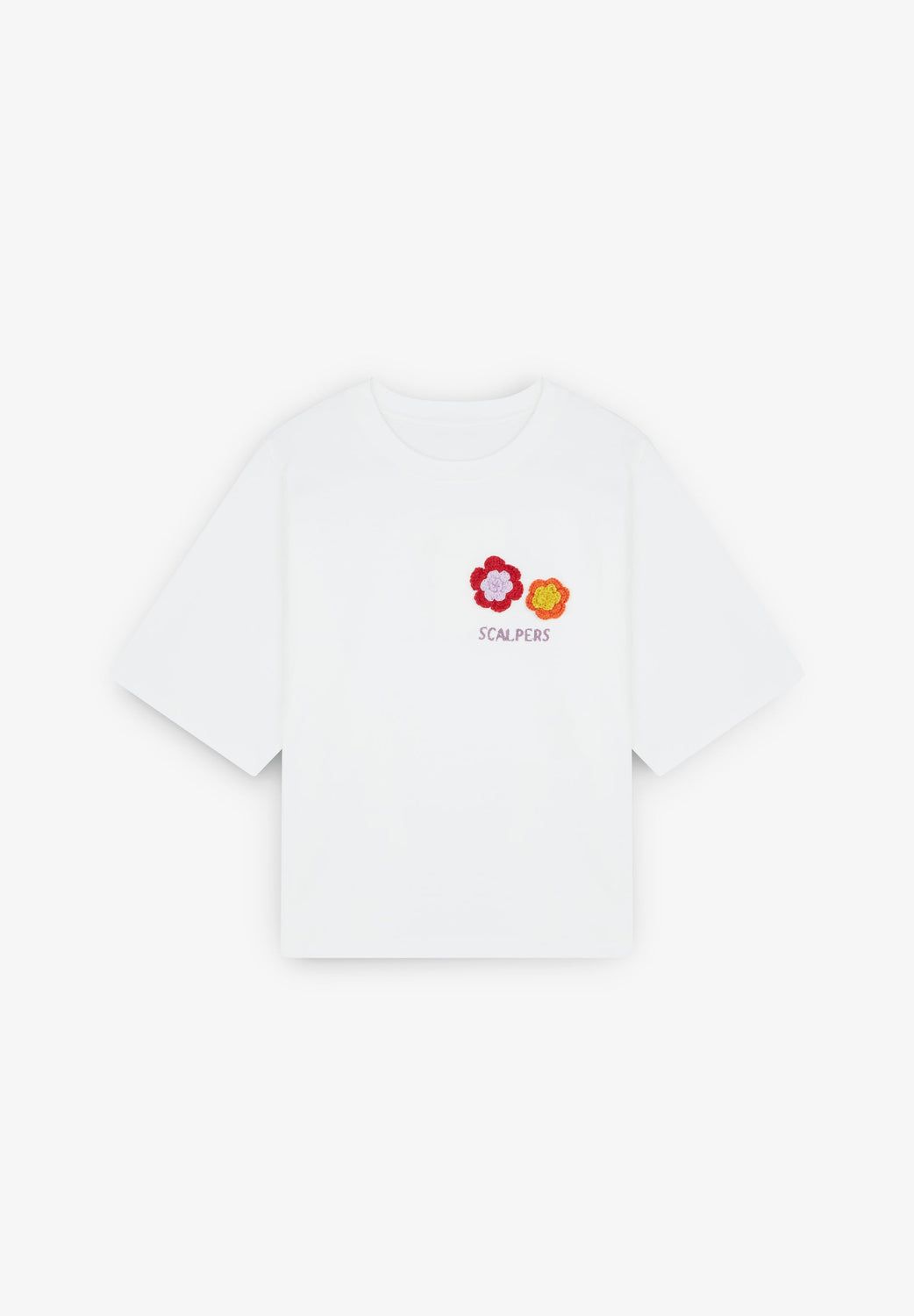 Camiseta confeccionada en 100% algodón con detalle de crochet y logo bordado en pecho. Corte ligeramente oversize, cuello redondo y manga corta ancha.