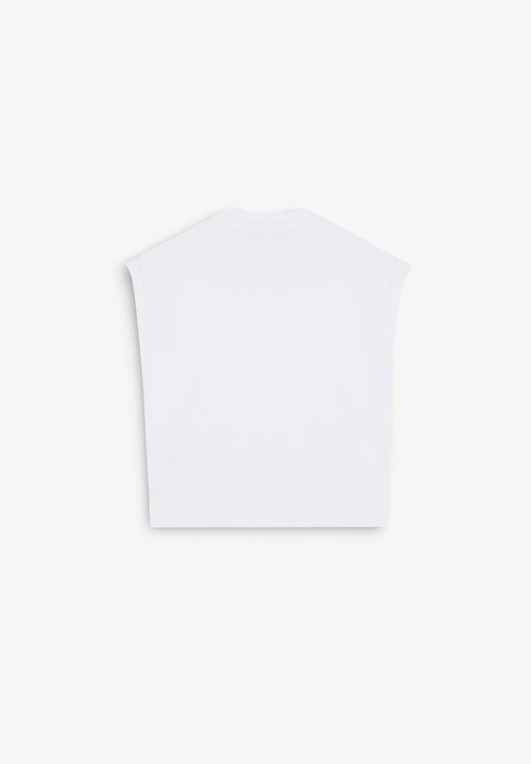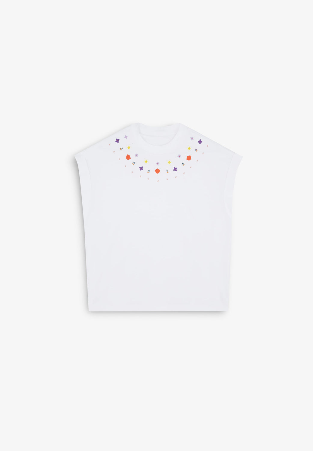 Top confeccionado en algodón. Corte cropped con cuello ligeramente subido y detalles bordados multicolor. Manga en sisa.