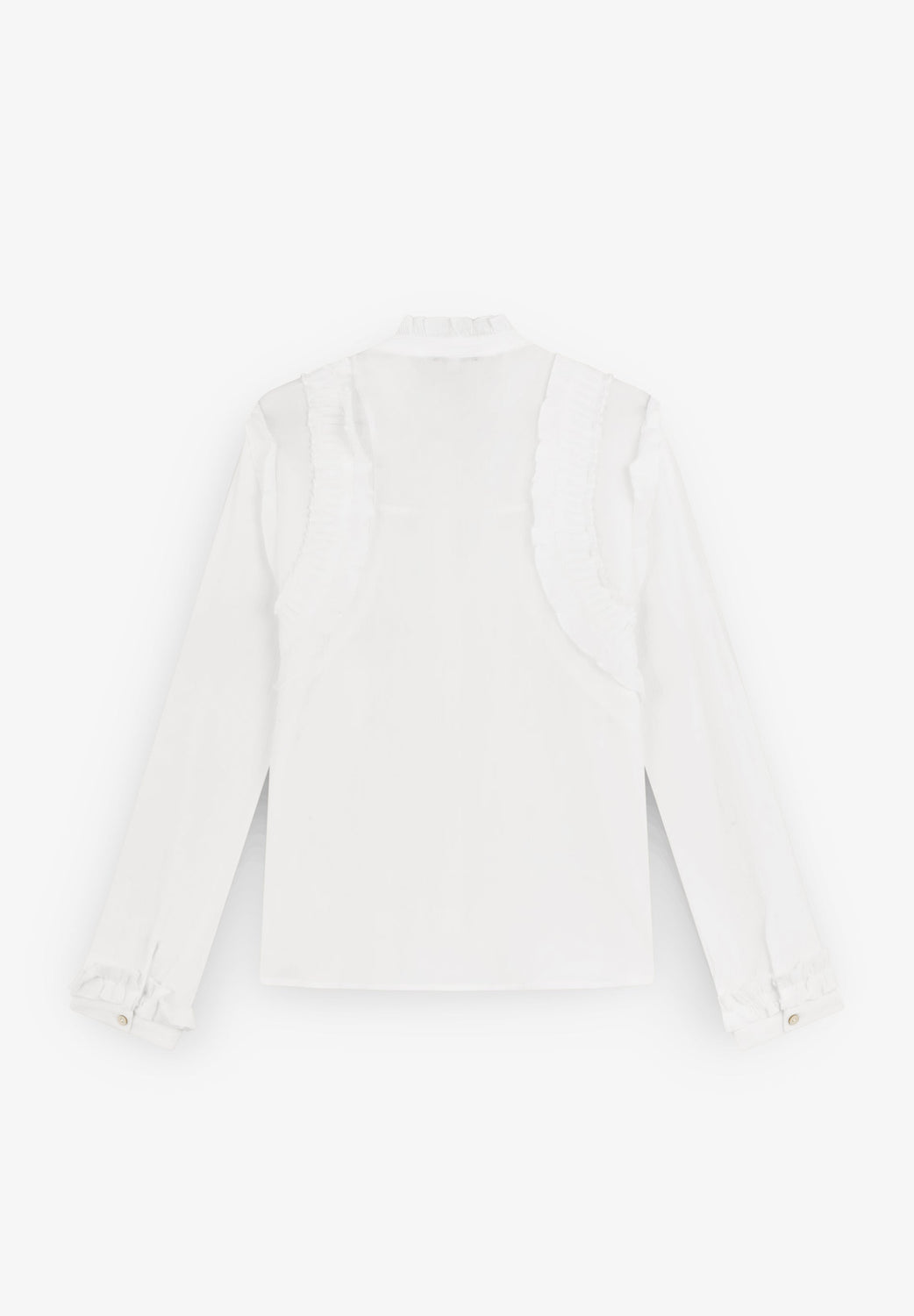Camisa confeccionada en 100% algodón. Corte regular fit, cuello subido con detalles de frunces. Cierre con botones. Manga larga con detalle de botón en puño.
