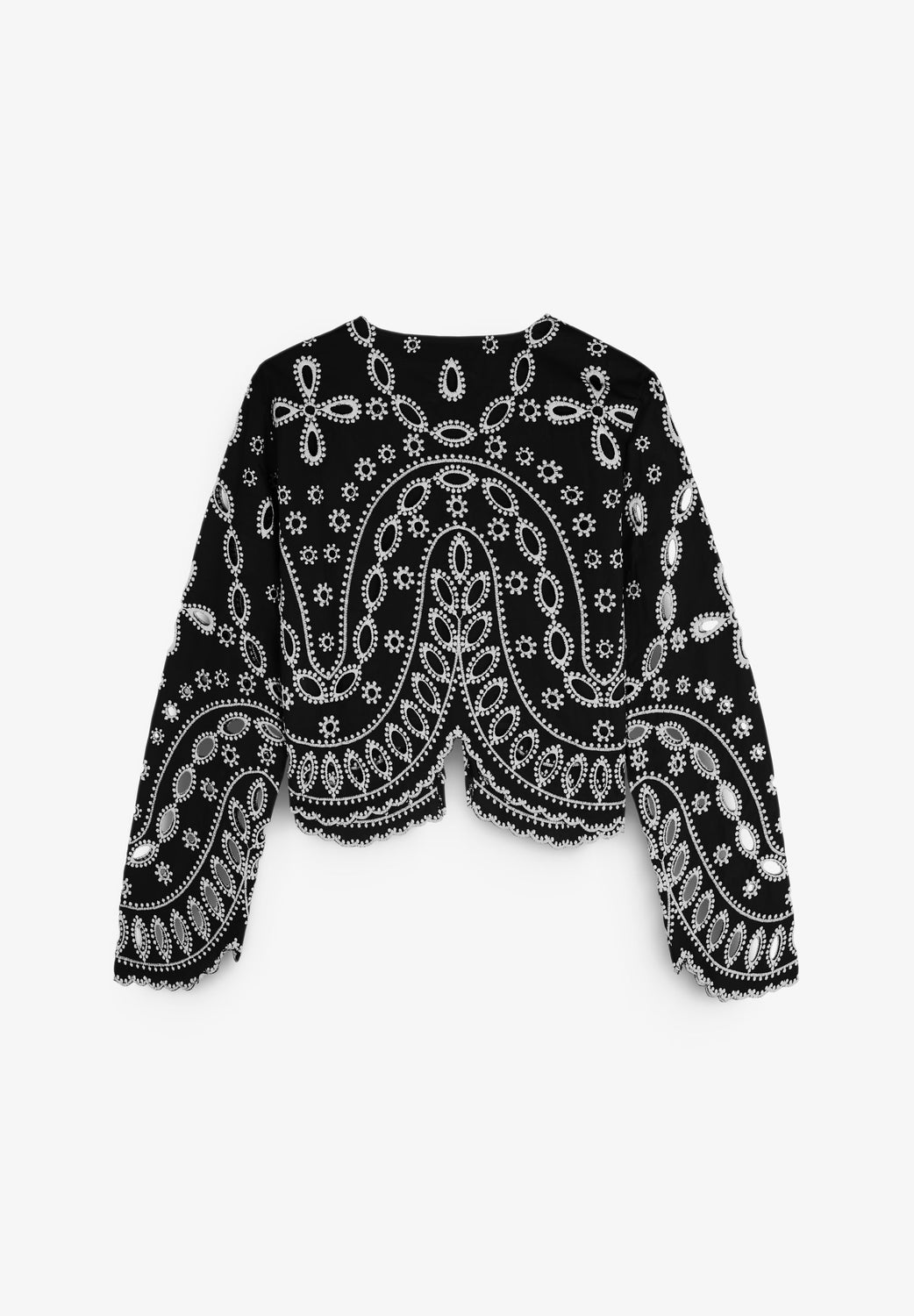Camisa confeccionada en 100% algodón con bordados a contraste. Corte regular fit, cuello redondo y manga larga ligeramente acampanada. Cierre con lazos frontales.