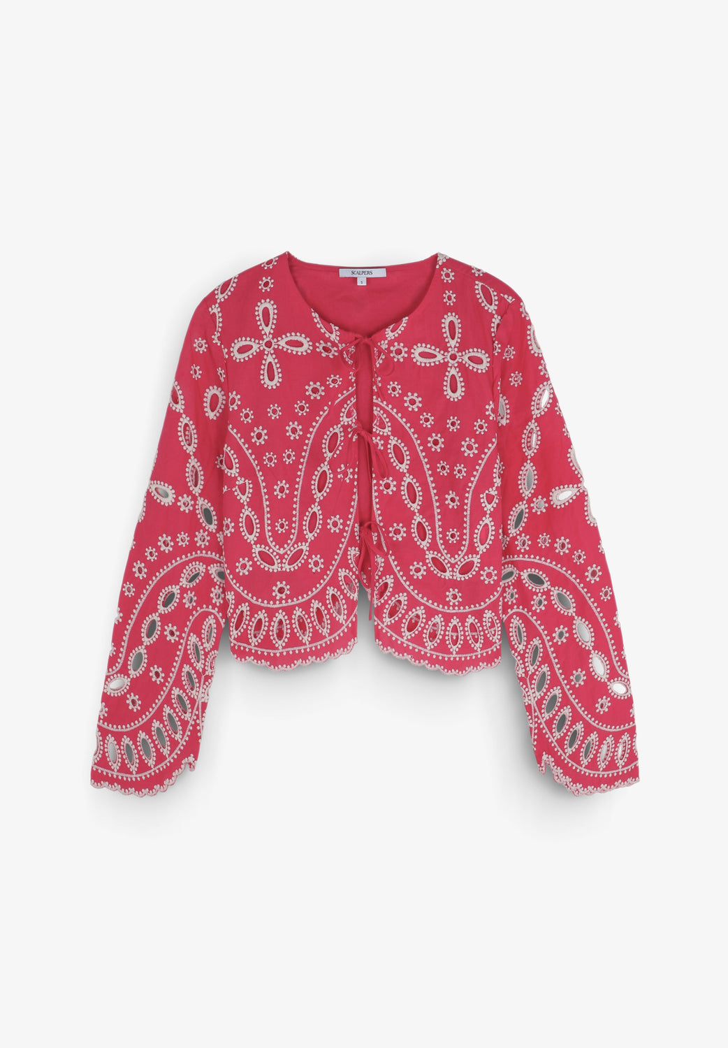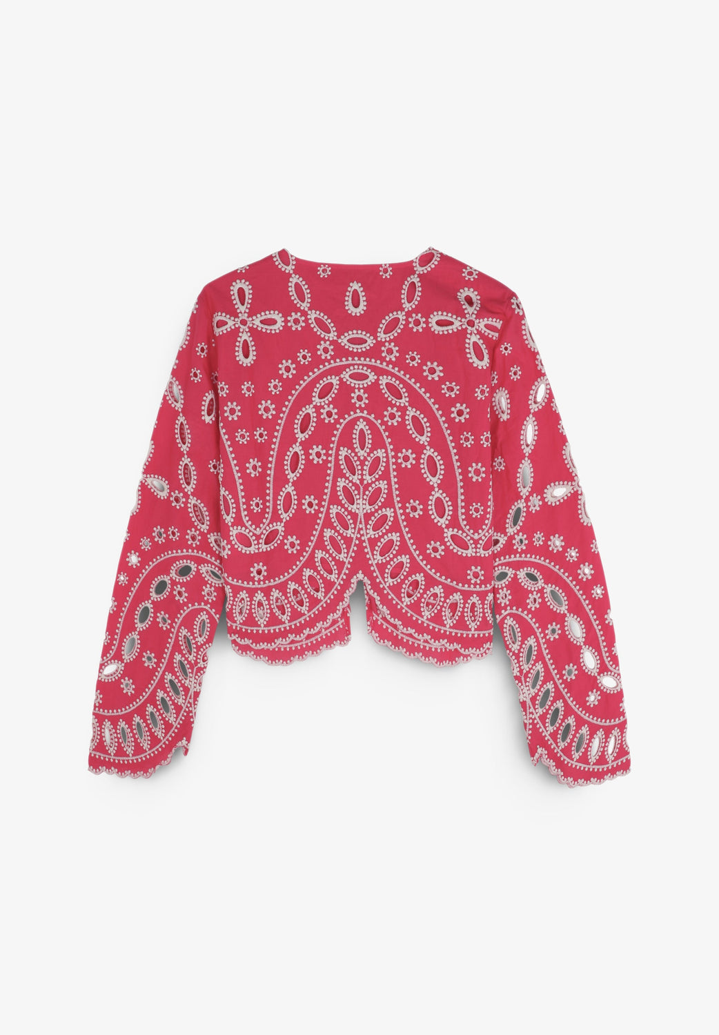Camisa confeccionada en 100% algodón con bordados a contraste. Corte regular fit, cuello redondo y manga larga ligeramente acampanada. Cierre con lazos frontales.