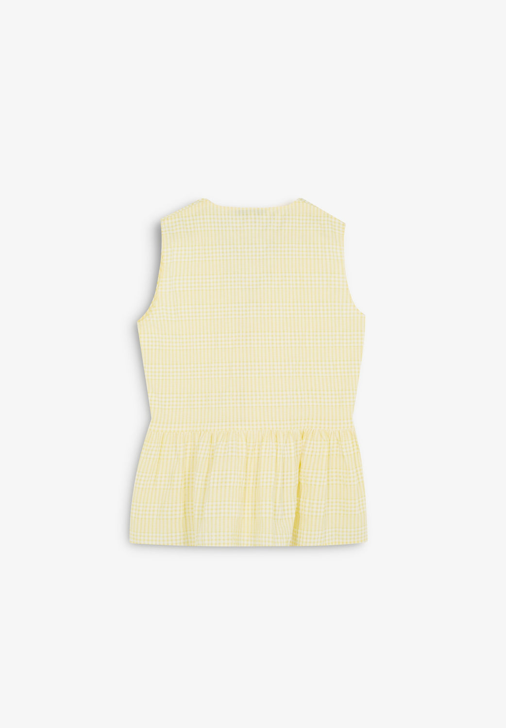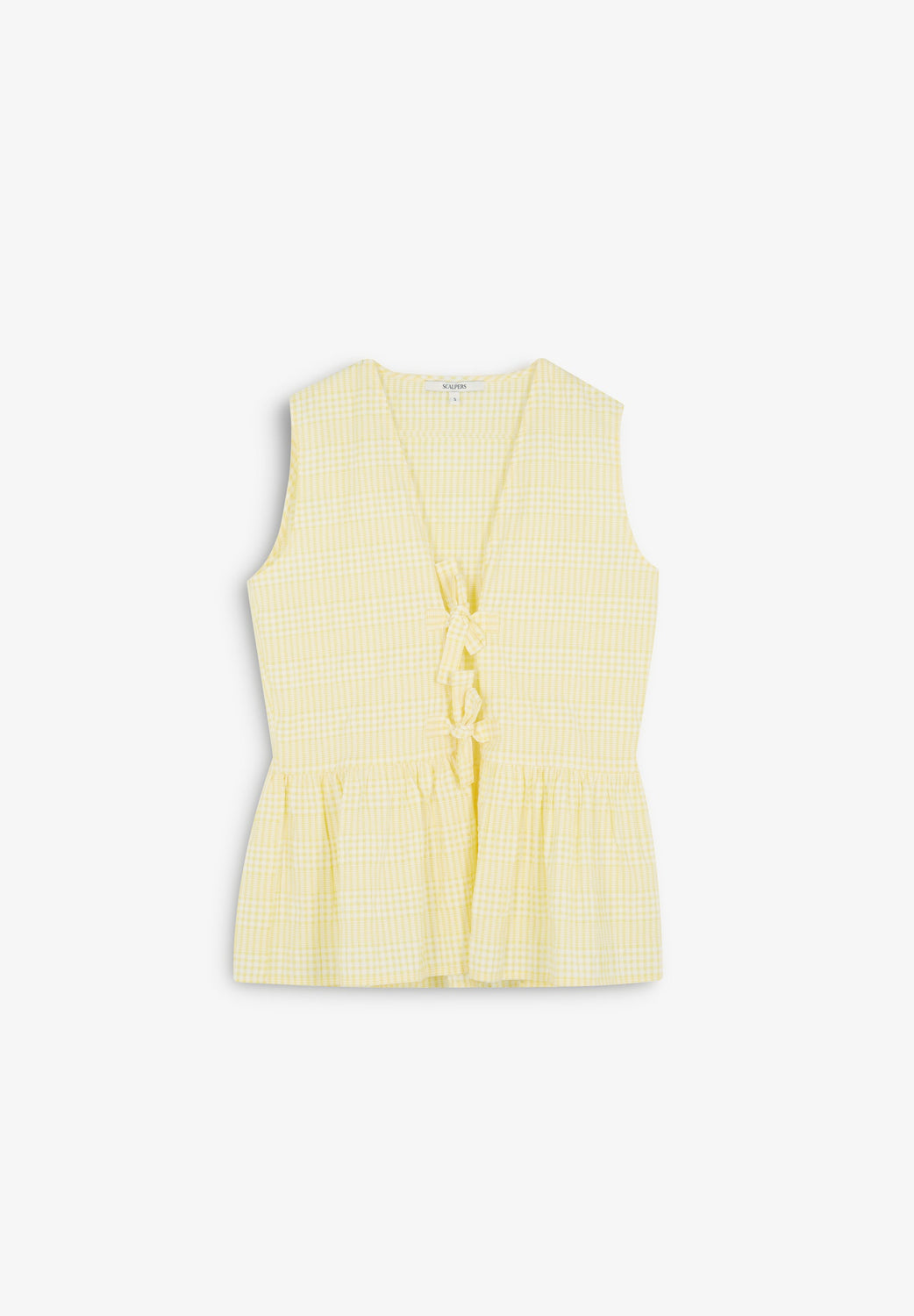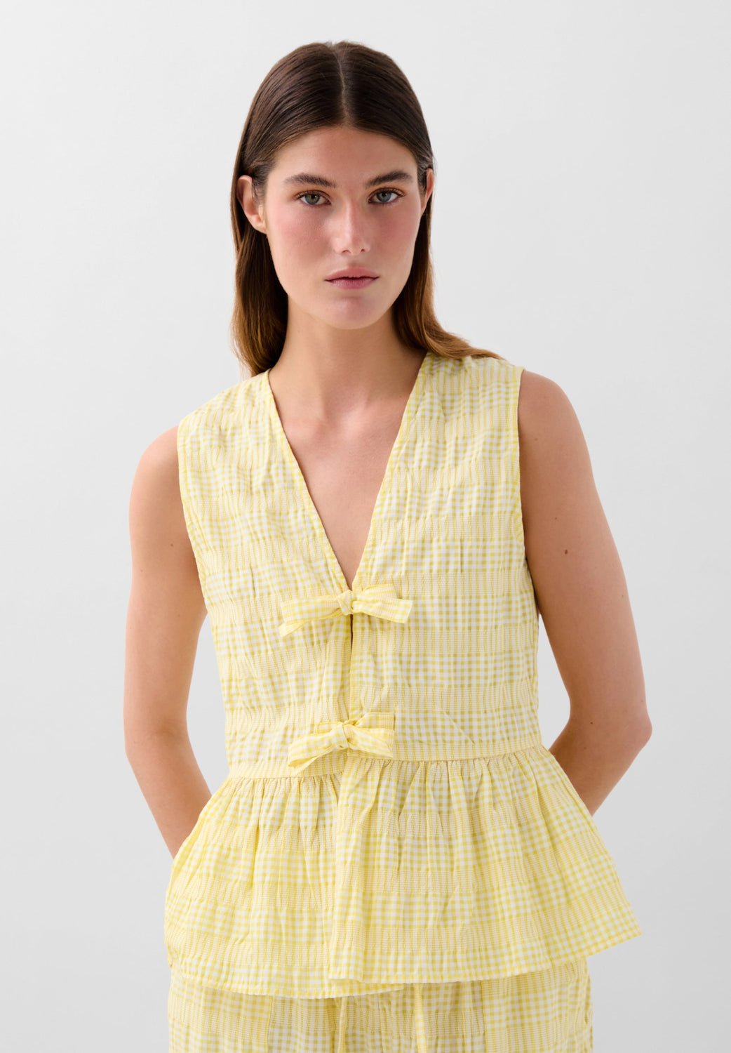 Top confeccionado en mezcla de algodón con estampado de vichy. Corte regular fit, escote en V y lazos frontales. Manga en sisa y volante en el bajo.