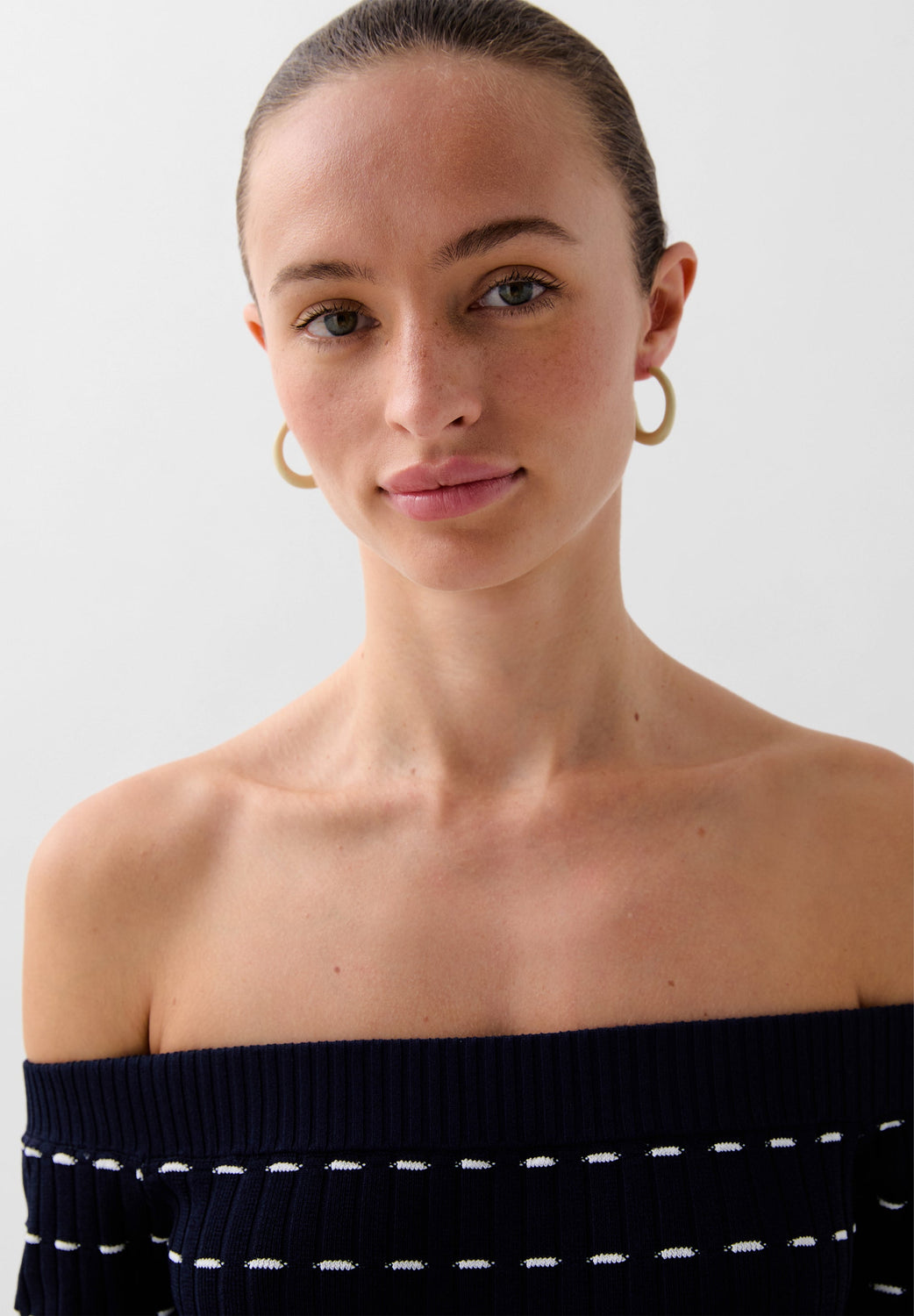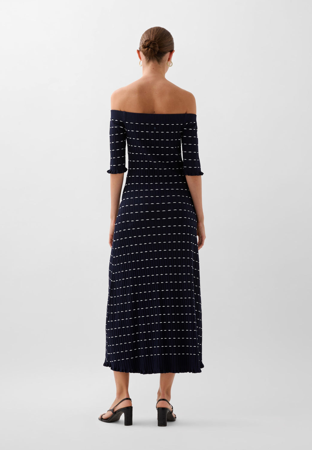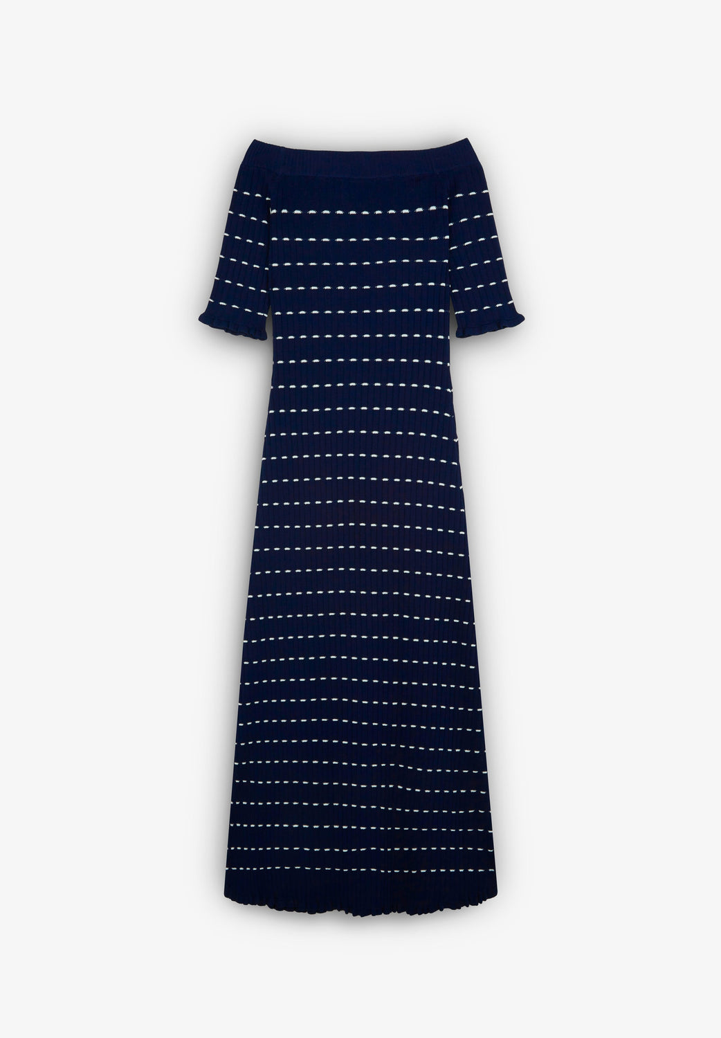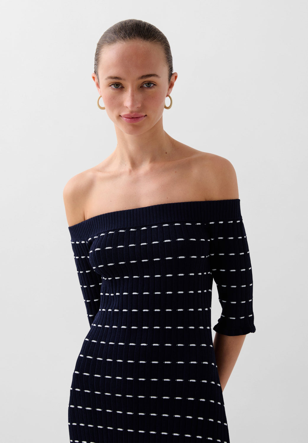 Vestido de rayas confeccionado en punto ligeramente elástico. Corte midi, hombros descubiertos y manga francesa acabada en detalle de volante.