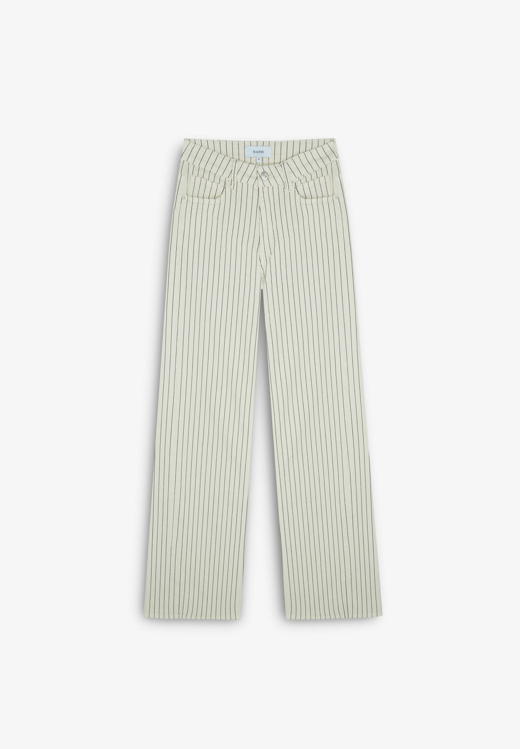Pantalón vaquero de tiro alto confeccionado en 98% Algodón Orgánico BCI. Cierre por botón y cremallera. Dos bolsillos en frontal. Dos bolsillos en espalda. Estampado rayas. Regular Fit.