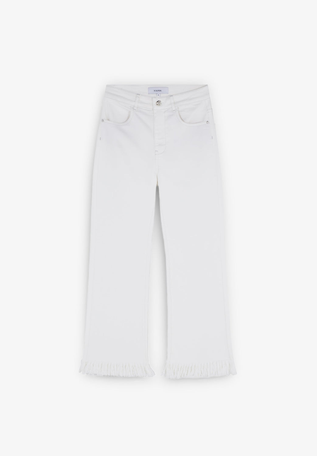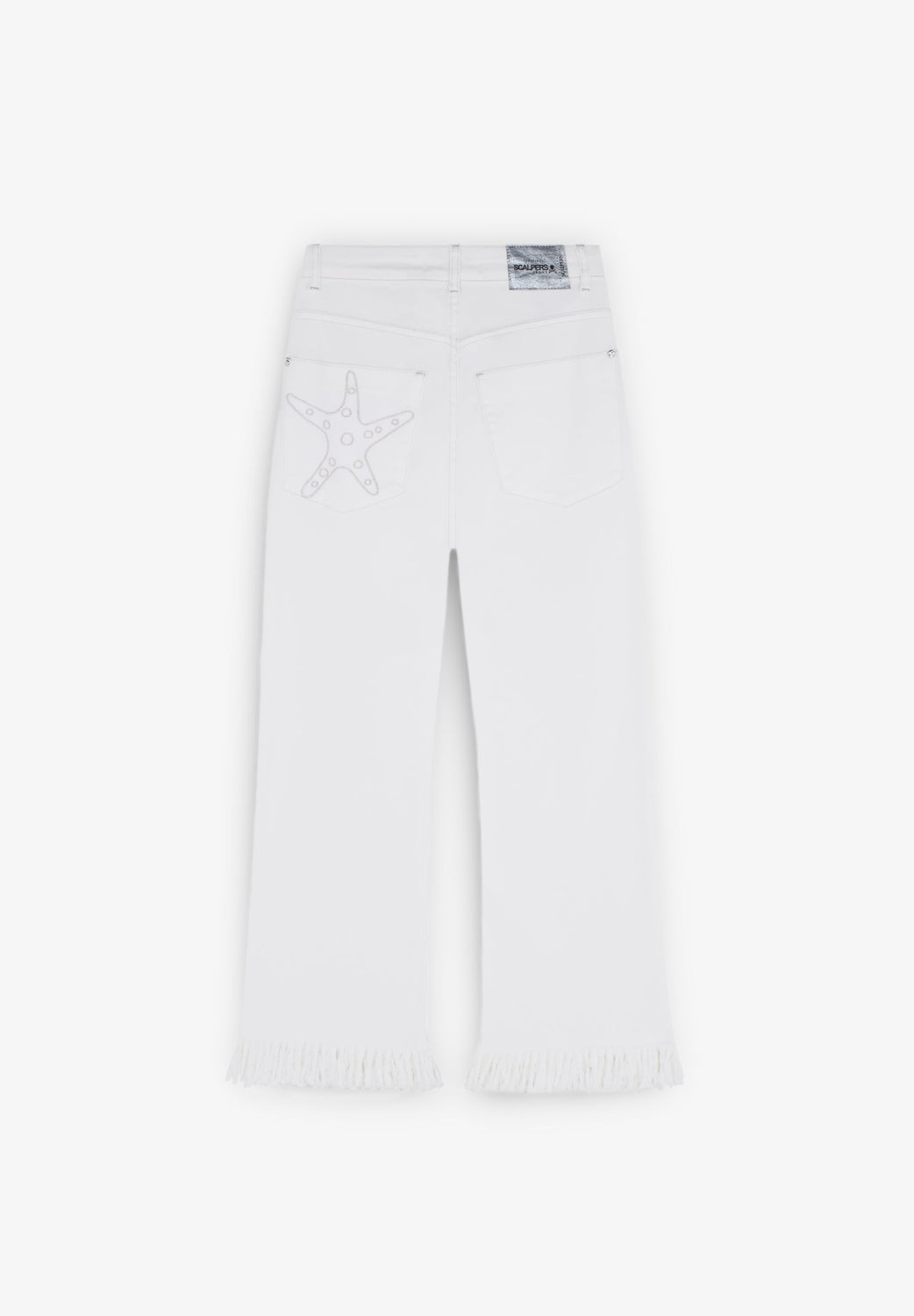 Pantalón denim confeccionado en mezcla de Algodón. Dos bolsillos en frontal. Dos bolsillos posteriores con detalle print bordado. Motivo desflecado en bajos. Cierre mediante botón y cremallera.