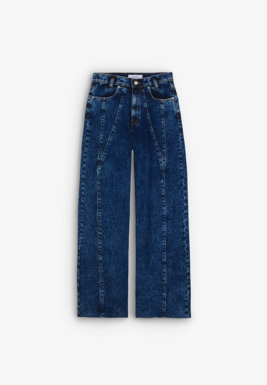Jeans confeccionados en 100% Algodón. Culotte. Cuatro bolsillos. Pernera ancha. Detalle de costuras. Cierre frontal con cremallera y botón.