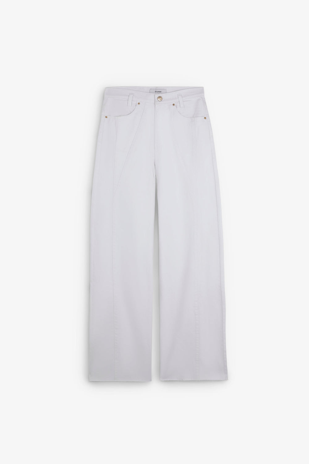 Jeans confeccionados en 100% Algodón. Culotte. Cuatro bolsillos. Pernera ancha. Detalle de costuras. Cierre frontal con cremallera y botón.