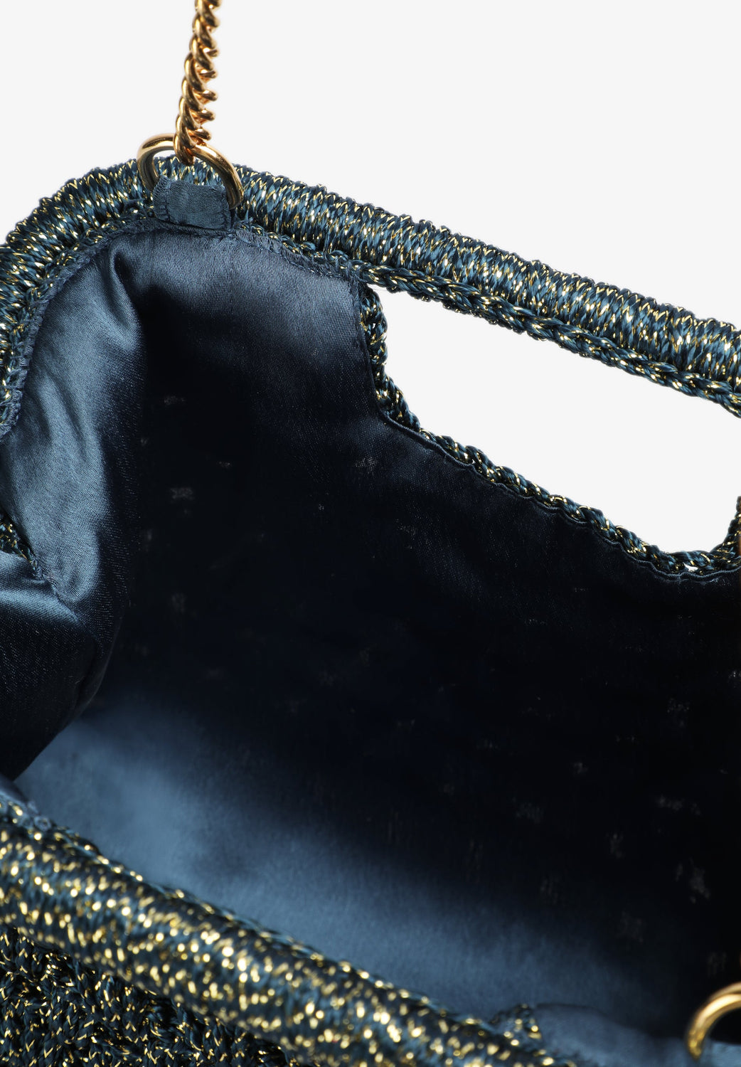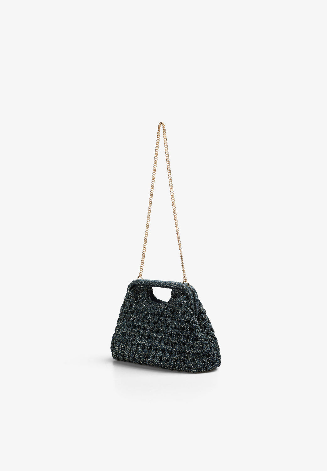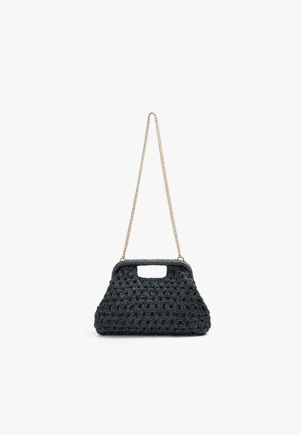 Bolso confeccionado en crochet con hilo metalizado. Forro interior, asa de mano y cadena desmontable.