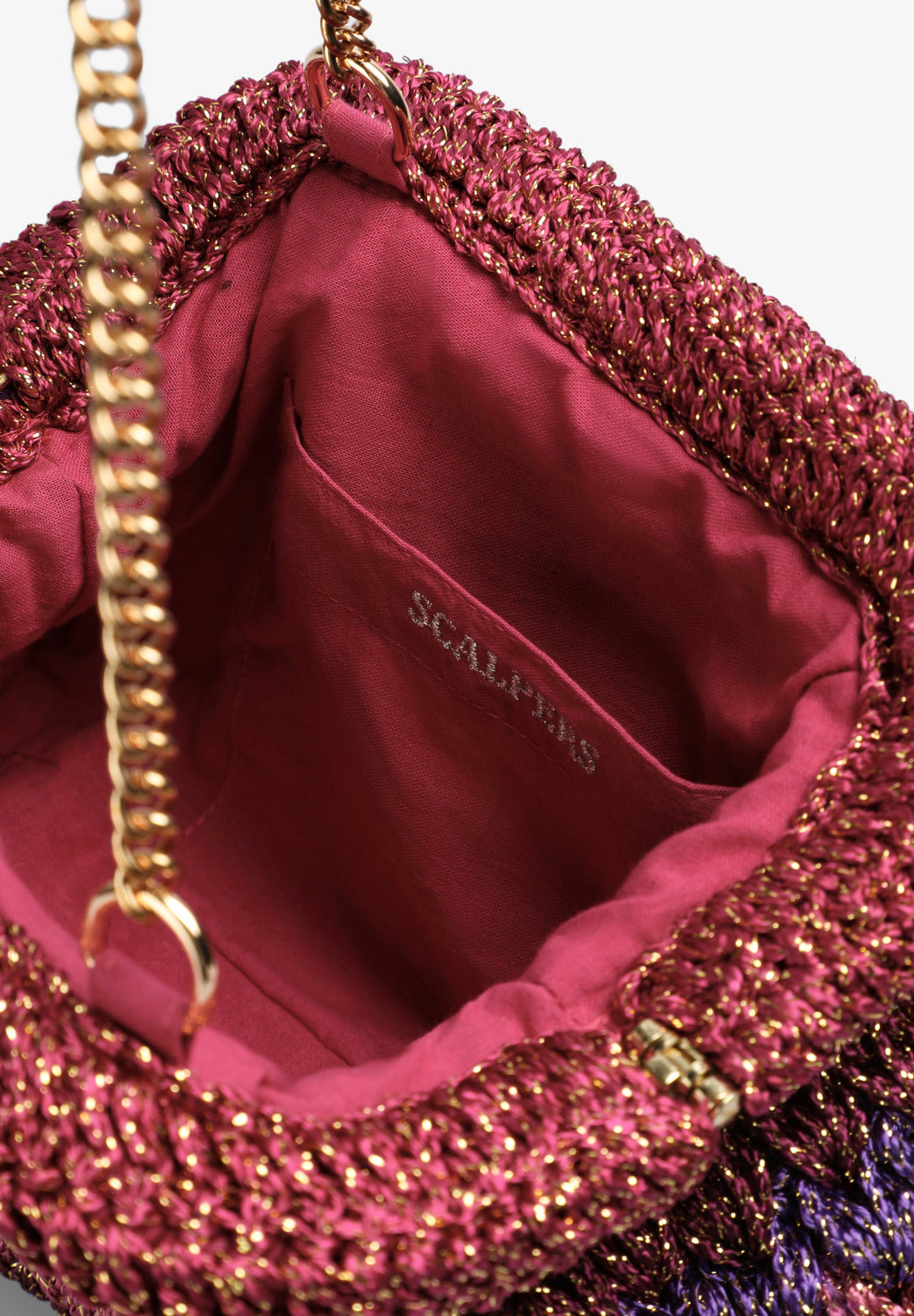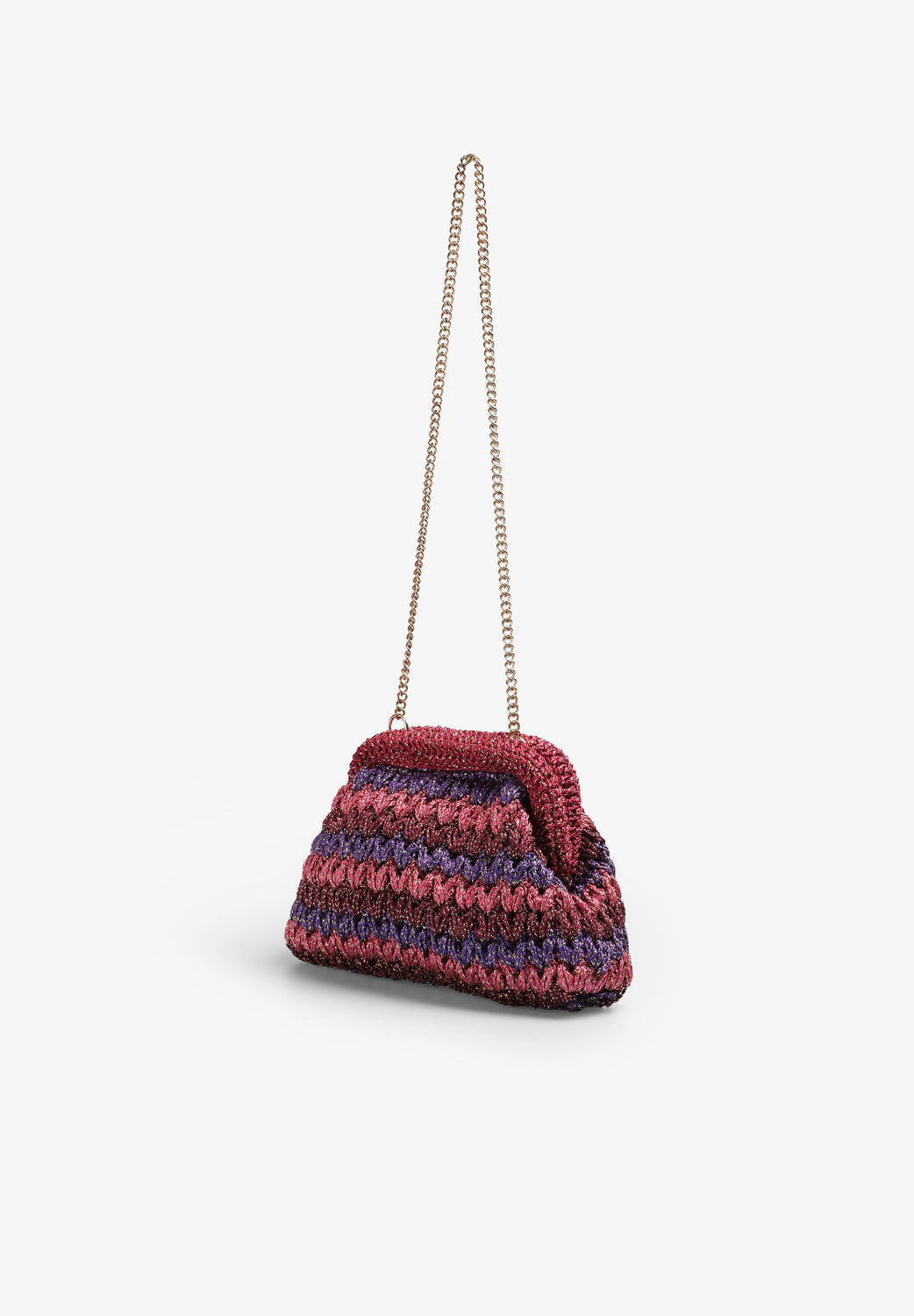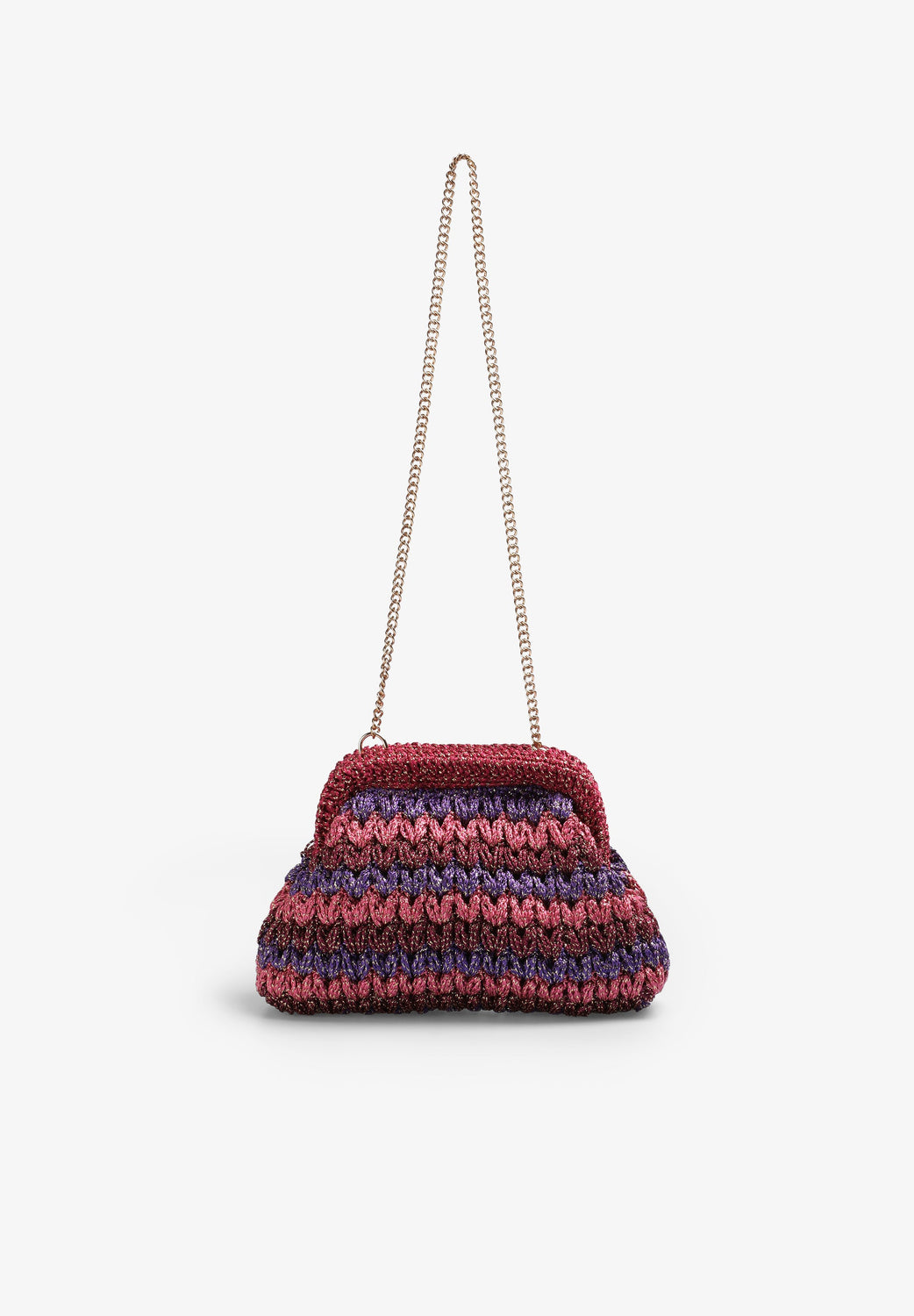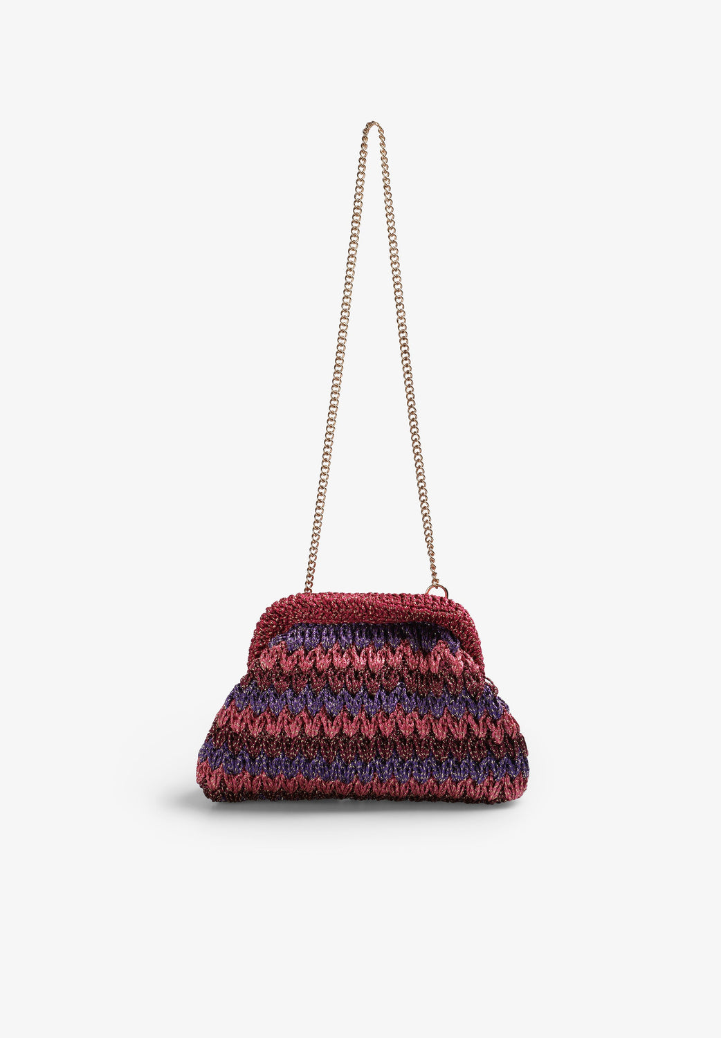 Bolso confeccionado en crochet con hilo metalizado. Forro interior y cadena desmontable.