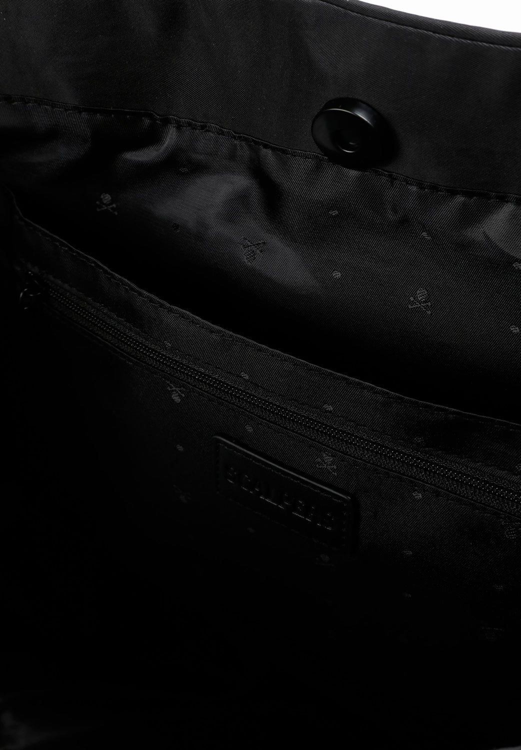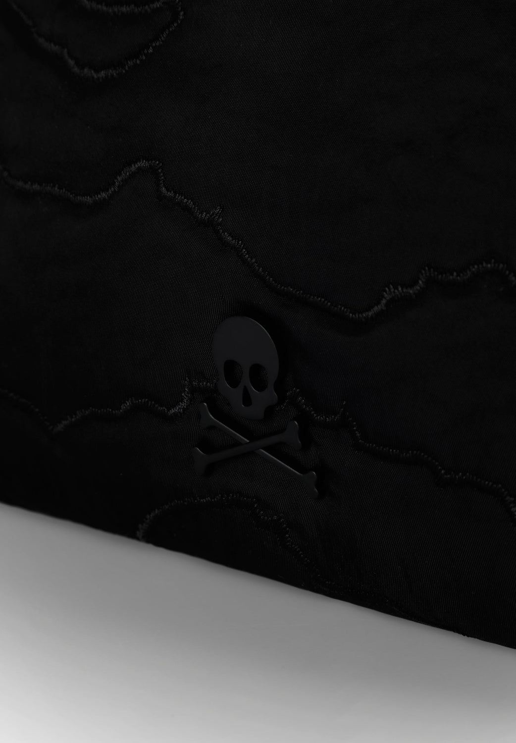 Bolso shopper acolchado confeccionado en nylon. Doble asa y cierre con snaps. Parche de calavera.