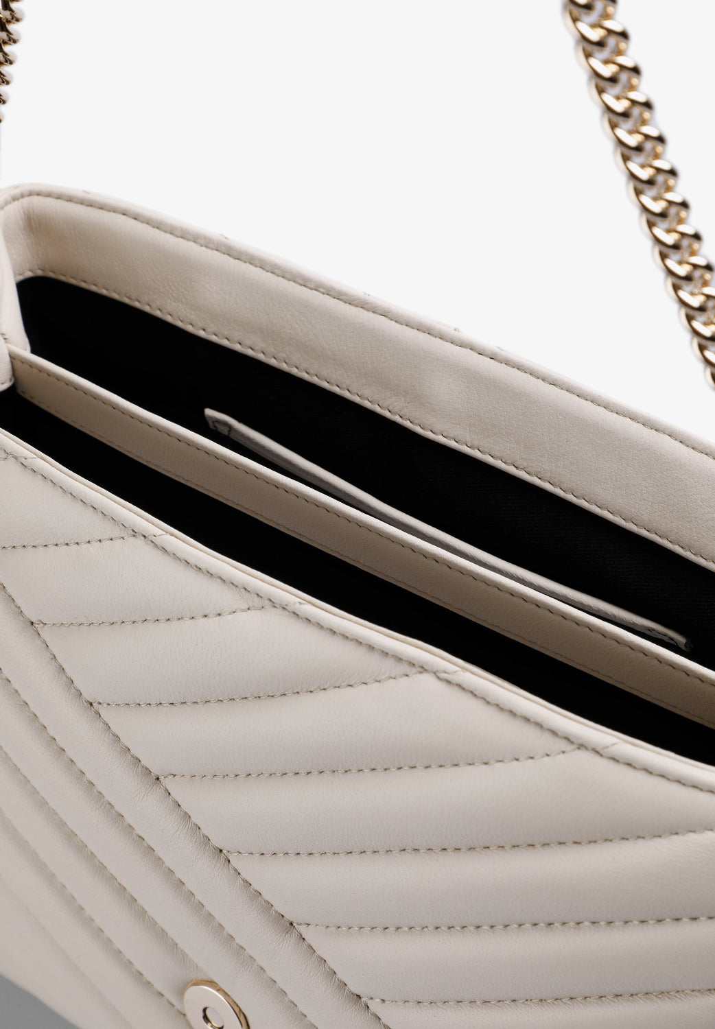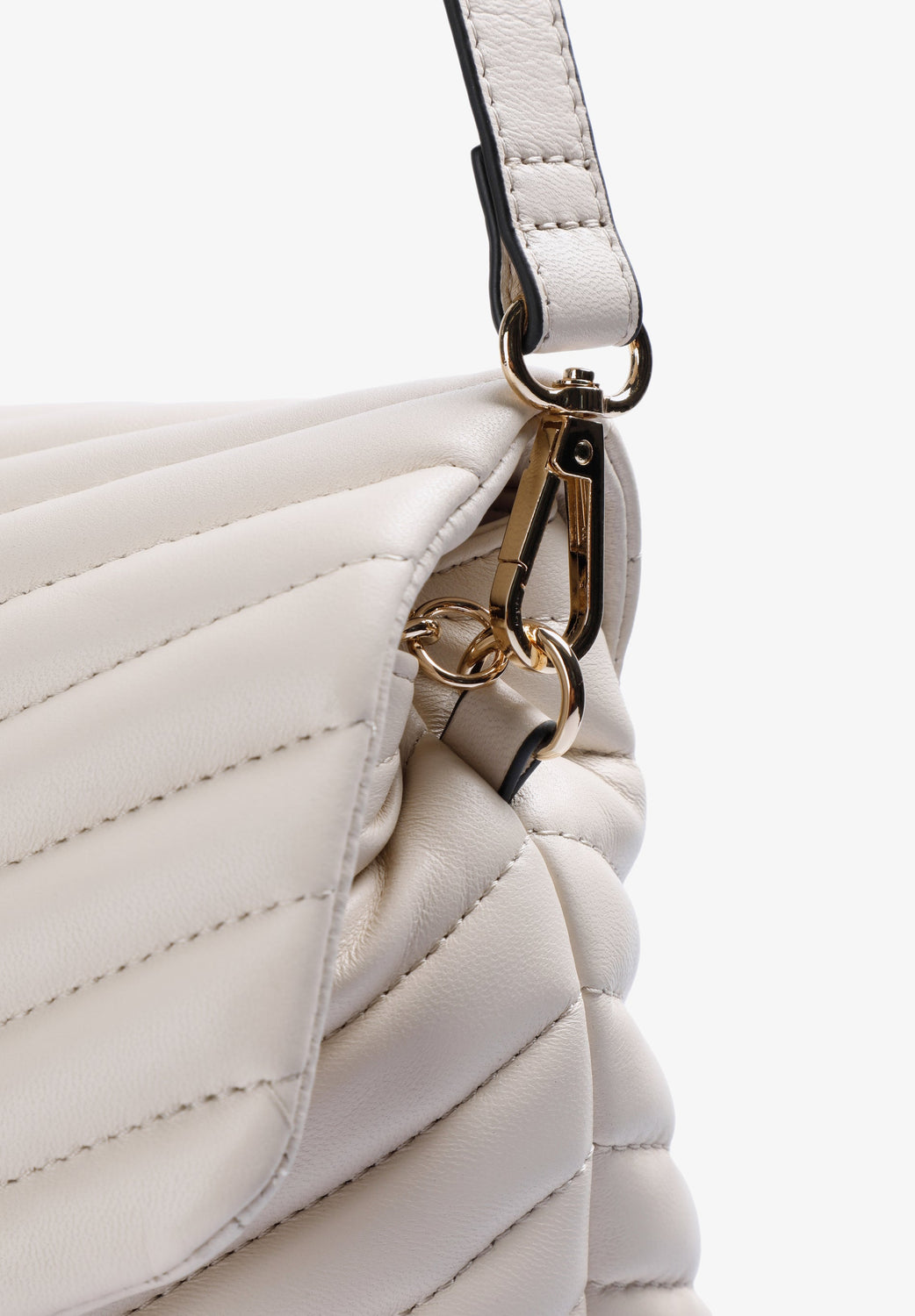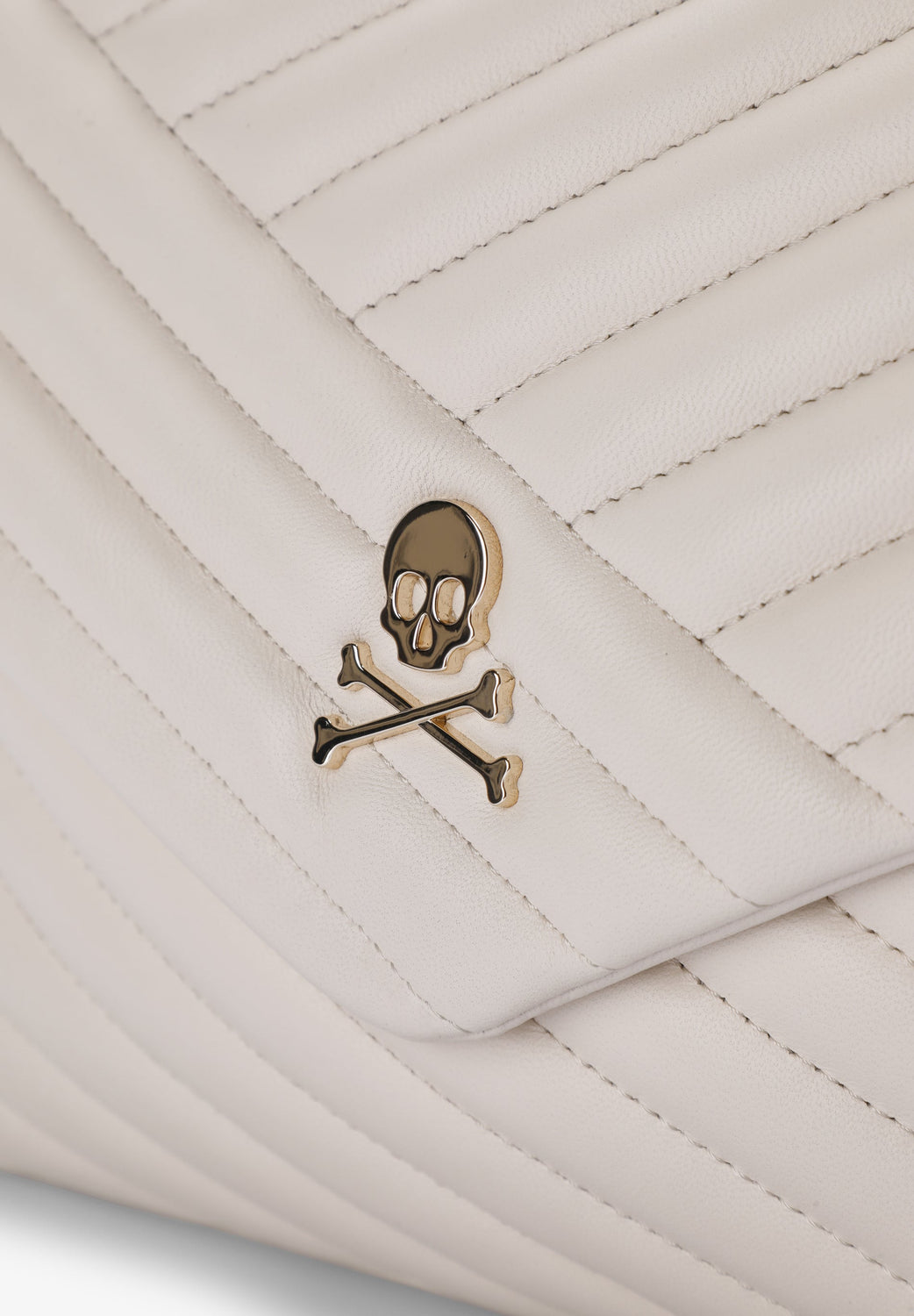 Bolso confeccionado en 100% piel. Asa ajustable.. Cierre por botón a presión. Bolsillos interiores con cremallera. Detalle de logo en cierre frontal.