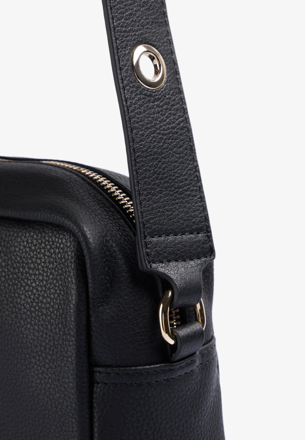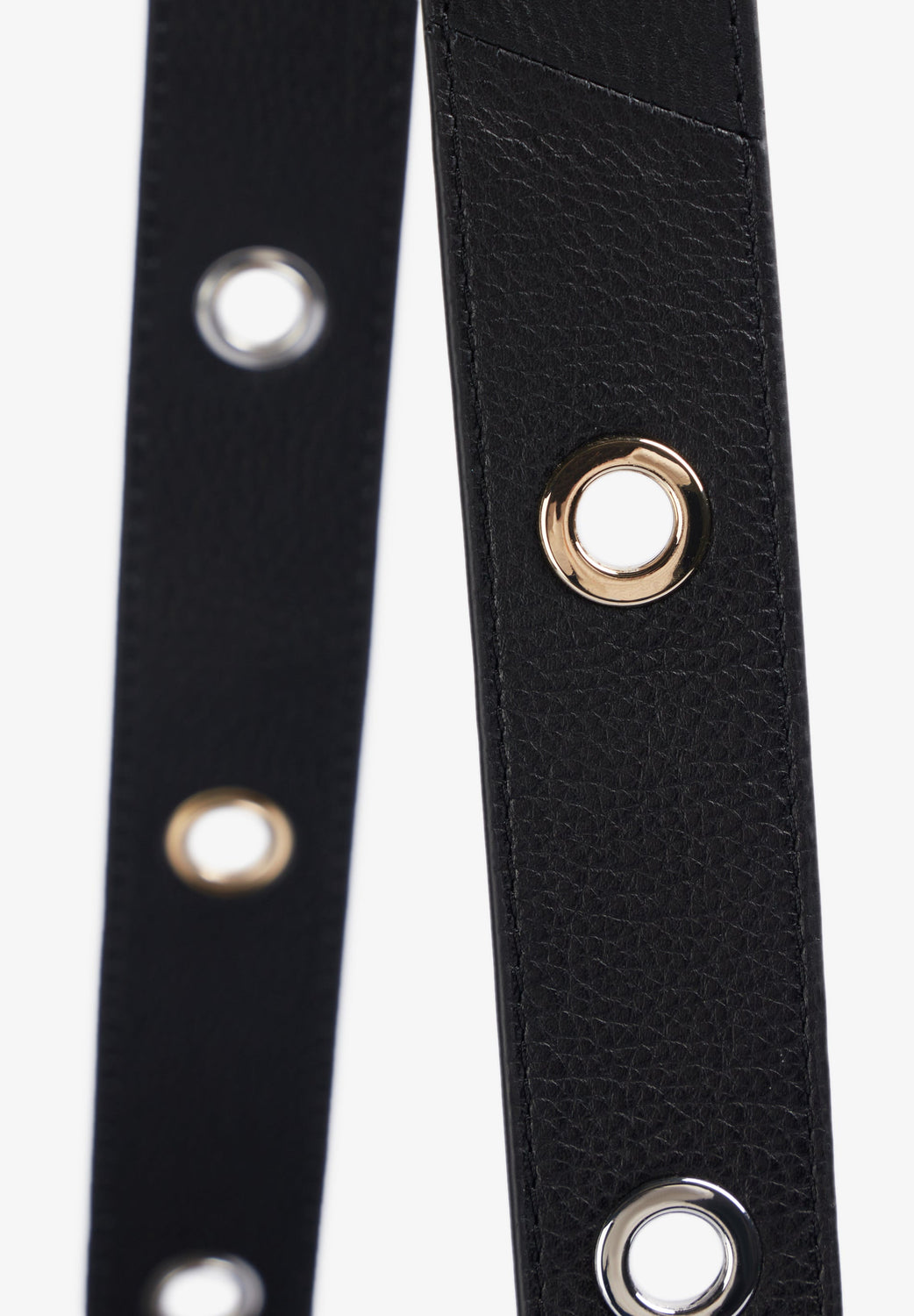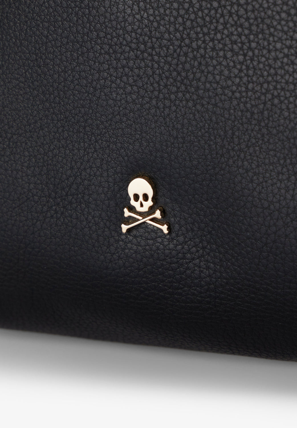 Bolso tipo bandolera con detalles perforados y calaveras. Confeccionado en 100% piel. Cierre con cremallera metálica. Asa larga. Logo metálico frontal. Bolsillo interior y exterior trasero.