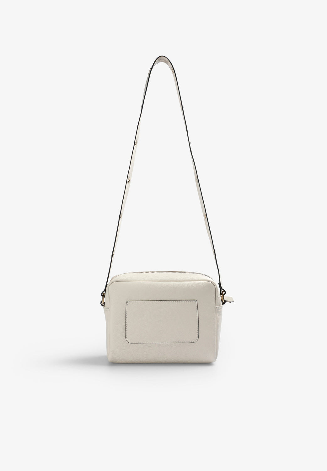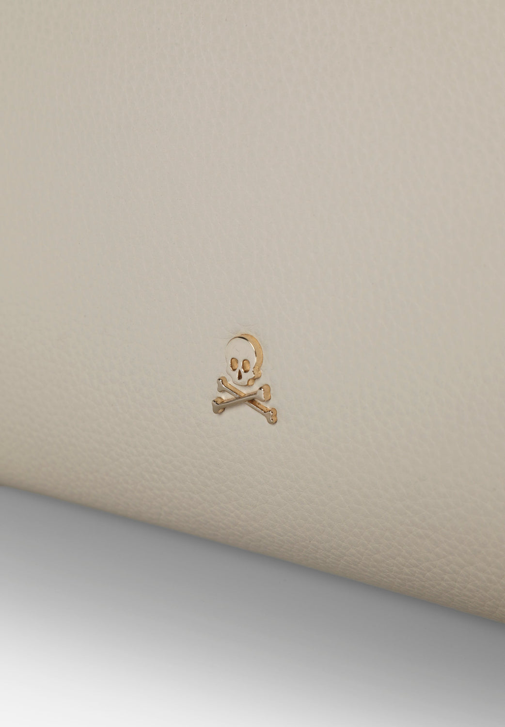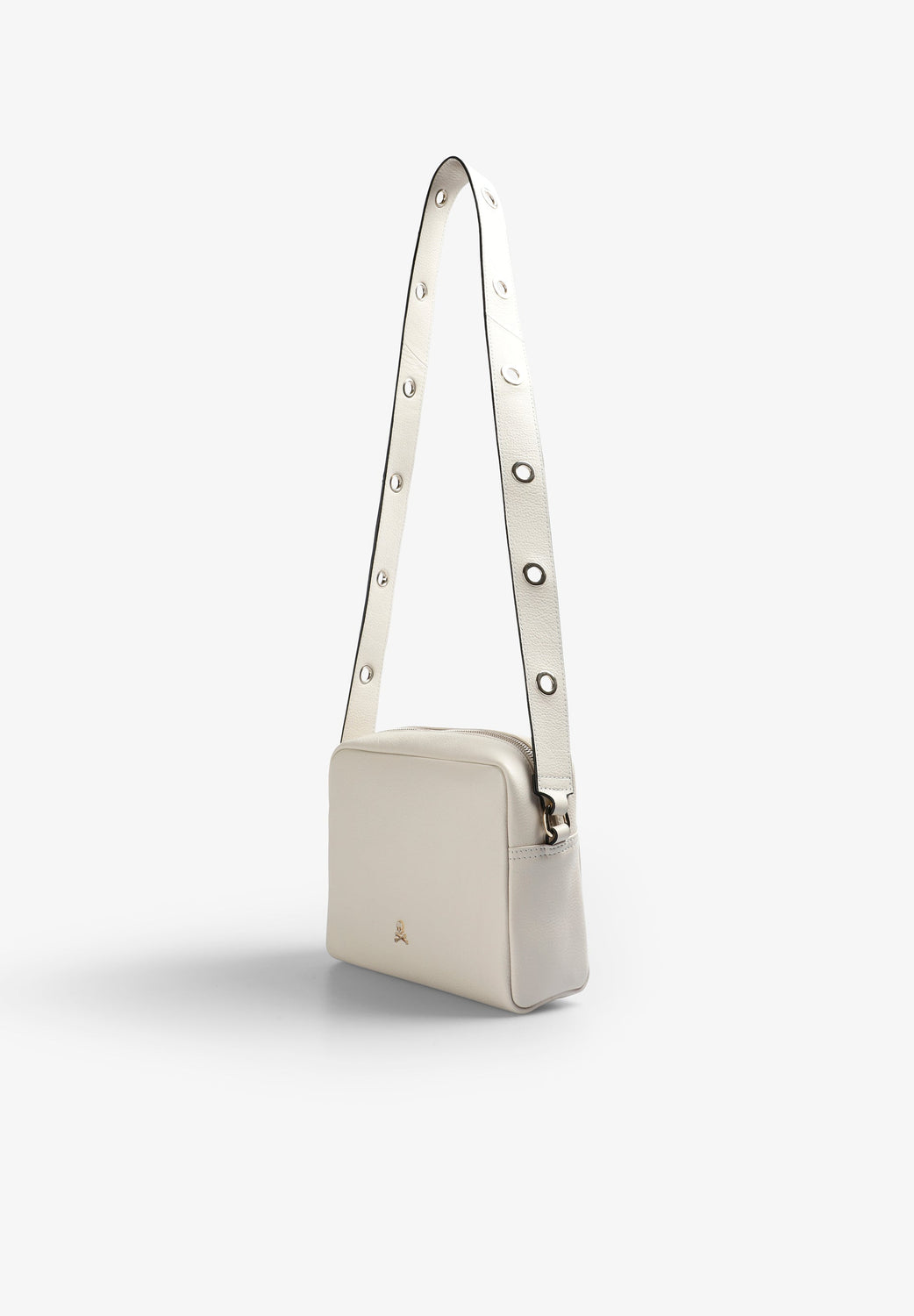 Bolso tipo bandolera con detalles perforados y calaveras. Confeccionado en 100% piel. Cierre con cremallera metálica. Asa larga. Logo metálico frontal. Bolsillo interior y exterior trasero.
