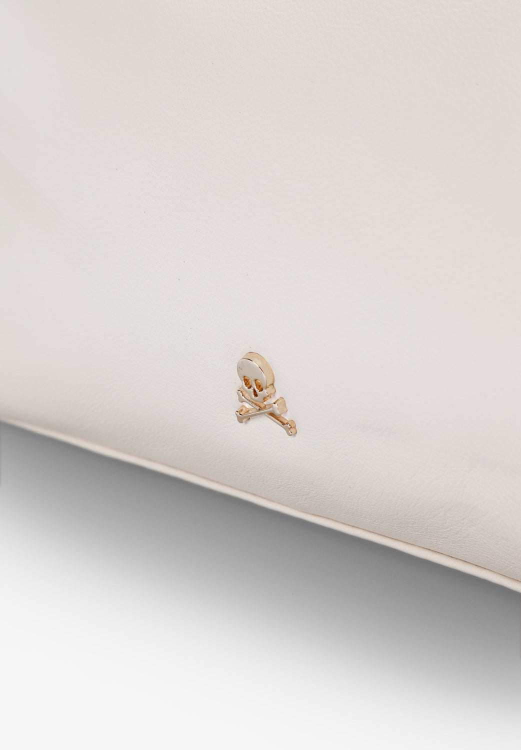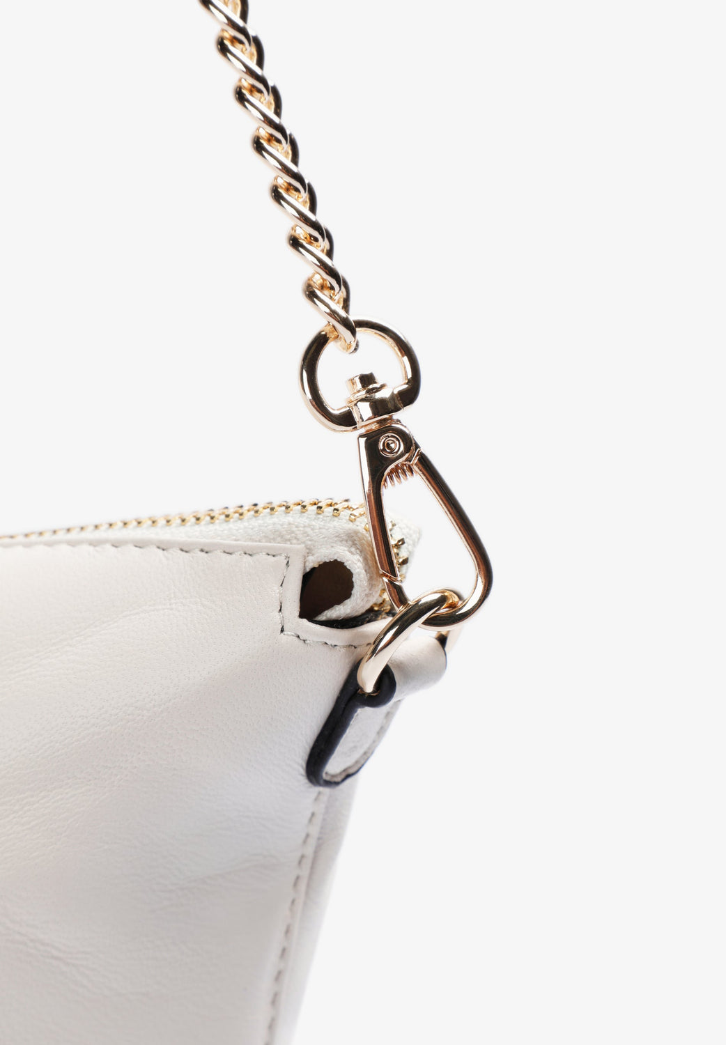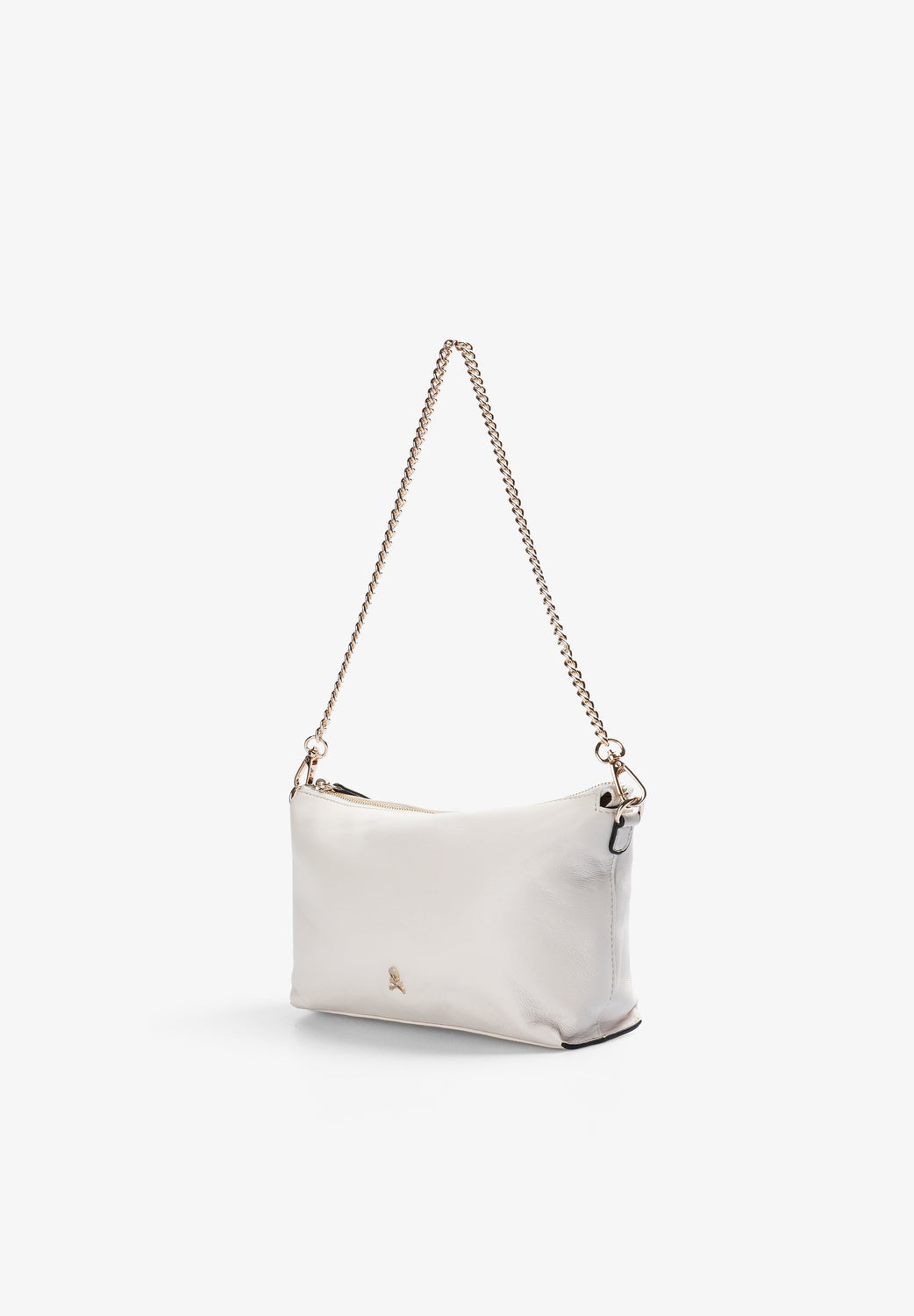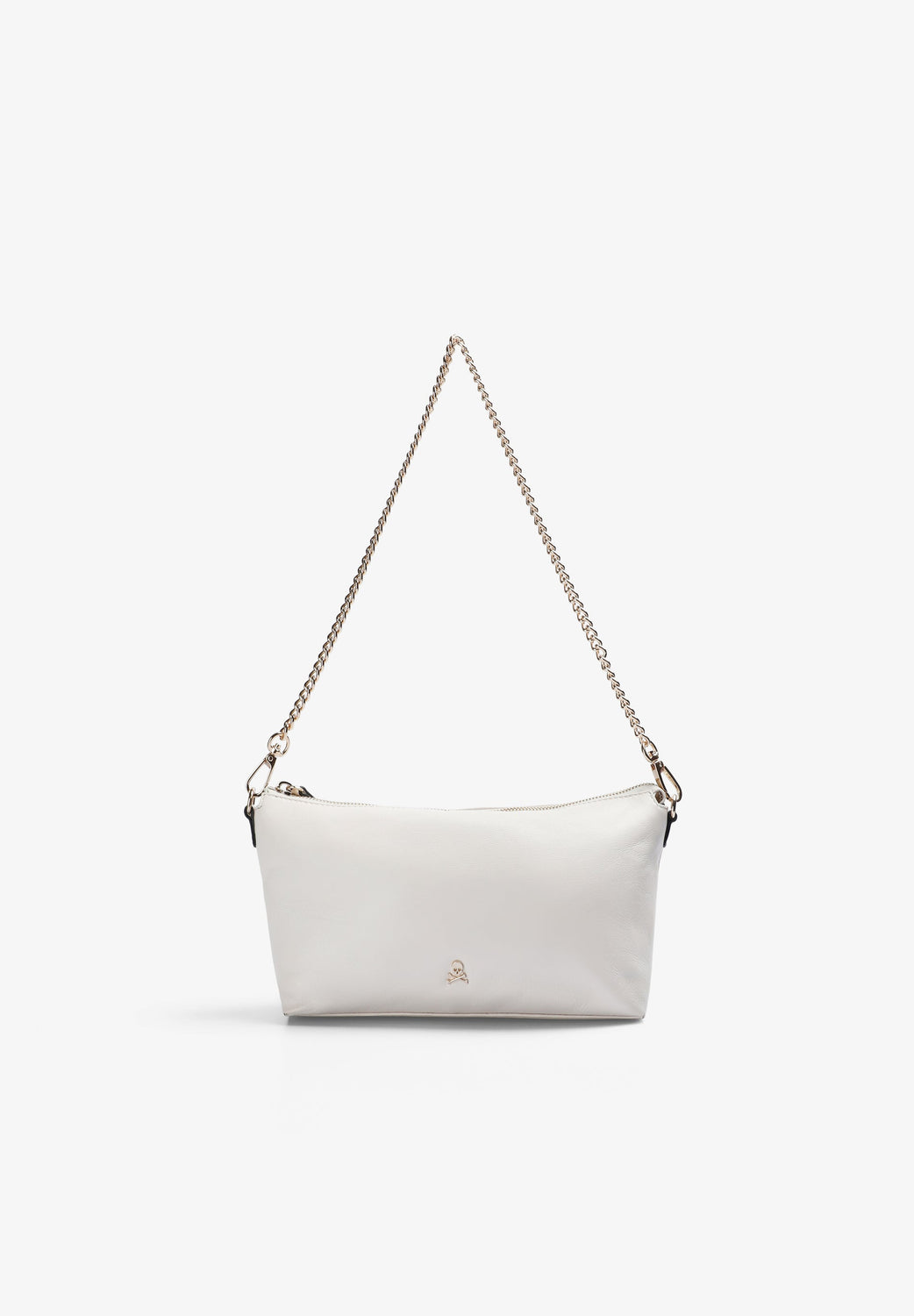 Bolso confeccionado en 100% piel. Cierre con cremallera y asa de cadena desmontable. Forro interior y bolsillo. Parche frontal con logo metalizado.