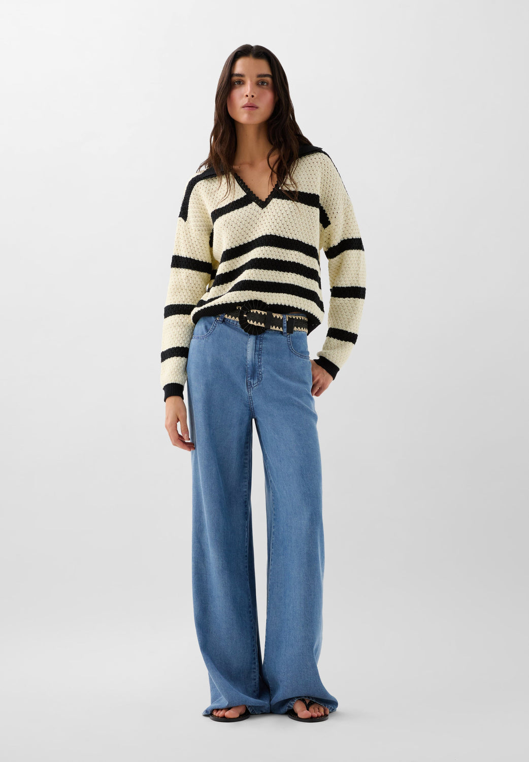Jersey confeccionado en punto de crochet. Estampado de rayas, cuello polo, escote ligeramente en V y manga larga.