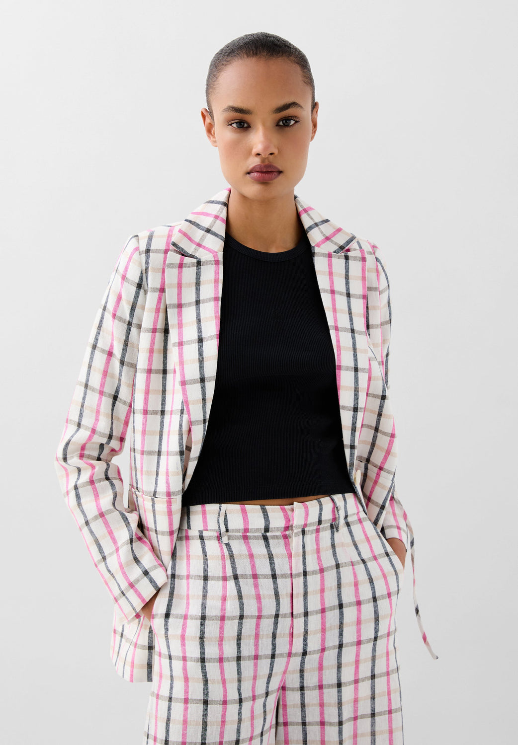 Blazer confeccionada en mezcla de Lino y Algodón. Forro interior 100% Algodón. Manga larga. Cierre por botones en frontal. Cuello solapa. Estampado Vichy.