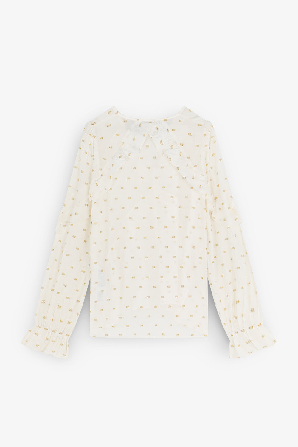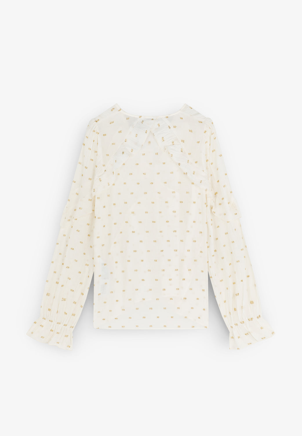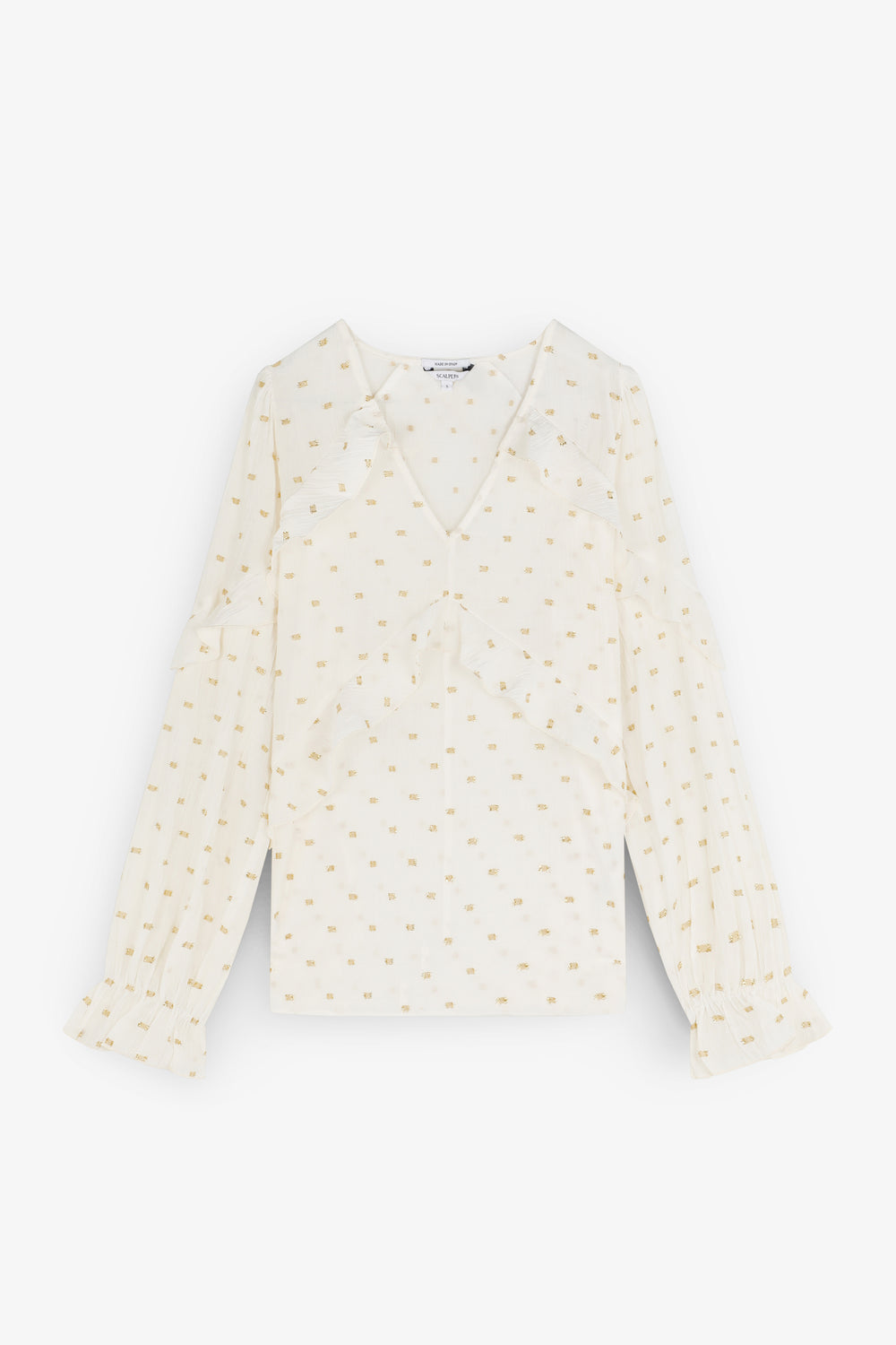 Blusa confeccionada en mezcla de viscosa con detalles de volantes e hilo metalizado. Corte regular fit, escote en V con manga larga terminada en puño con ligero volante.