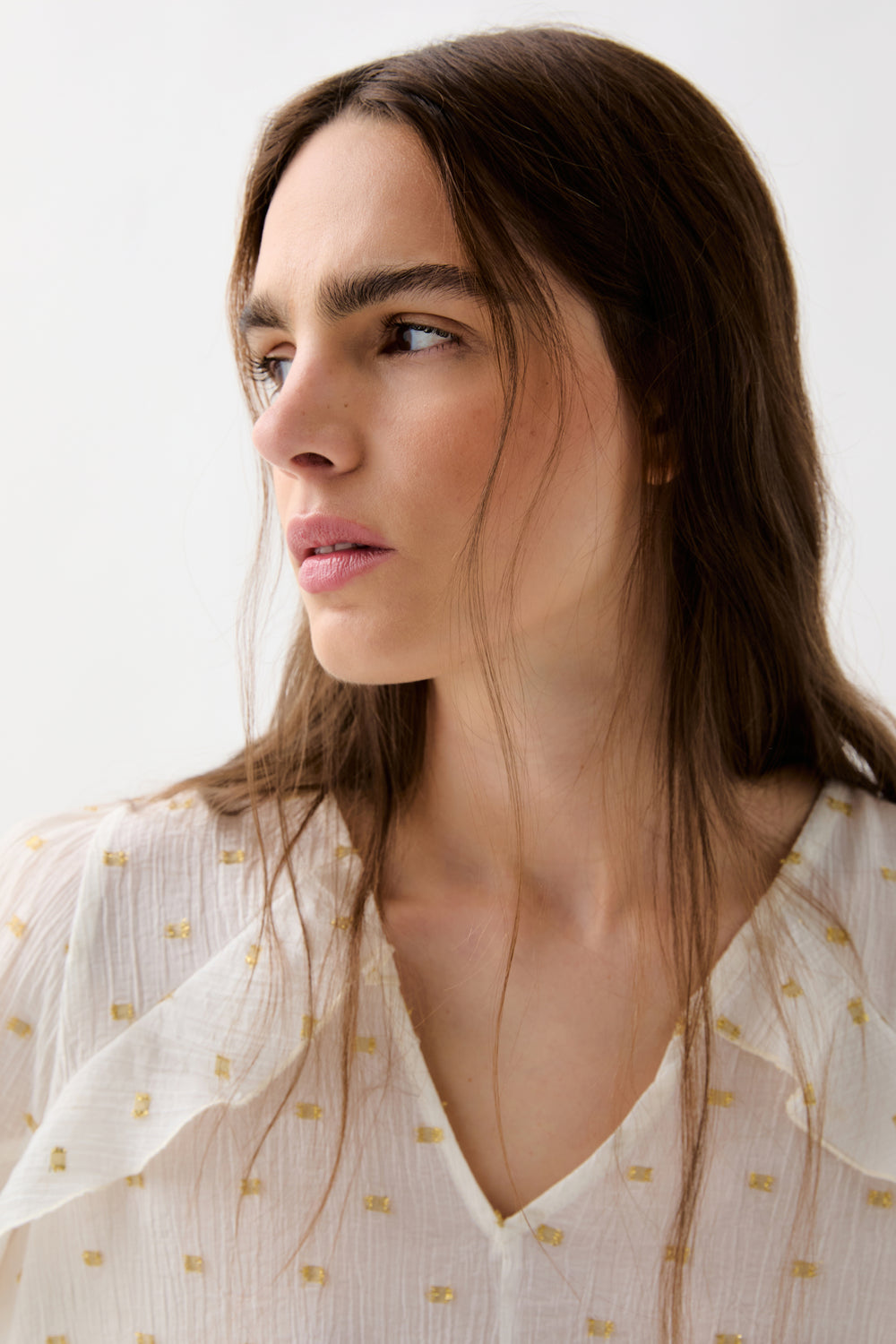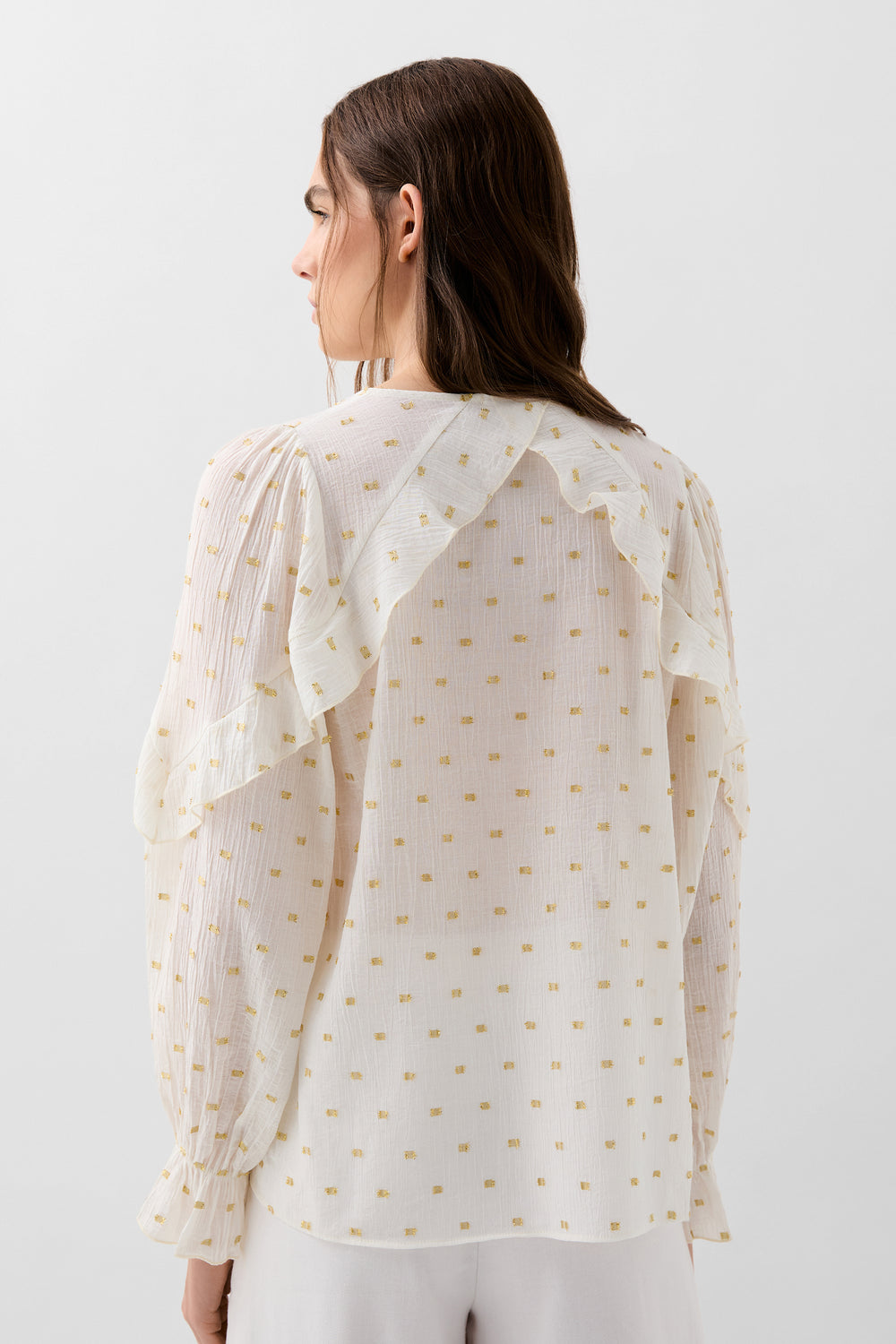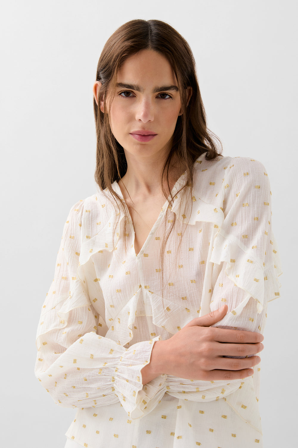 Blusa confeccionada en mezcla de viscosa con detalles de volantes e hilo metalizado. Corte regular fit, escote en V con manga larga terminada en puño con ligero volante.