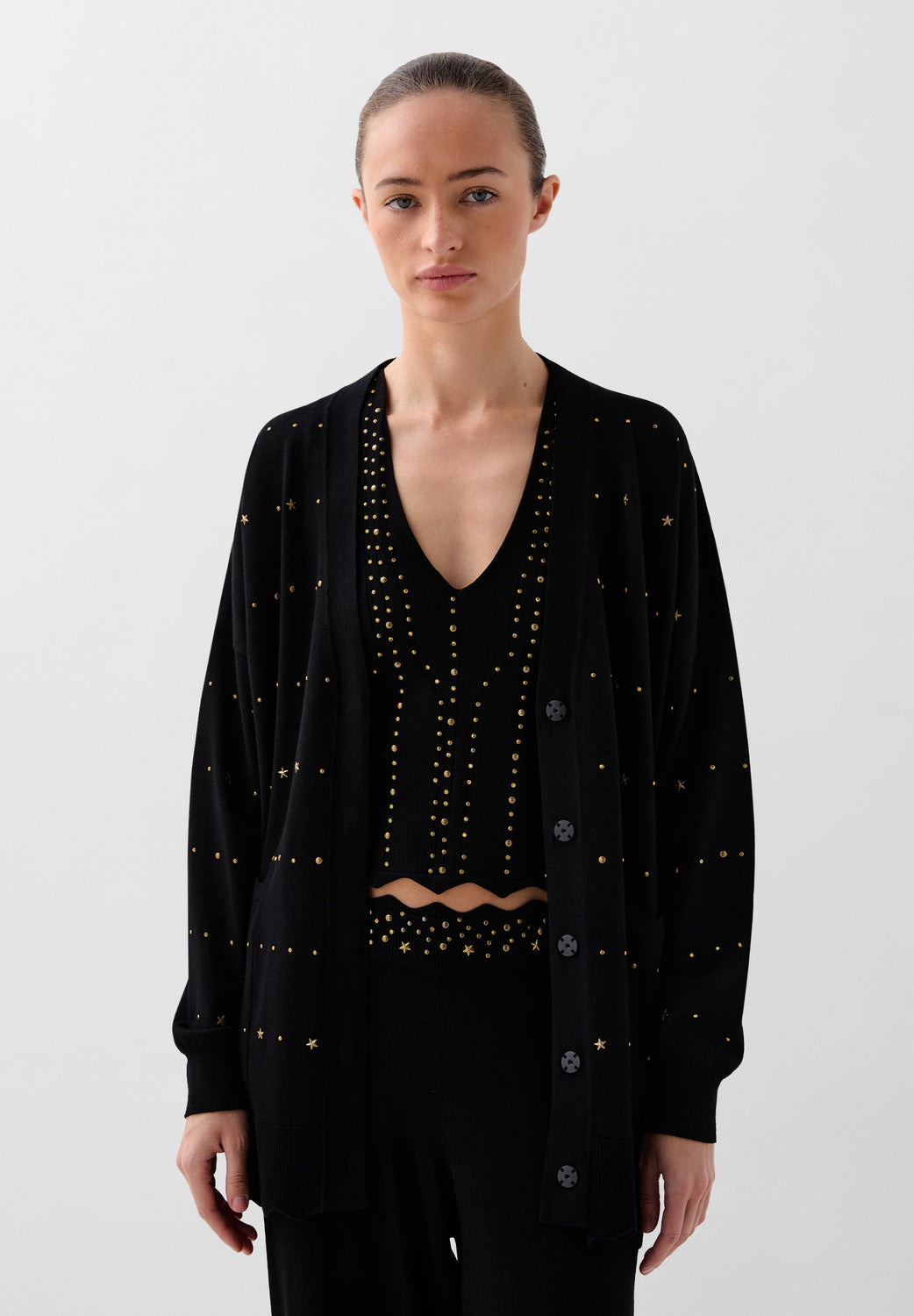 Cárdigan confeccionado en punto con elastano y detalles de tachuelas. Corte ligeramente oversize con manga larga acabadas en rib. Cuello de pico y cierre con botones. Bajo acabado en detalles de ondas.