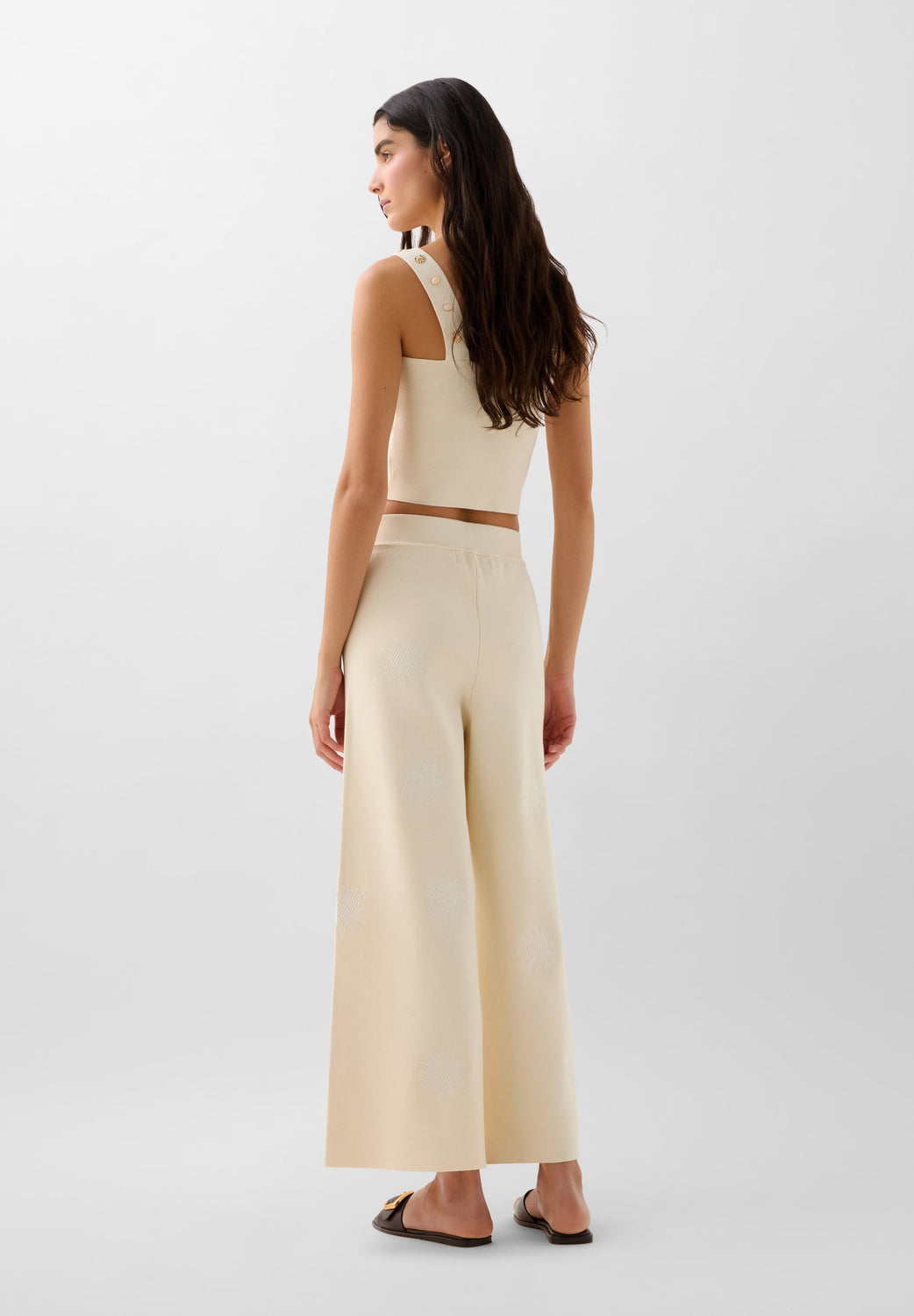 Pantalón confeccionado en punto ligeramente elástico con detalle de soles a tono en ambos lados.