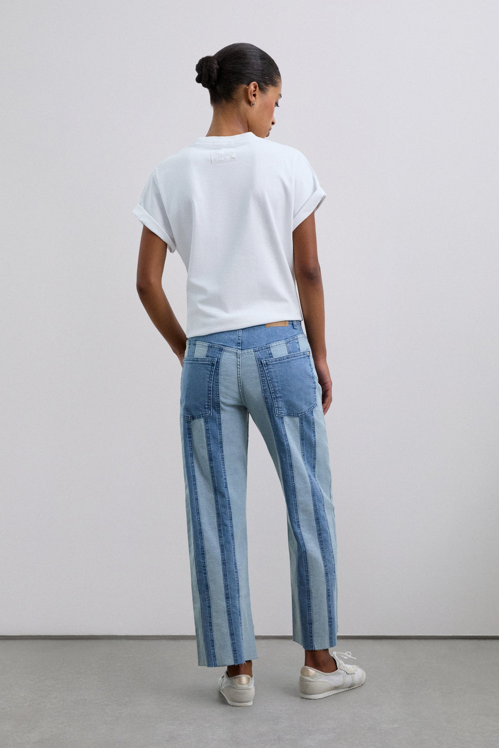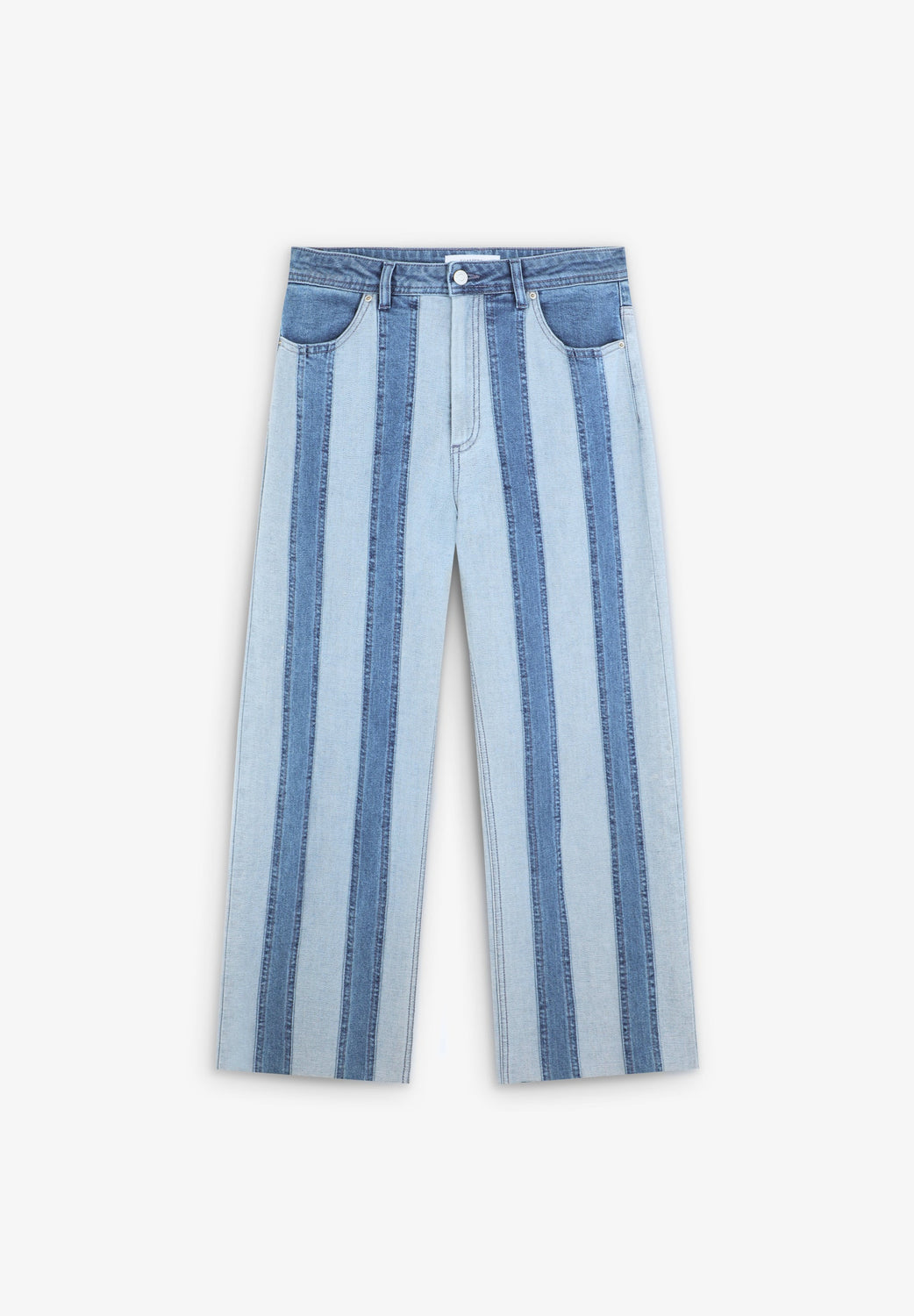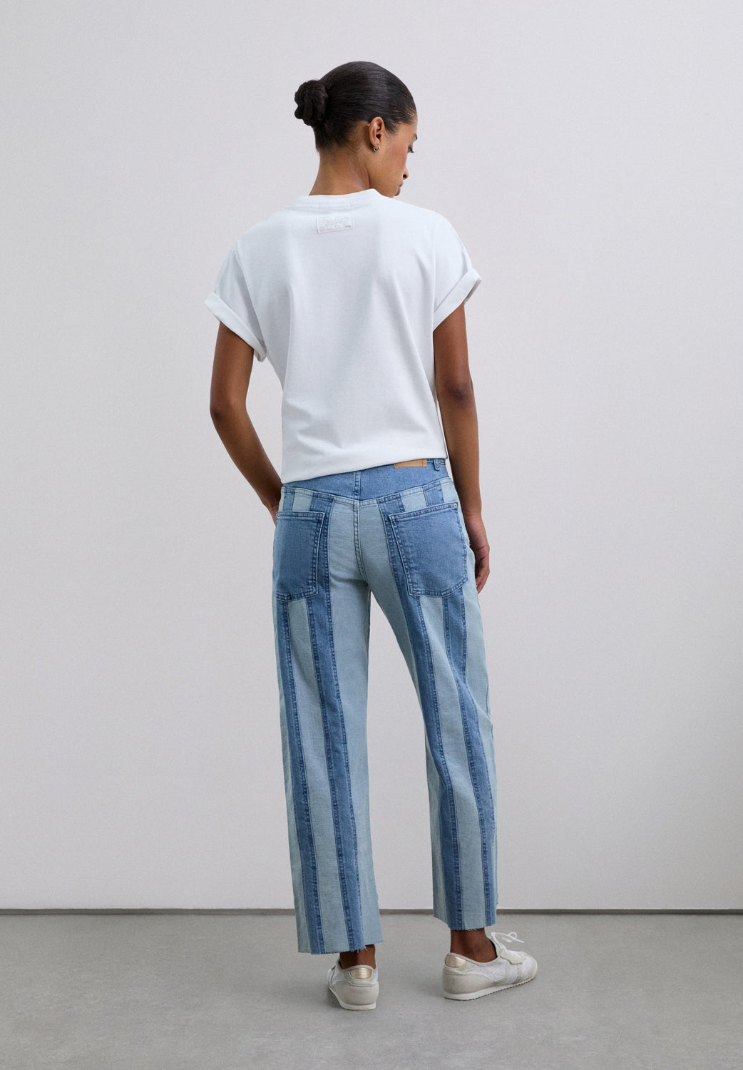 Pantalón denim confeccionado en algodón ligeramente elástico. Corte regular fit, straight leg, con rayas bicolores. Cierre con cremallera y botón, trabillas en cintura, bolsillos delanteros inclinados y traseros de parche. Detalle de parche con logo trasero.