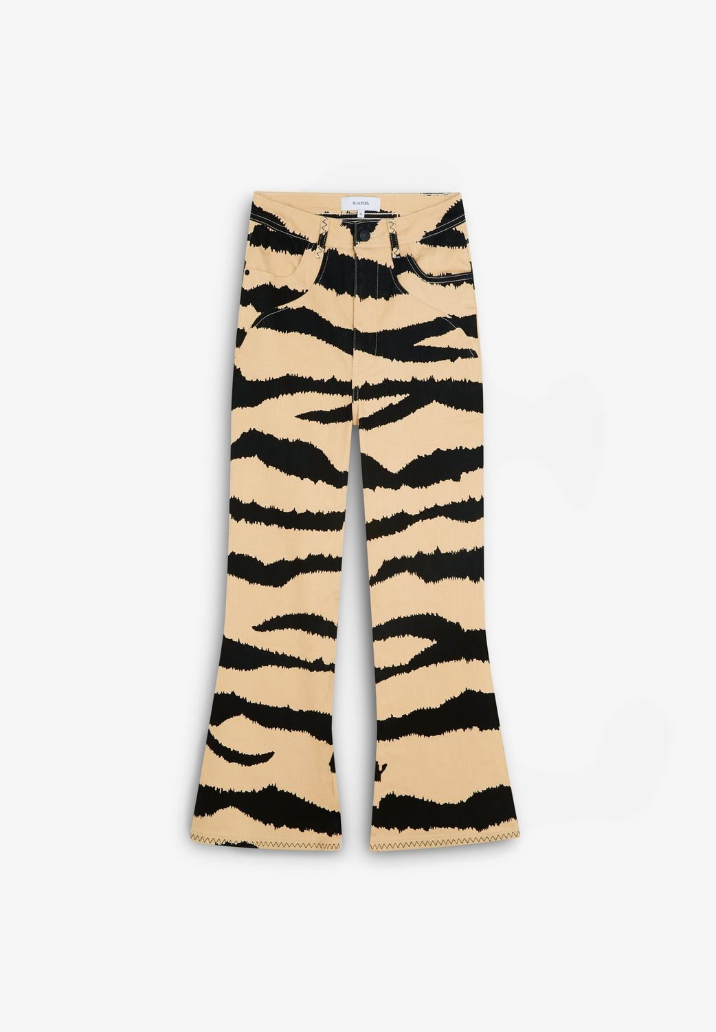 Jeans con print de cebra confeccionados en mezcla de algodón ligeramente elástico. Ankle flare con tiro medio, cierre con botón y cremallera y trabillas en cintura. Bolsillos delanteros y traseros y bajo acabado en costuras marcadas.