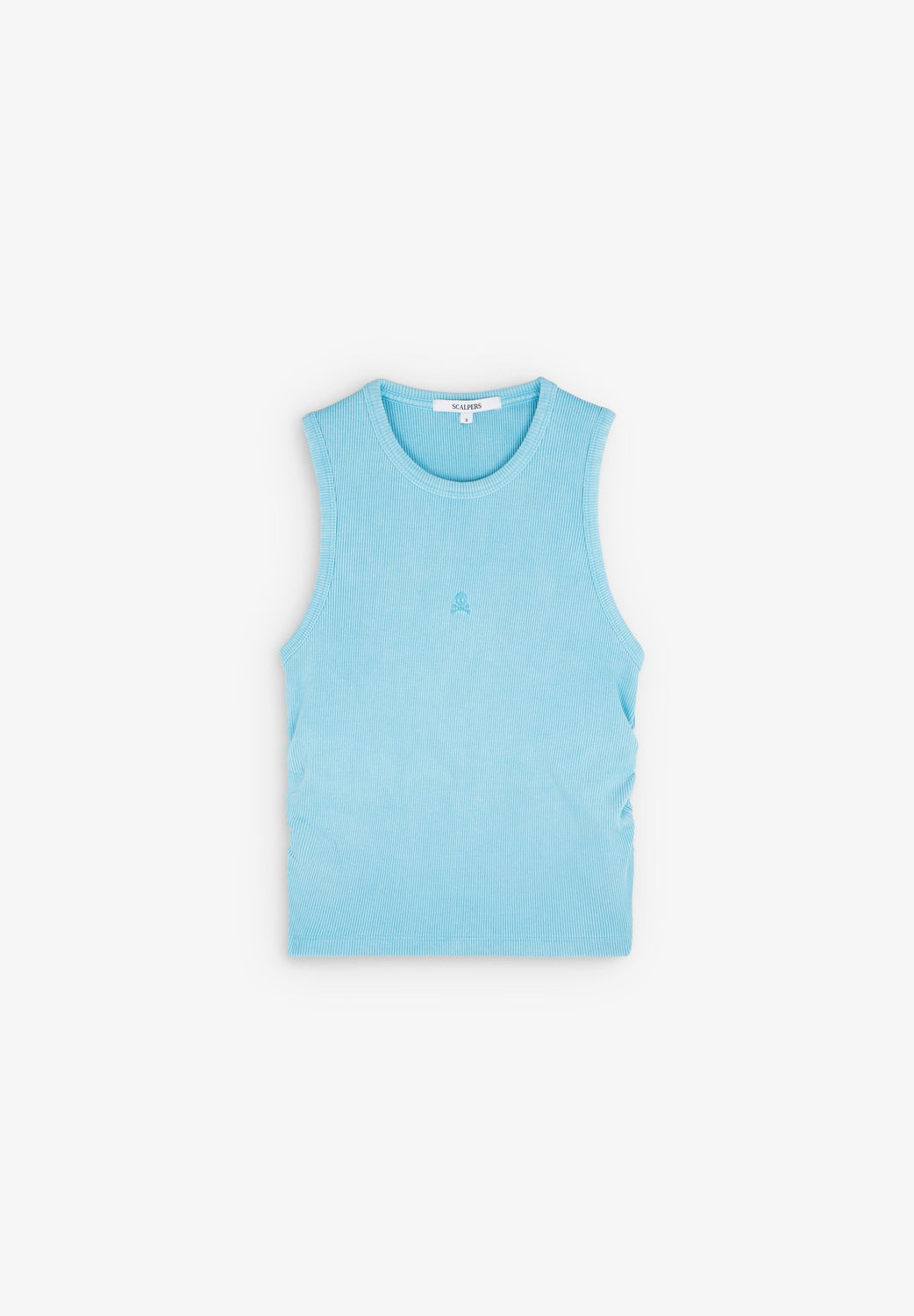 Tank top confeccionado en tejido rib en mezcla de 90% algodón BCI con elastano. Corte slim fit, cuello redondo y manga en sisa. Detalle de frunces laterales.
