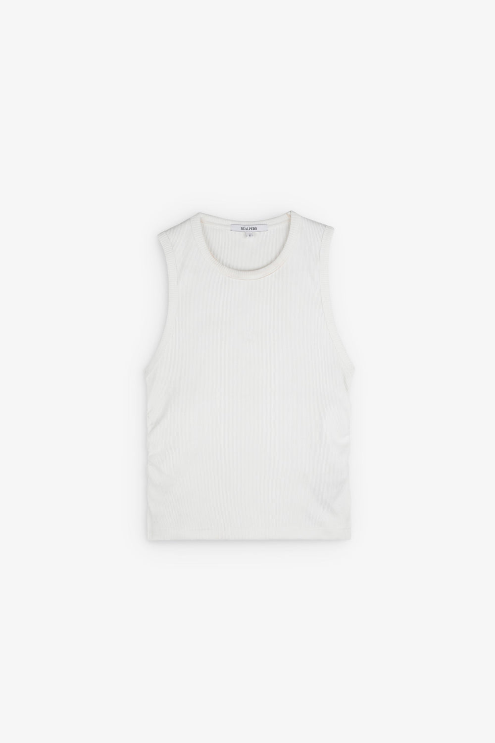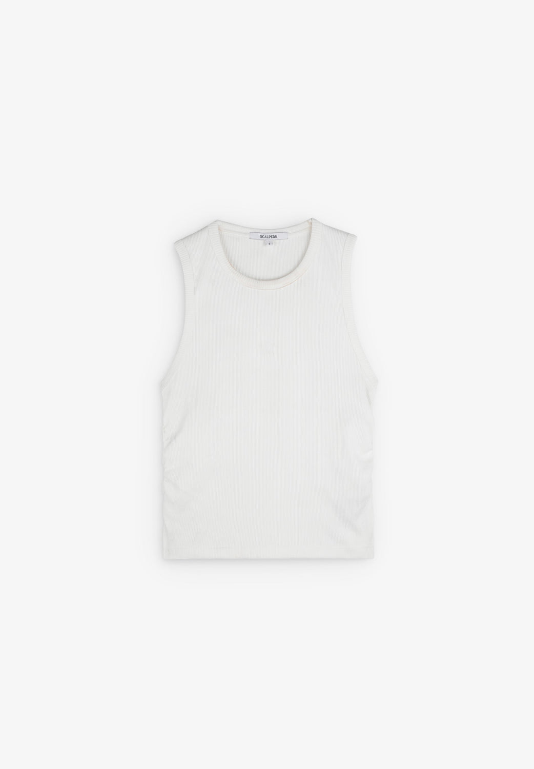 Tank top confeccionado en tejido rib en mezcla de 90% algodón BCI con elastano. Corte slim fit, cuello redondo y manga en sisa. Detalle de frunces laterales.