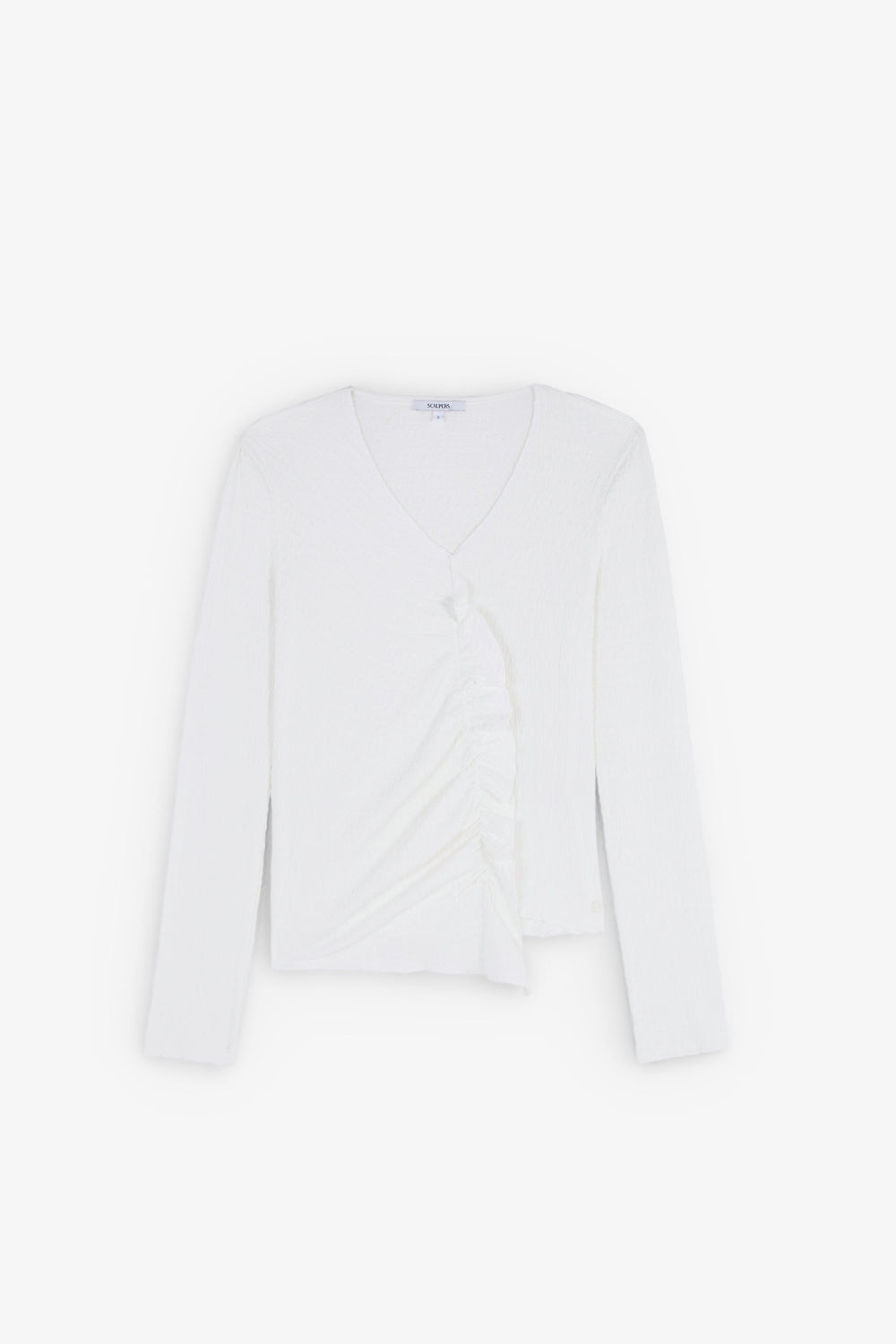 Top acabado textura de escote asimétrico en pico con volantes y manga larga.