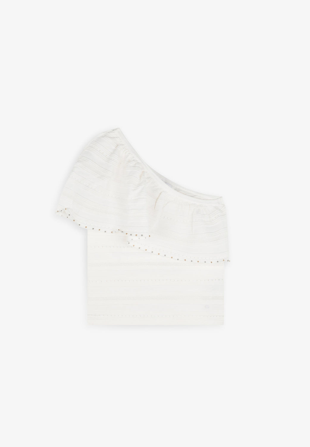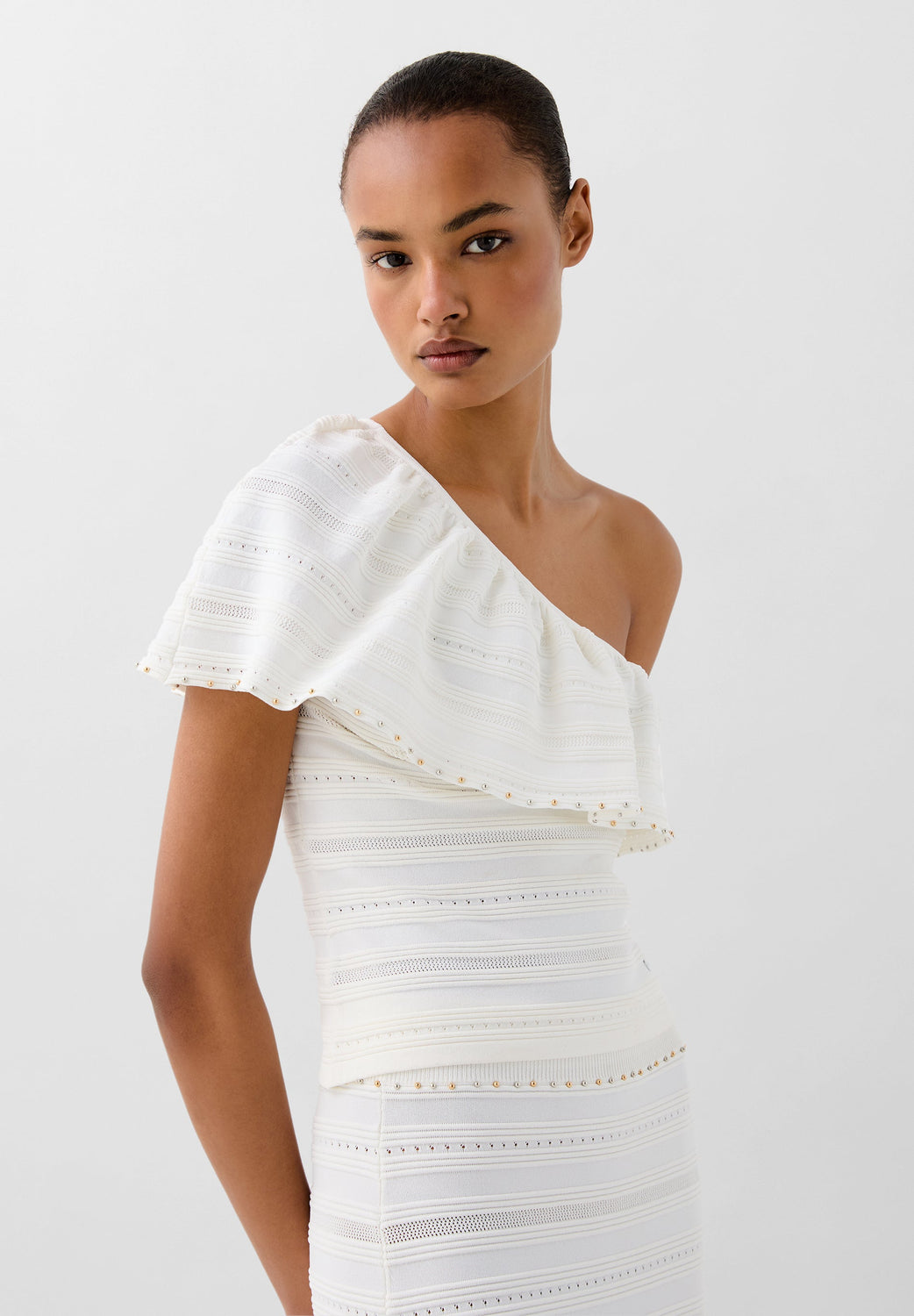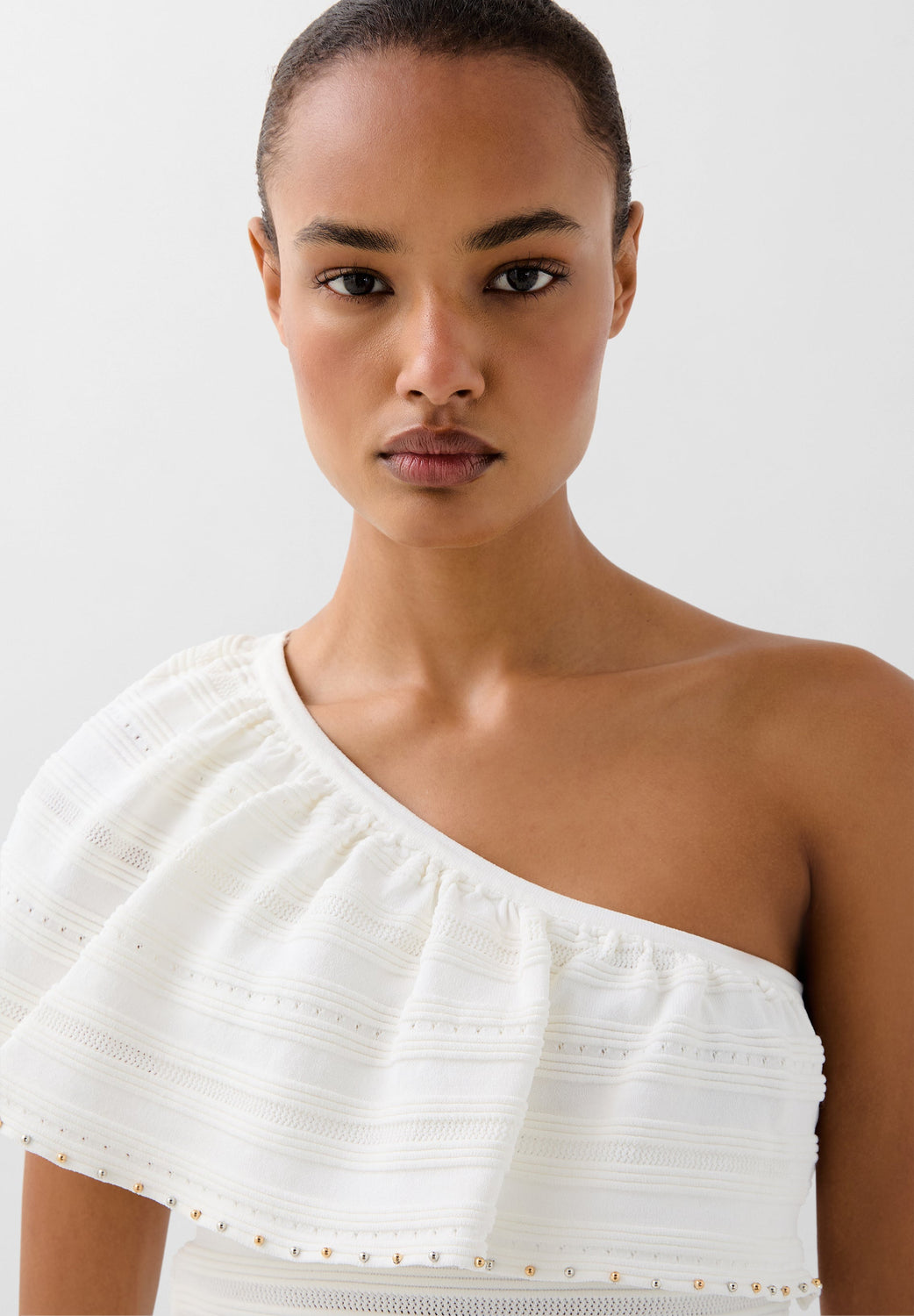 Top confeccionado en punto con apliques de studs y volante. Corte asimétrico, volante en hombro, slim fit.