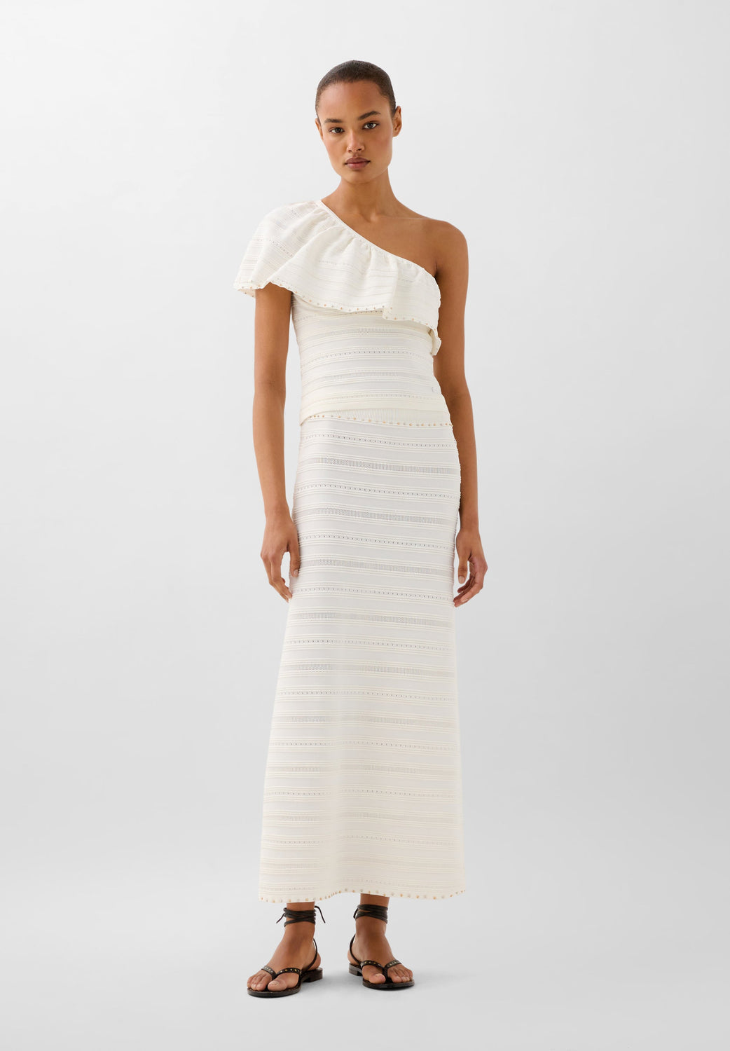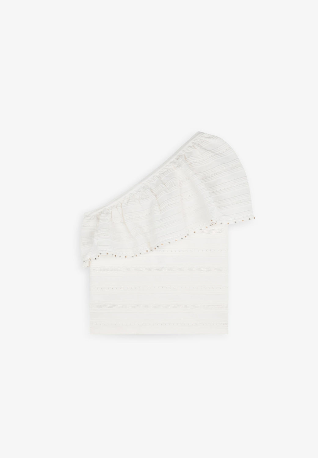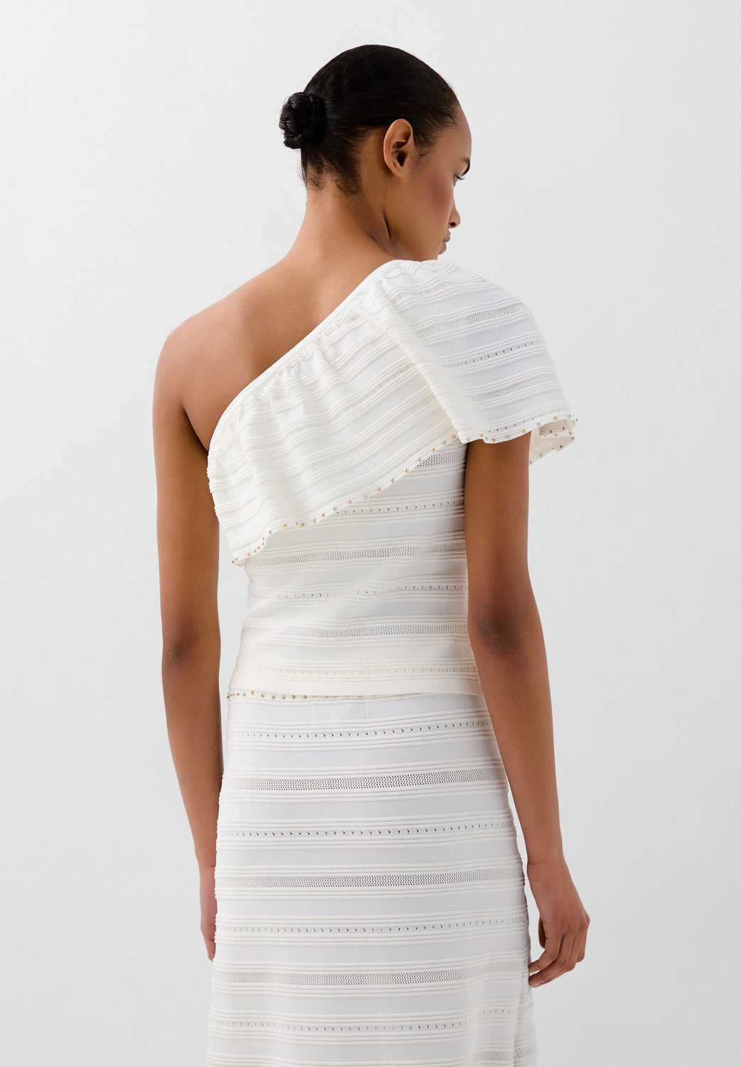 Top confeccionado en punto con apliques de studs y volante. Corte asimétrico, volante en hombro, slim fit.