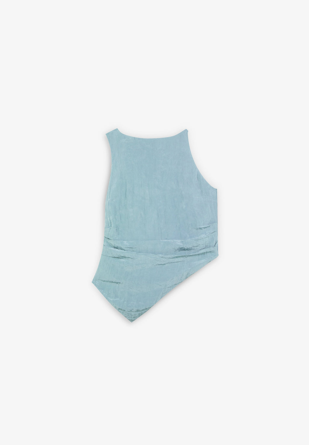Top de cuello redondo y manga sisa con espalda descubierta. Cintura entallada. Bajo acabado asimétrico. Cierre trasero ajustable con lazos en hombro y cintura.