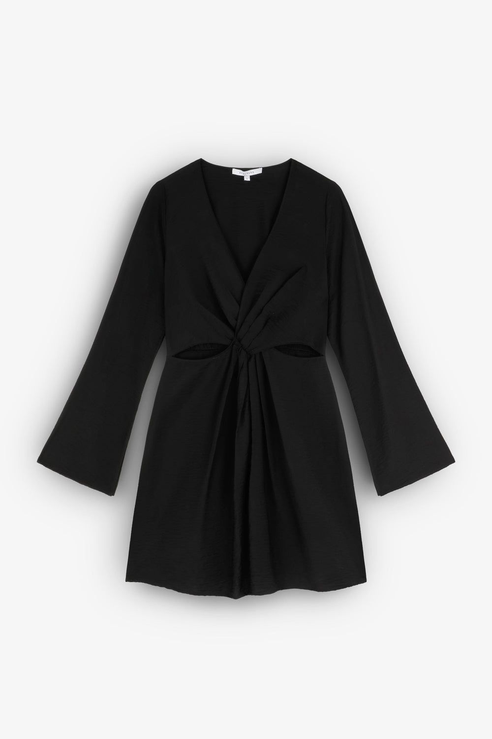 Vestido mini confeccionado en tejido fluido ligeramente elástico. Corte regular fit, Escote de pico cruzado y manga larga con detalle de nudo en cintura.