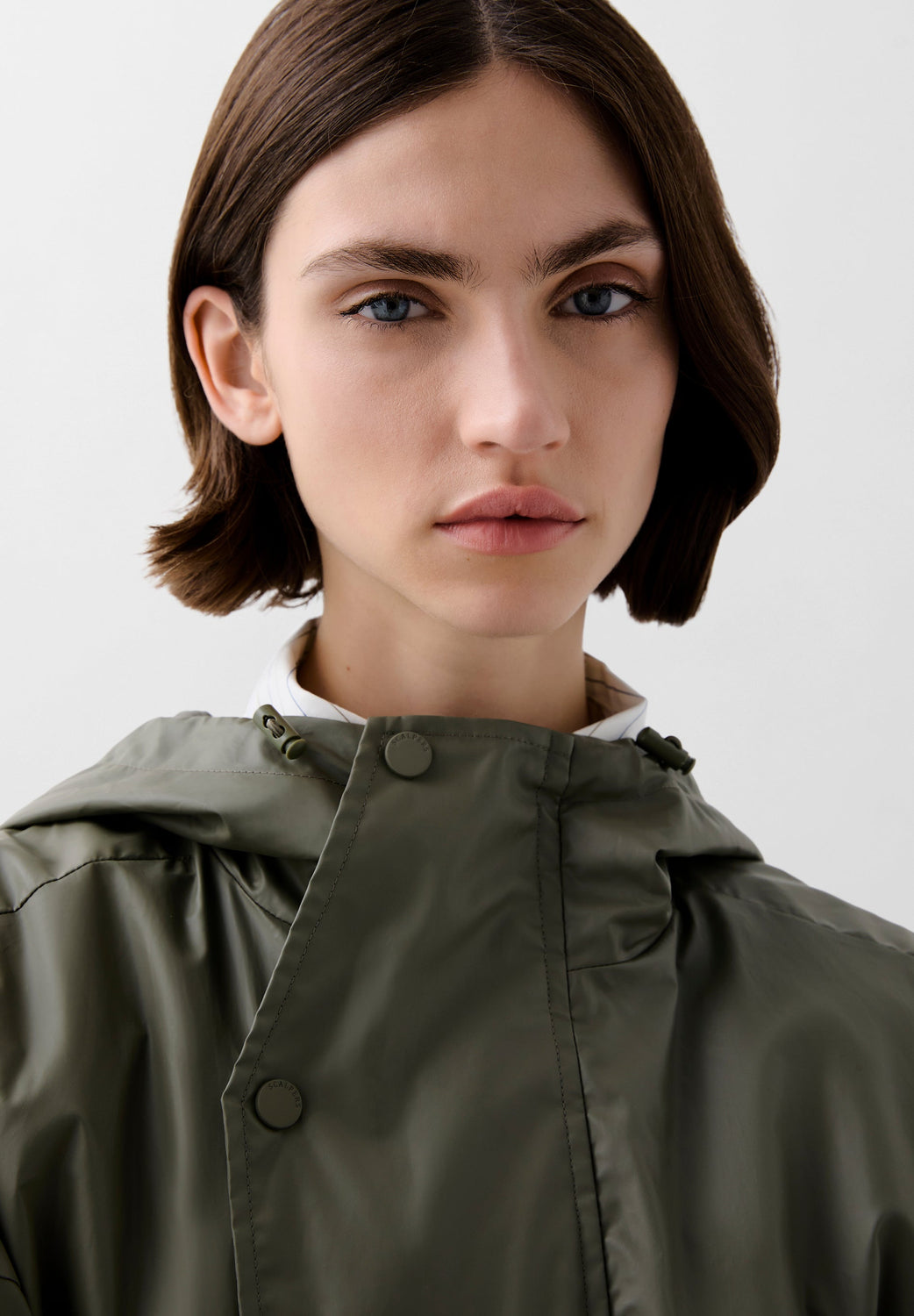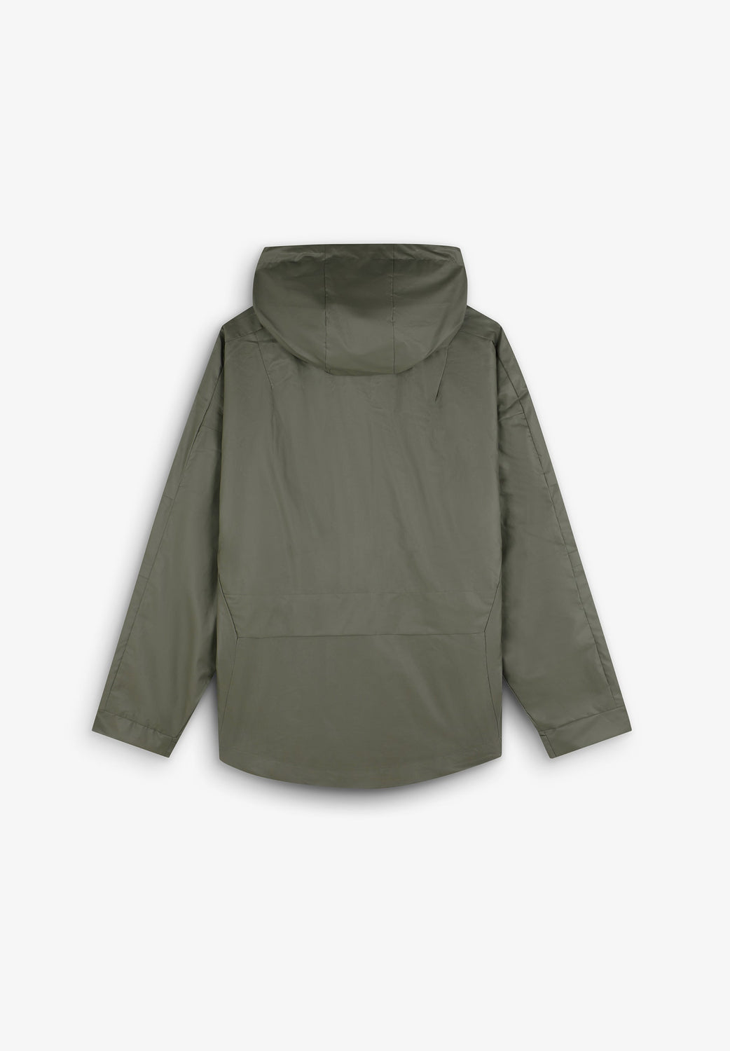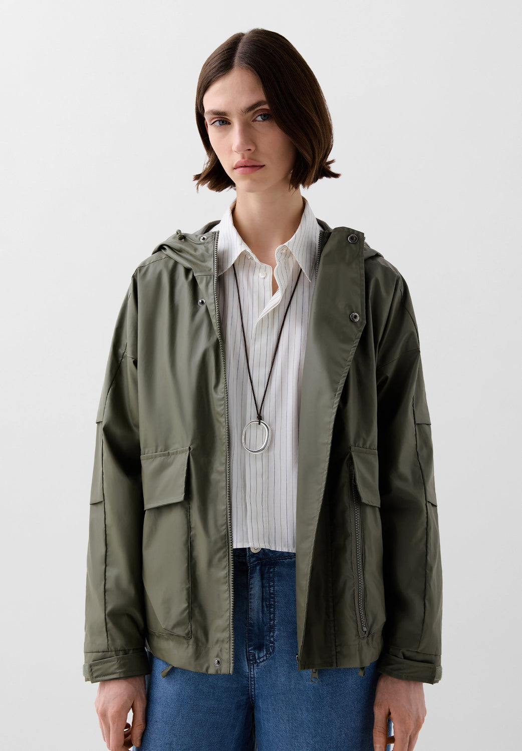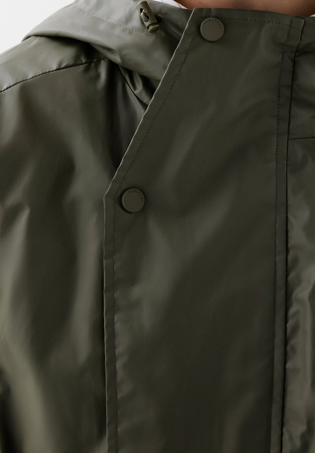 Cazadora regular fit confeccionada en tejido impermeable. Cuello subido, capucha y manga larga acabada en puño ajustable con velcro. Bolsillos de plastrón con solapa en cadera. Cierre frontal con cremallera oculta por solapa con botones a presión.