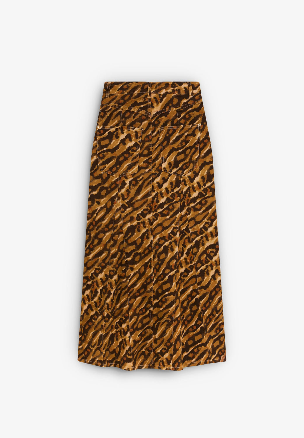Falda midi de tiro alto confeccionada en Algodón y acabado denim. Bolsillos laterales. Detalle de costuras. Bajo acabado en línea evasé.