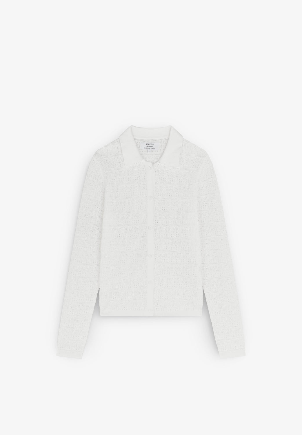 Cárdigan confeccionado en Lino. Cierre mediante botones en frontal. Cuello camisero. Manga larga.