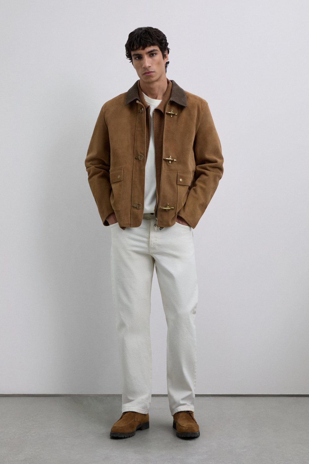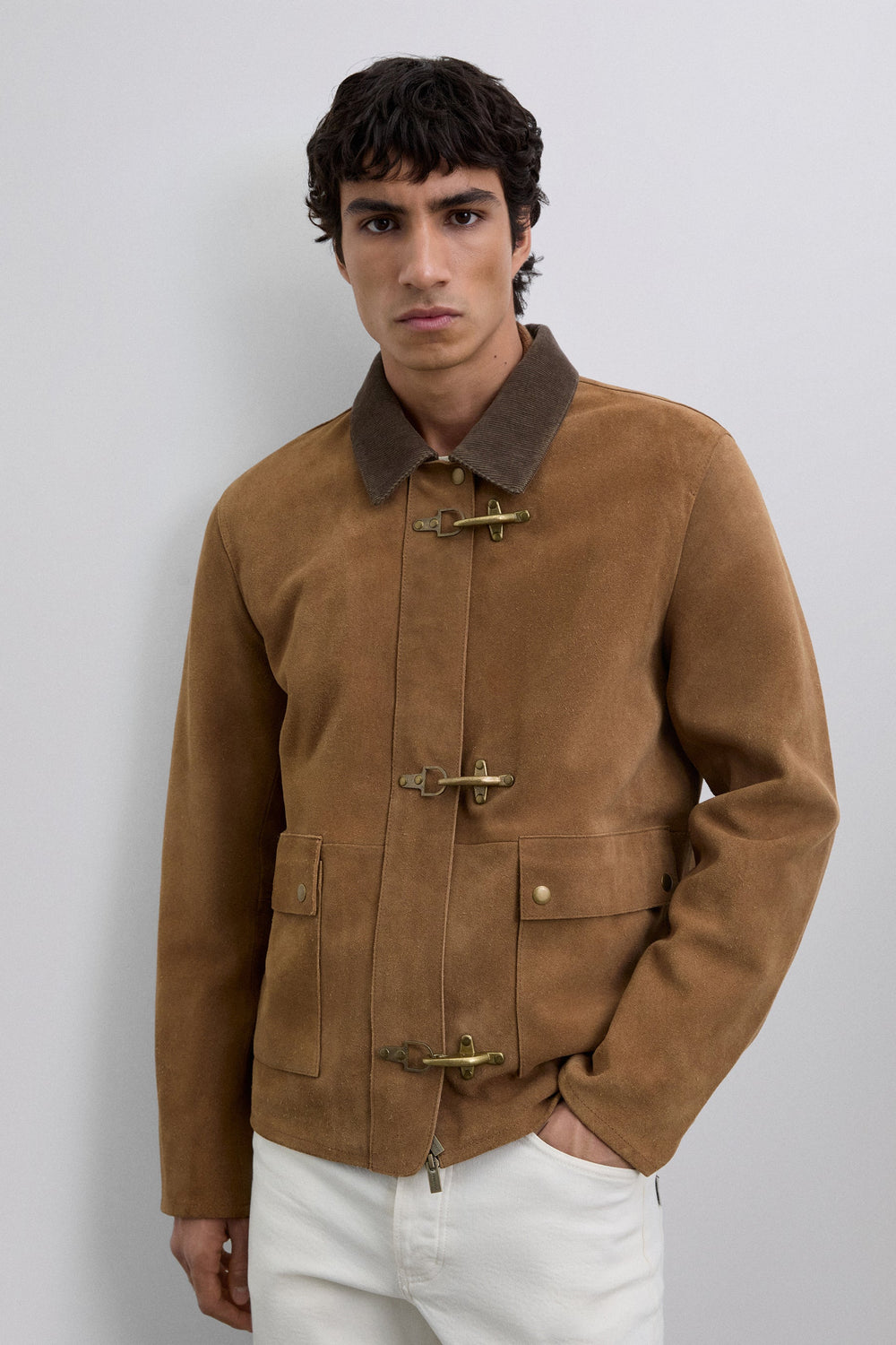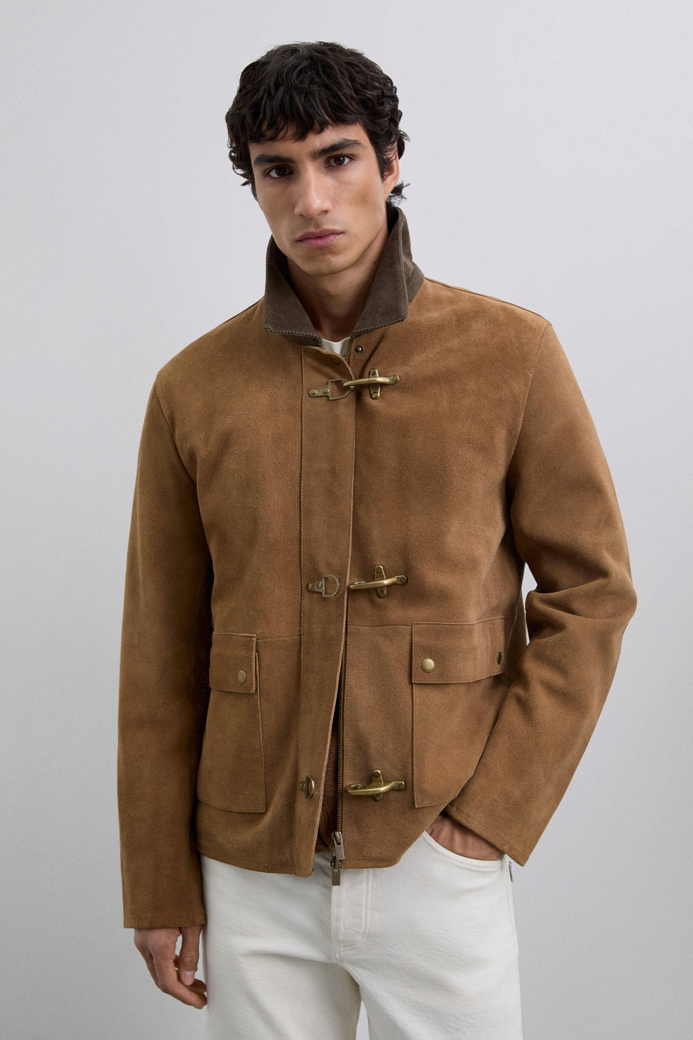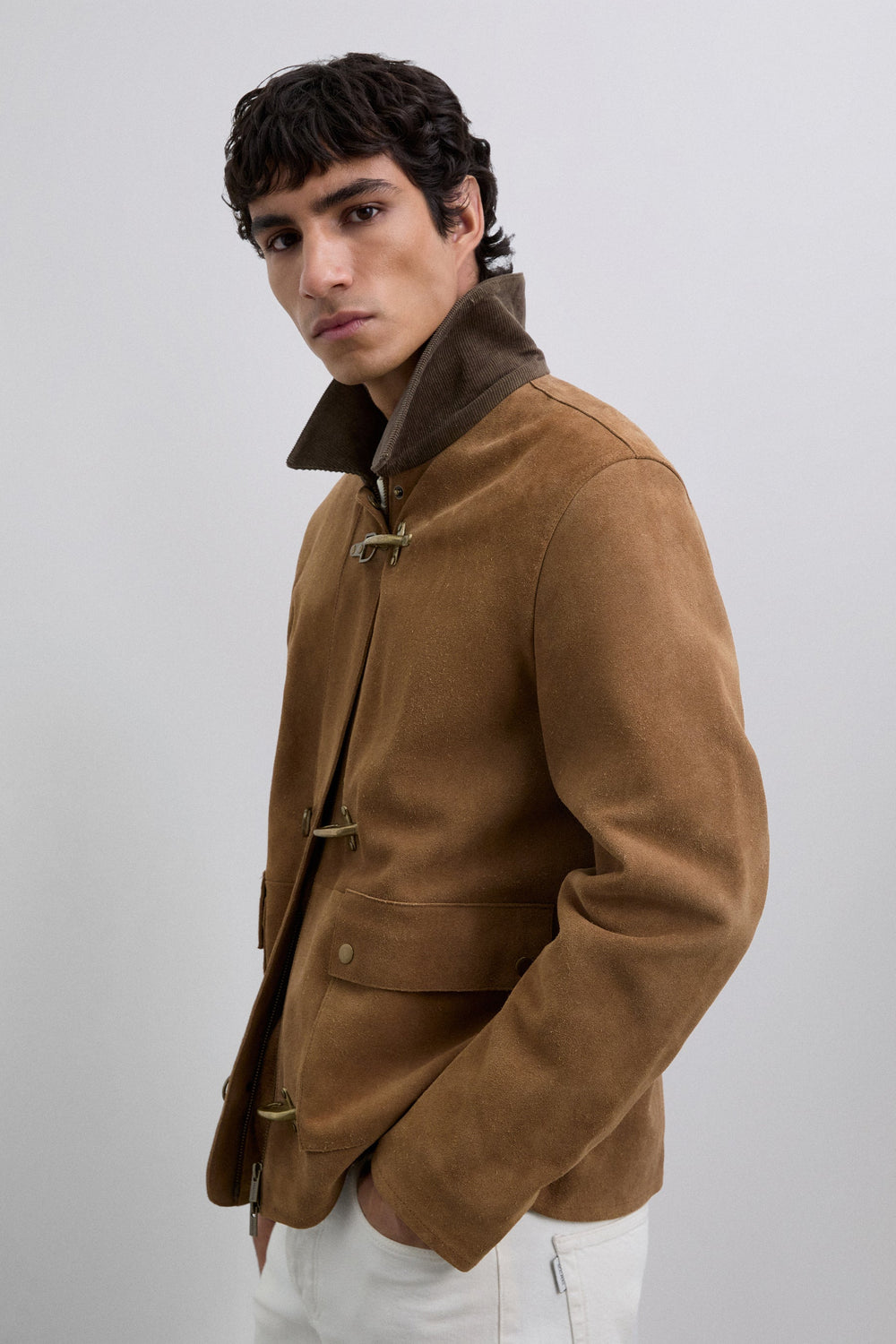 Chaqueta confeccionada en 100% piel. Manga larga. Cuello de pana. Cierre frontal metálico tipo toggle y cremallera. Dos bolsillos de parche con botones.