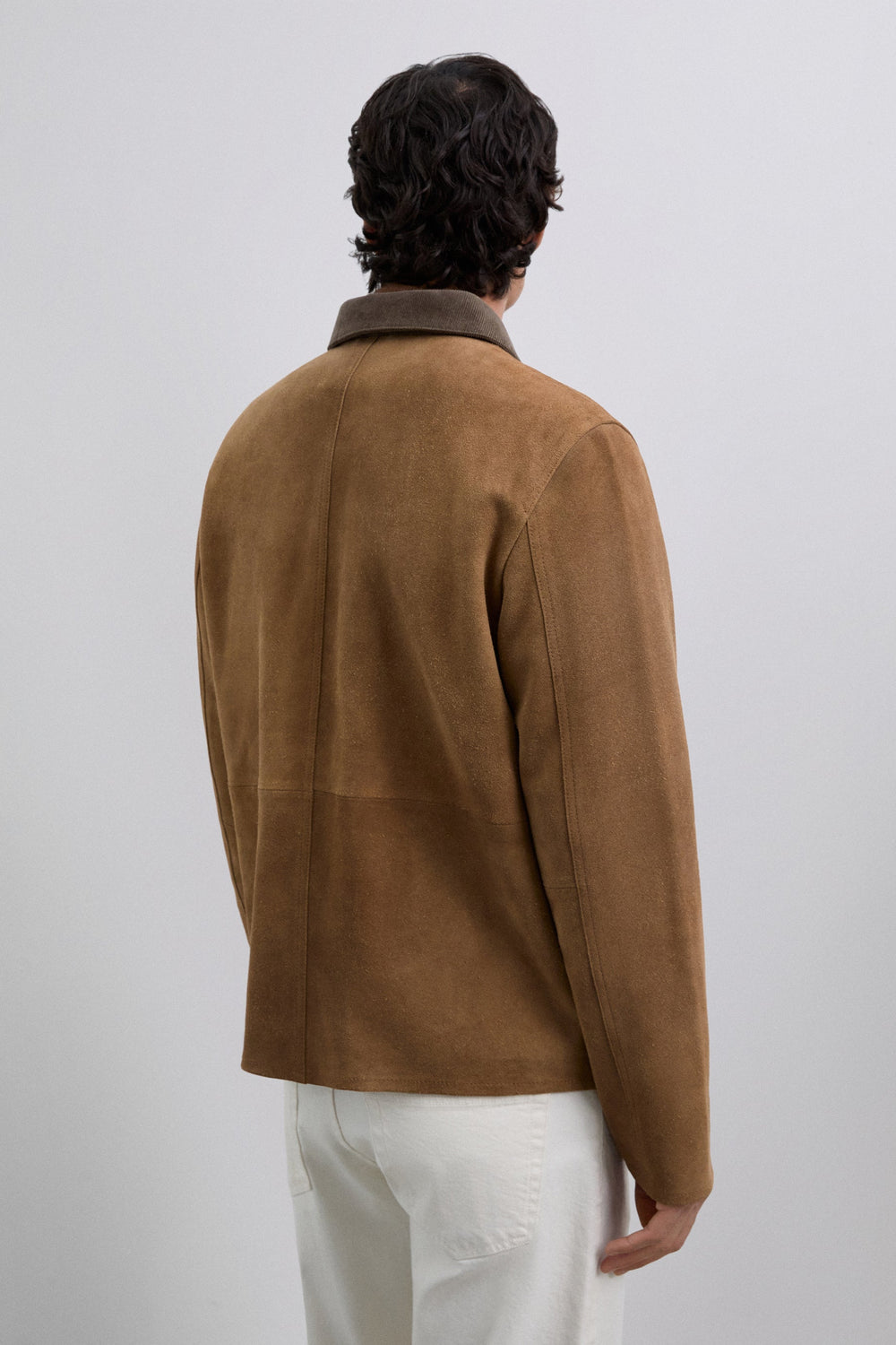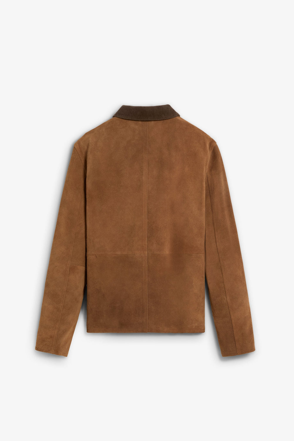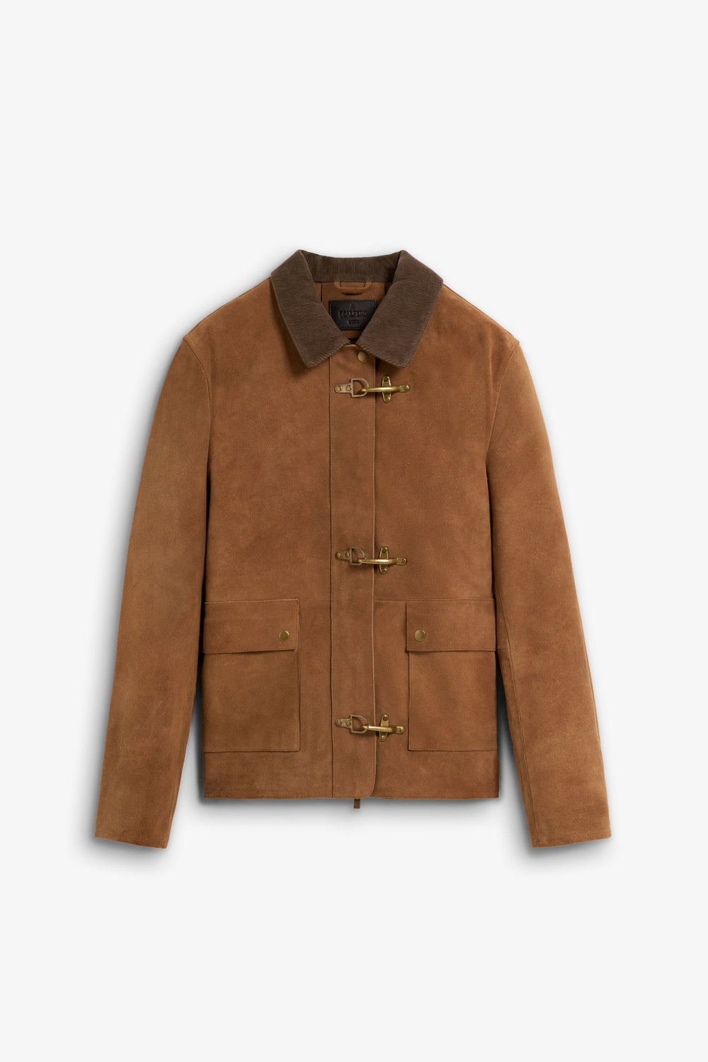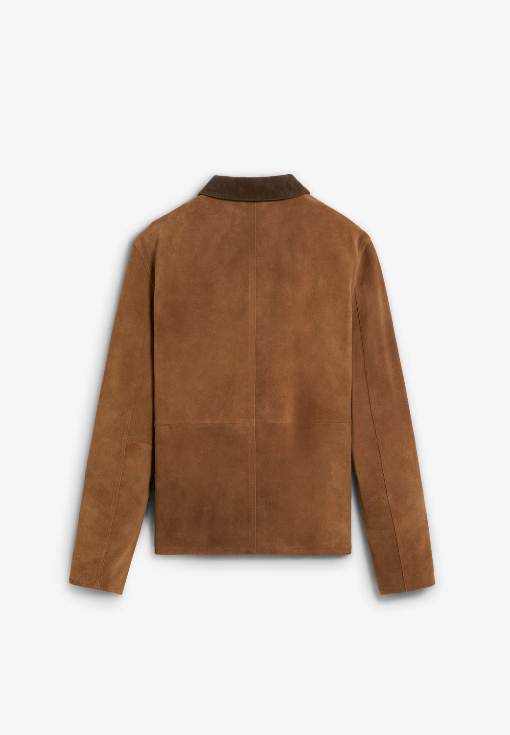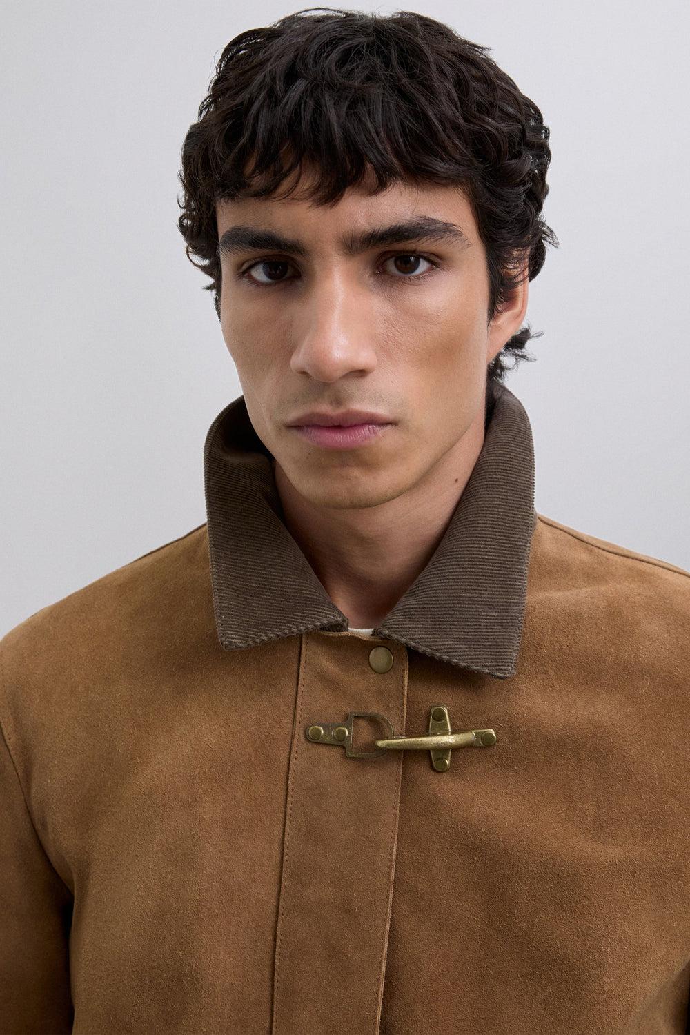 Chaqueta confeccionada en 100% piel. Manga larga. Cuello de pana. Cierre frontal metálico tipo toggle y cremallera. Dos bolsillos de parche con botones.