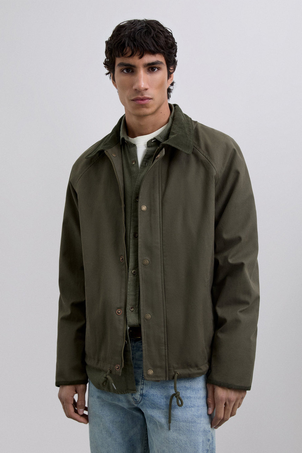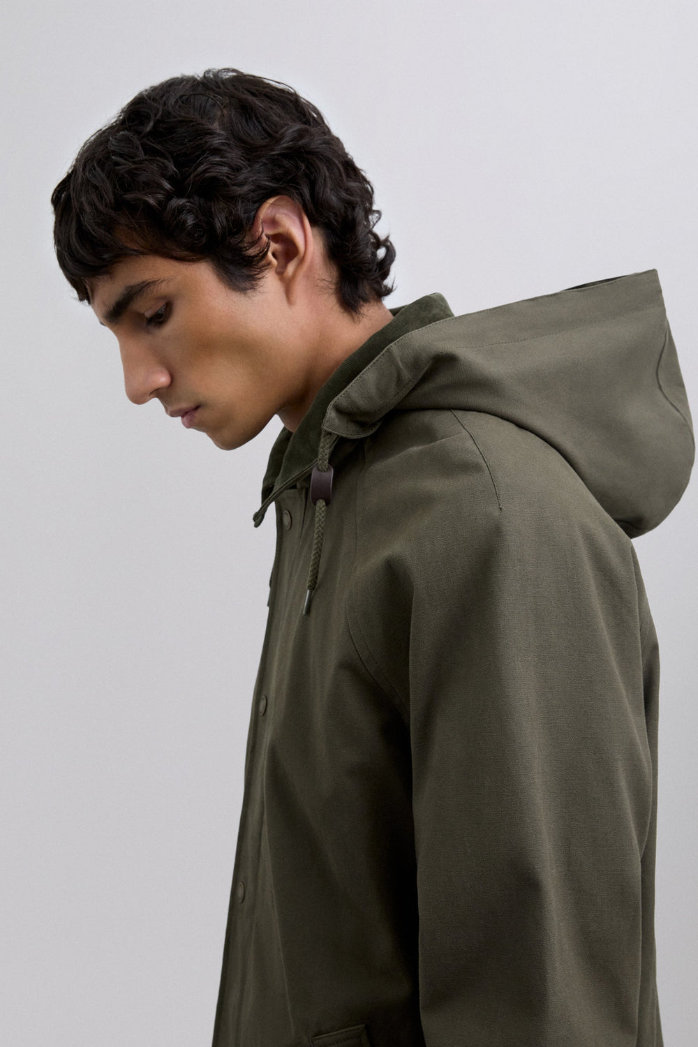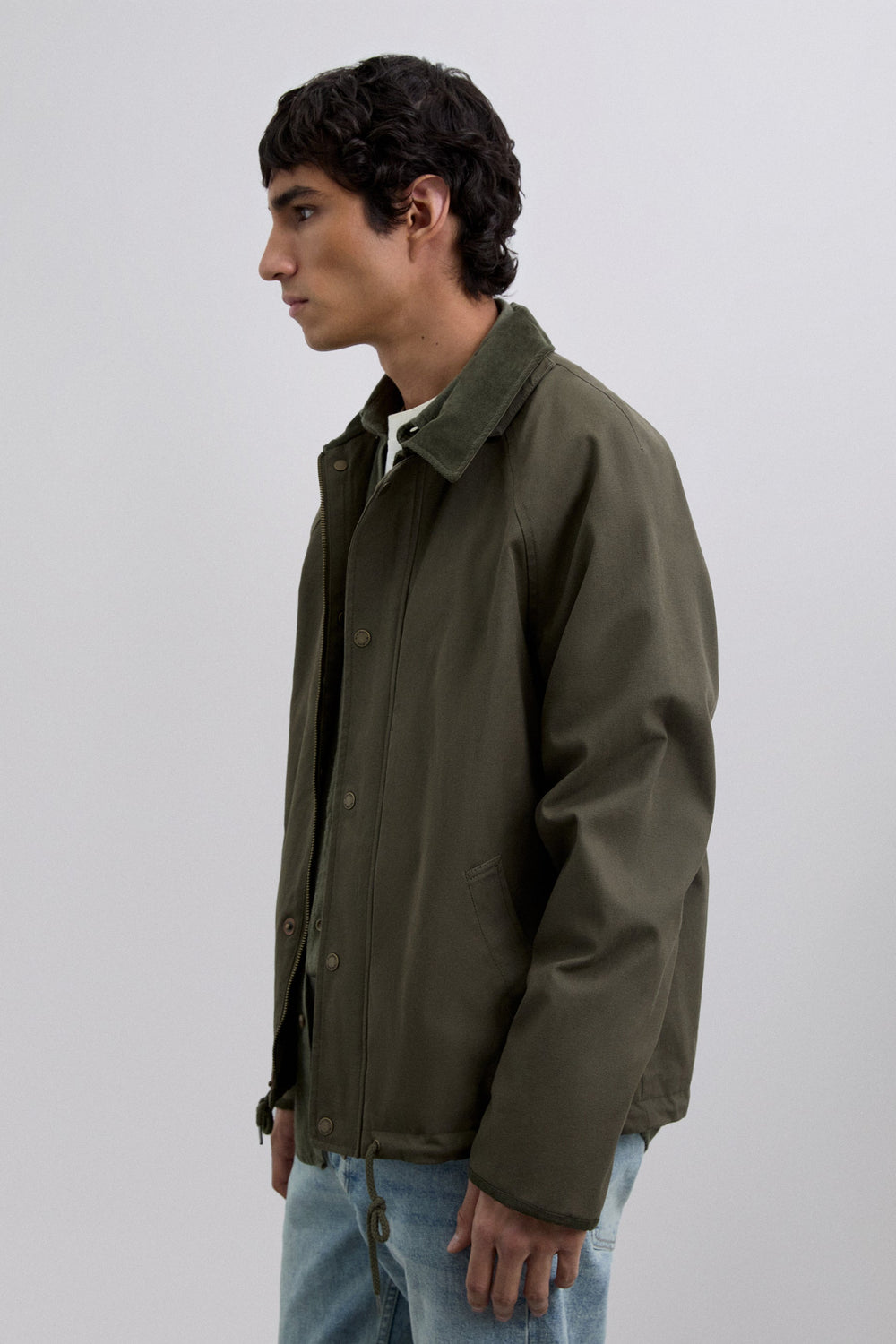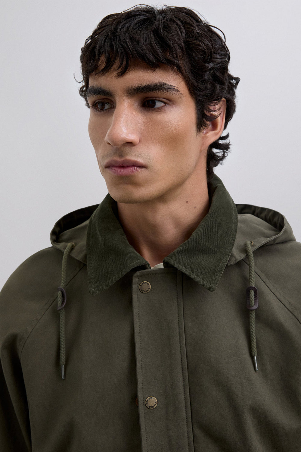 Chaqueta confeccionada en 100% Algodón BCI. Capucha ajustable y desmontable. Cierre con cremallera y botones. Puños interiores de canalé. El vivo de la manga y el cuello están confeccionados en pana. Mangas raglán. Dos bolsillos delanteros. Detalles logotipo en cremallera.