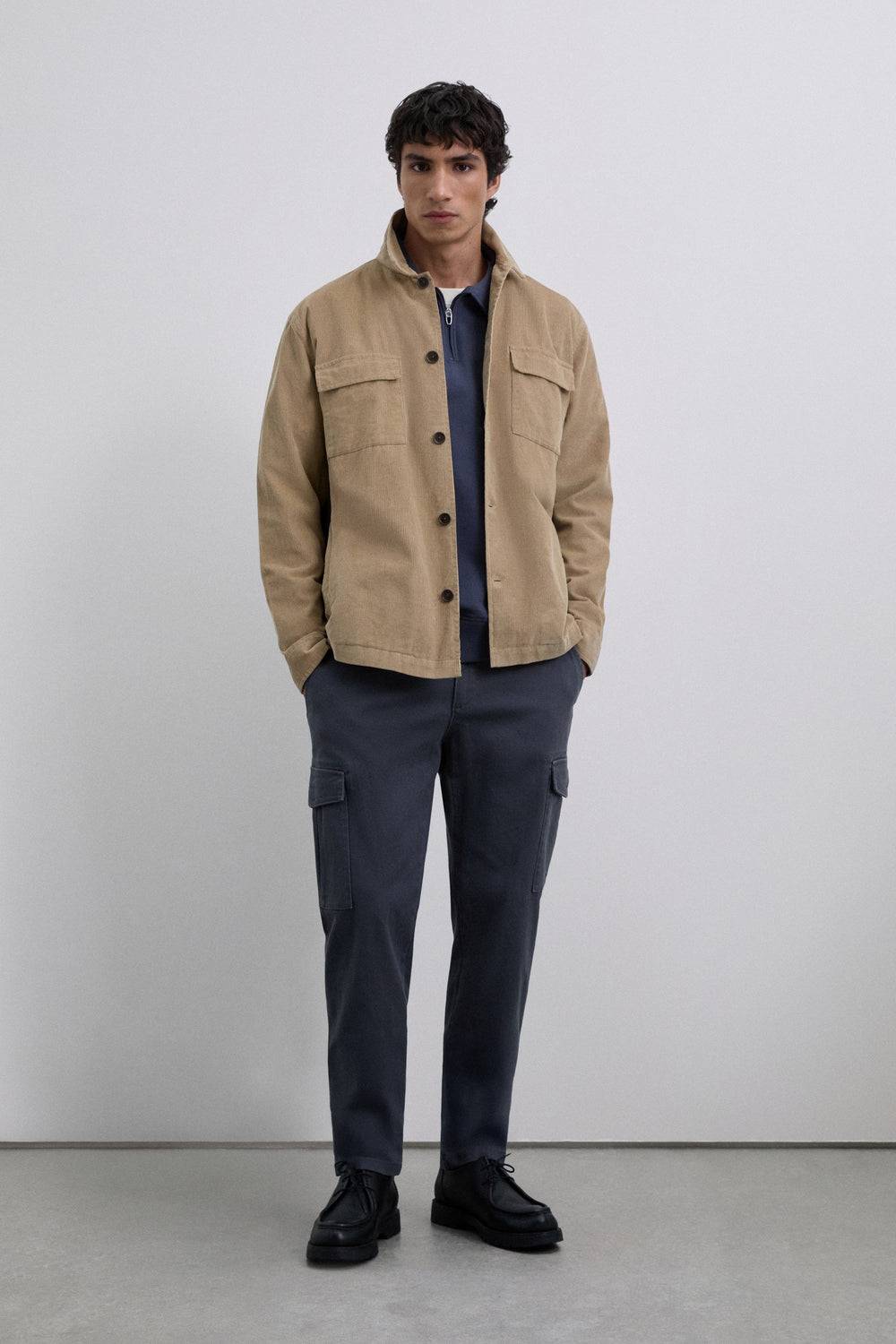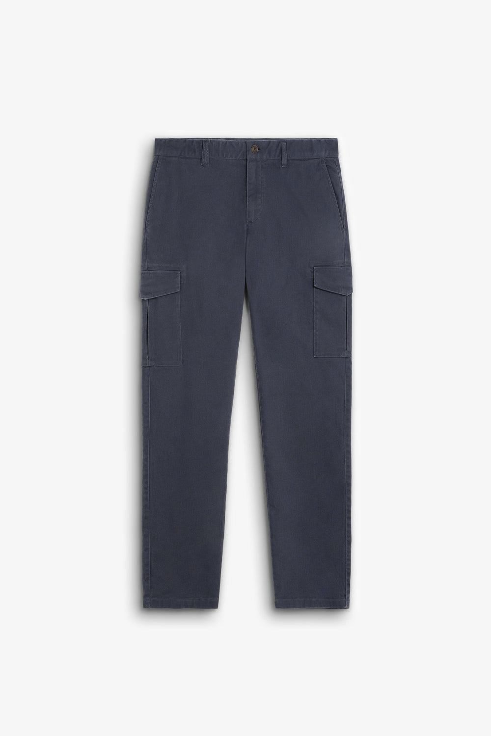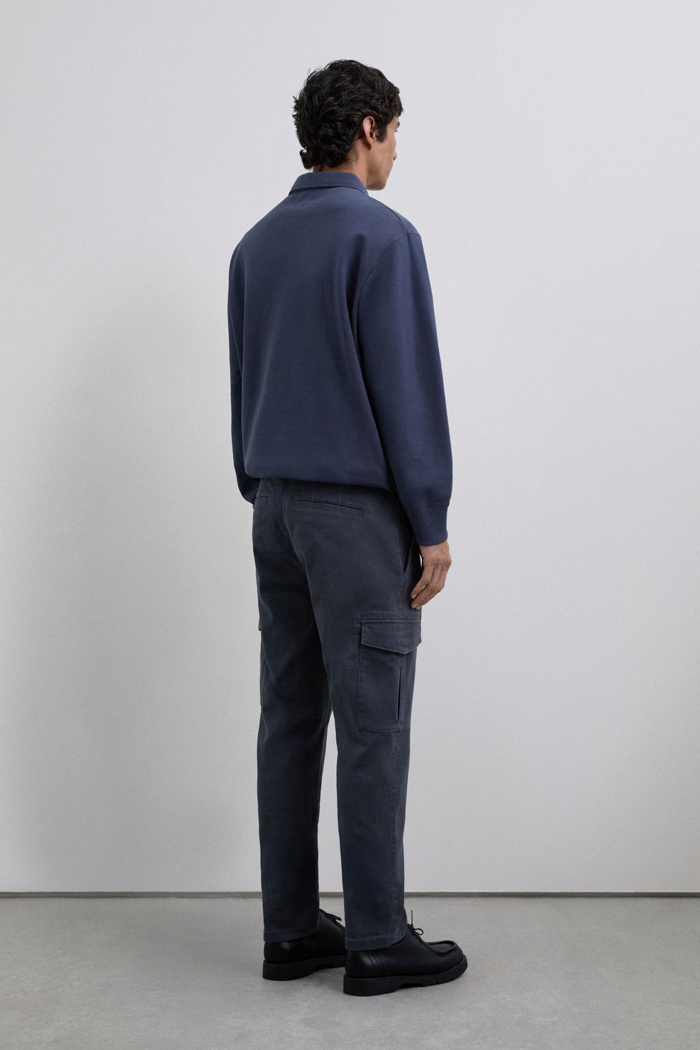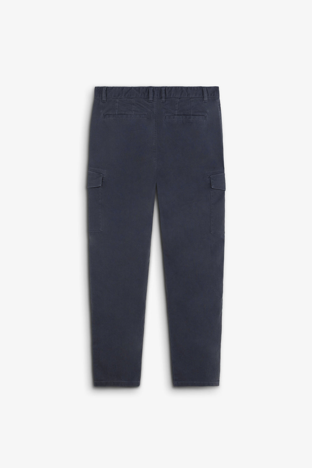 Pantalón cargo confeccionado en tejido de algodón con elasticidad. Cropped fit. Bolsillos frontales y detalle de bolsillos traseros en vivo. Aplicación de bolsillos de plastrón con solapa en perneras. Cierre frontal con cremallera y botón.