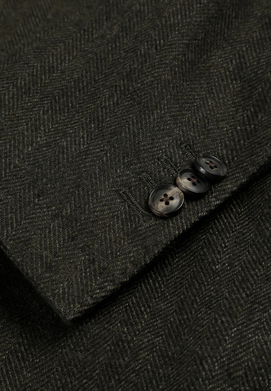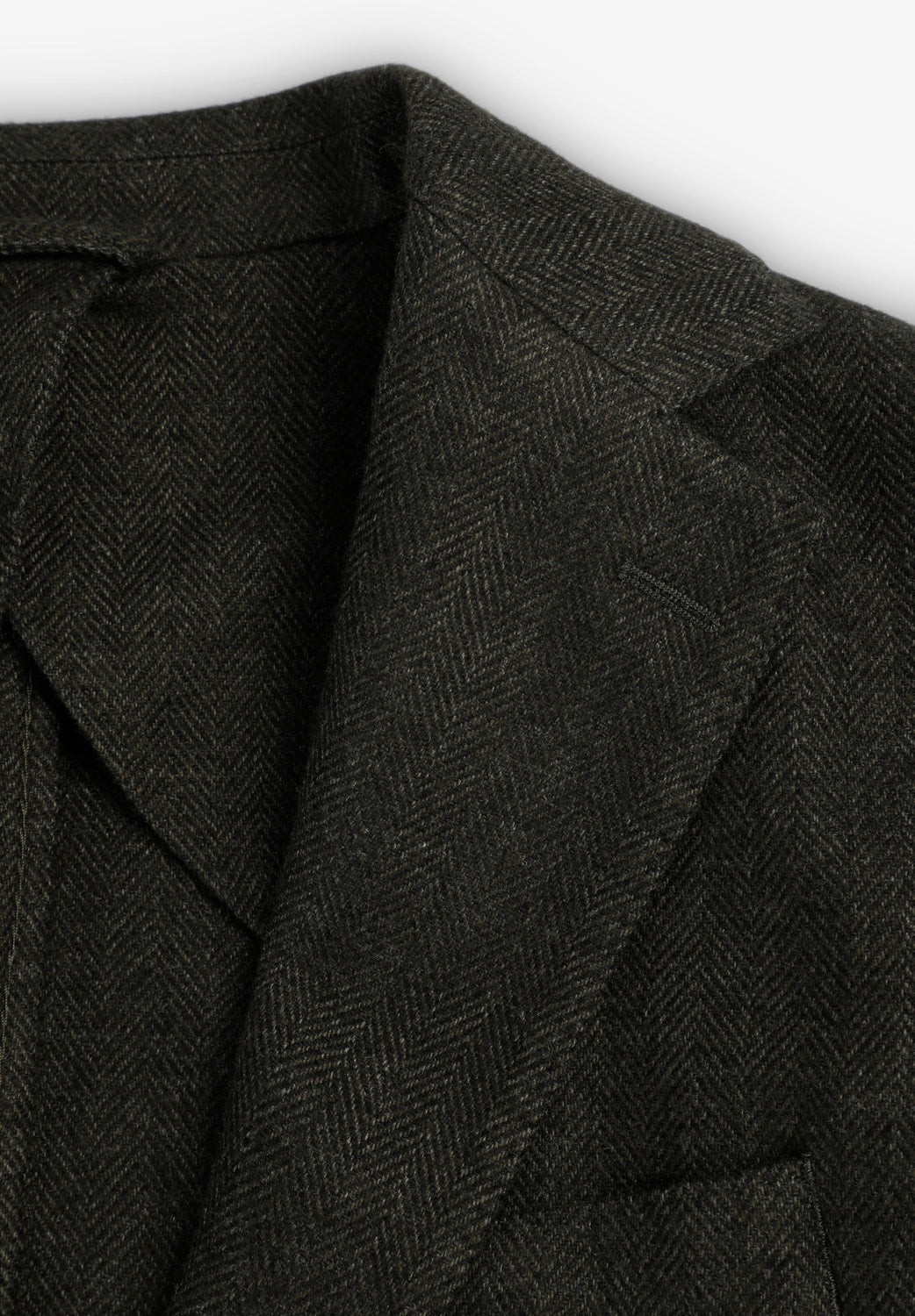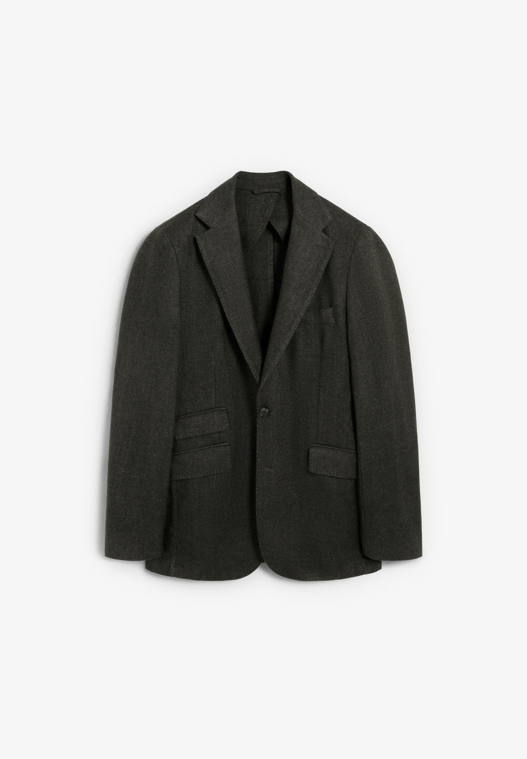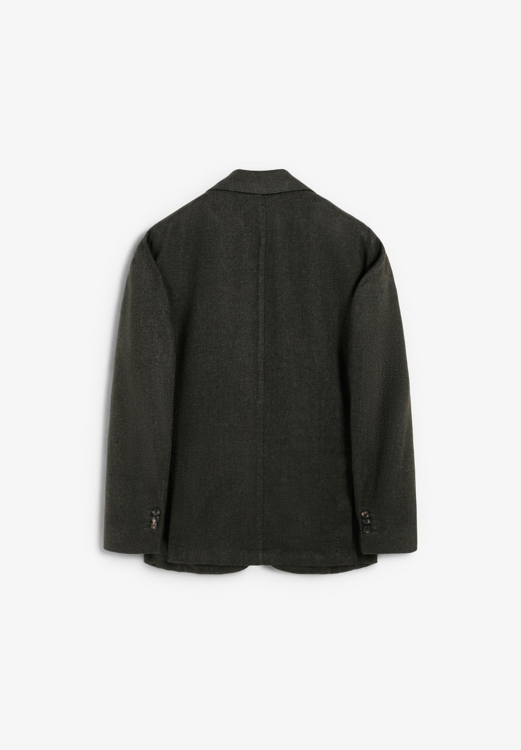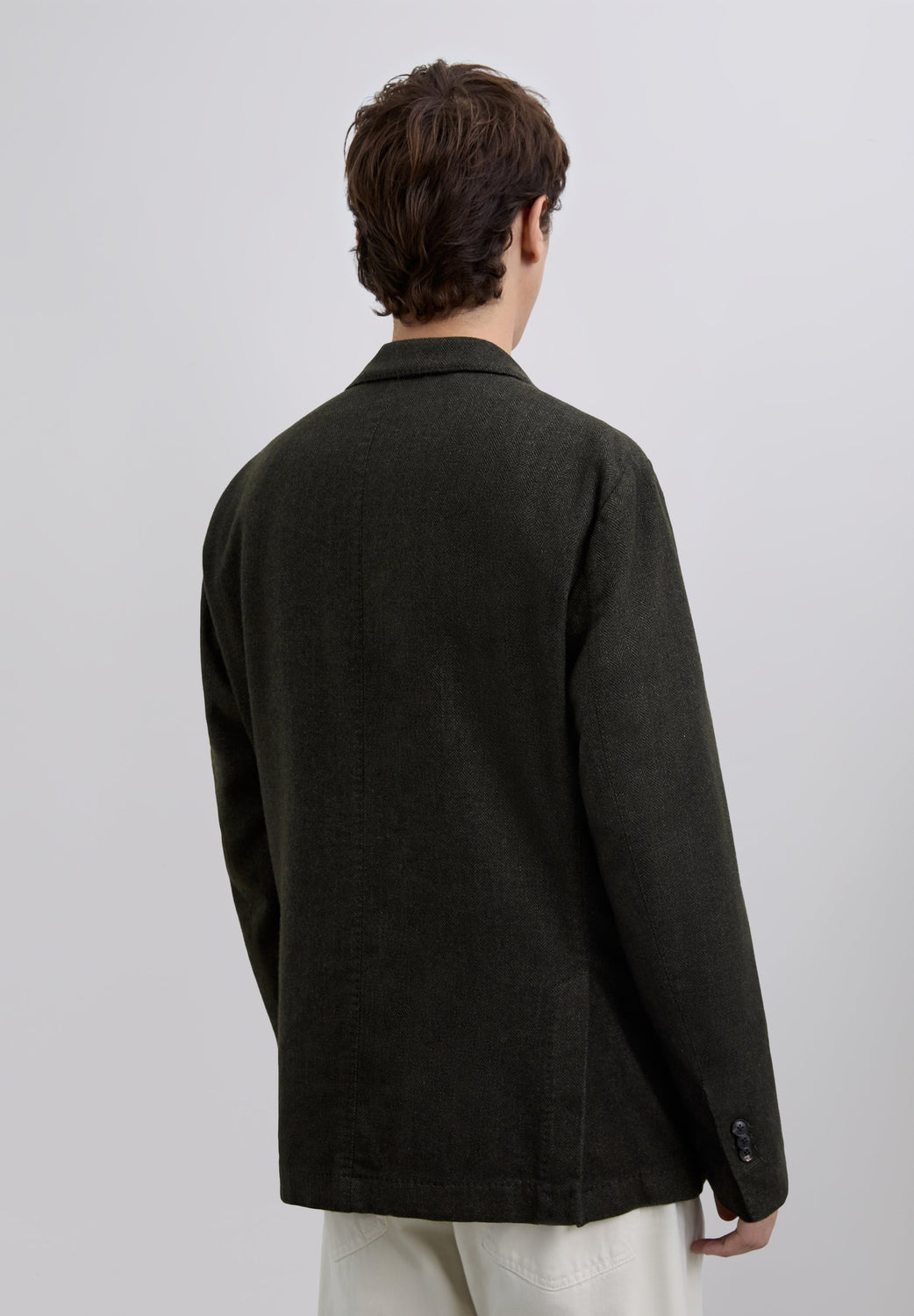 Americana confeccionada en lana. Diseño en espiga. Tres bolsillos con solapa. Cierre de doble botón. Bolsillo de pecho con ribete. Manga larga.