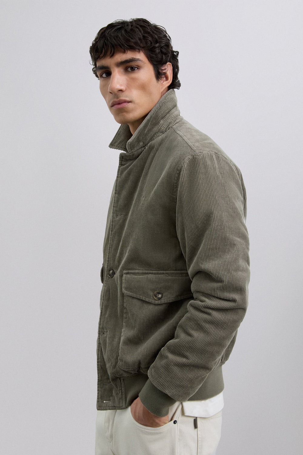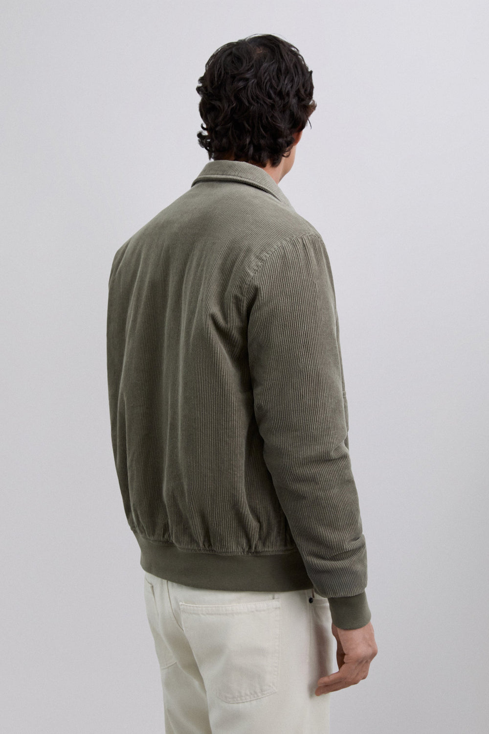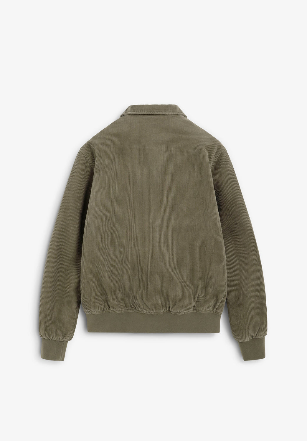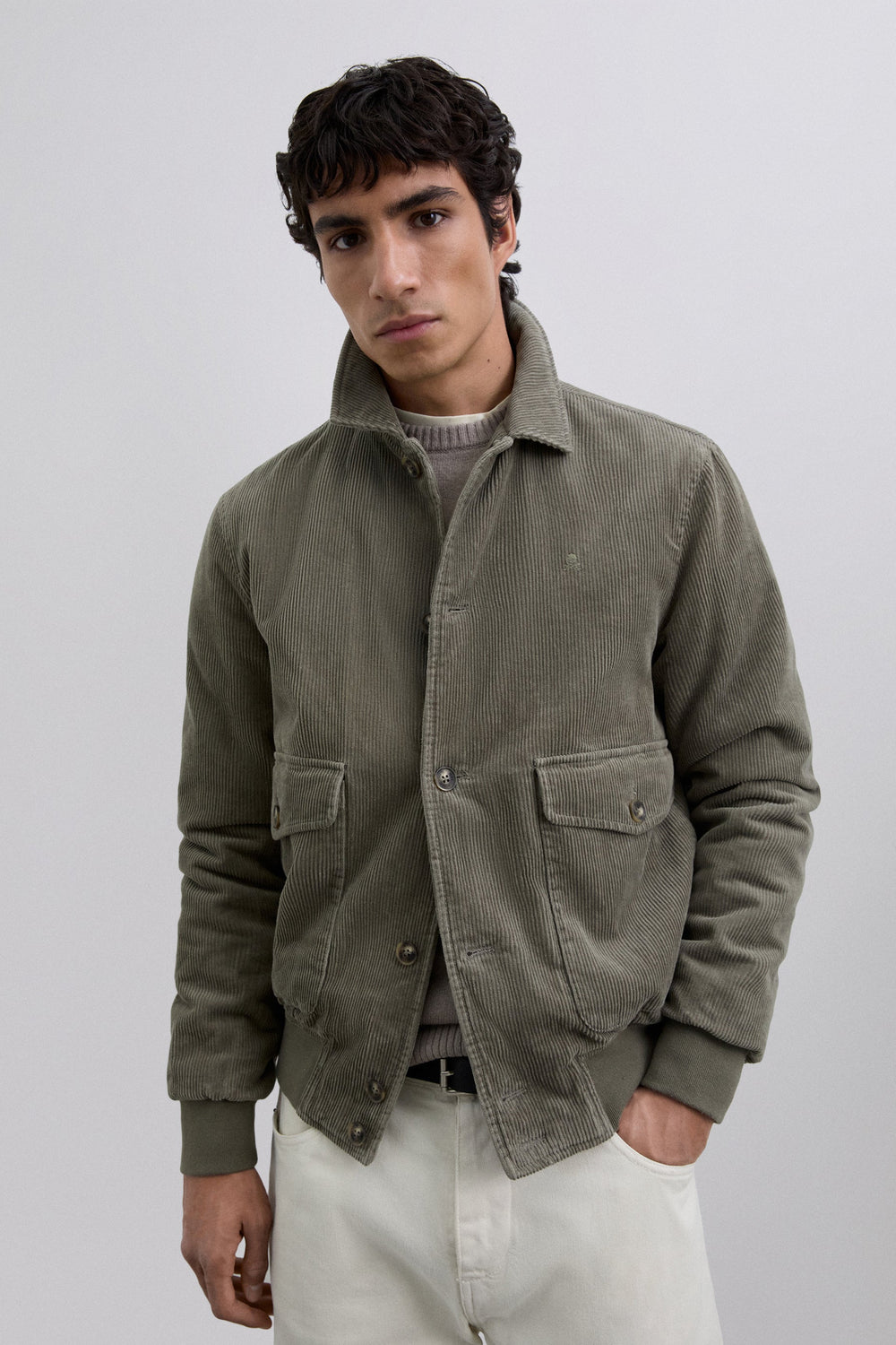 Chaqueta bomber de pana confeccionada en 100% algodón BCI. Cierre frontal mediante botones. Dobles bolsillos delanteros con cierre mediante botón. Puños y cintura acabados en rib. Detalle de logo bordado a tono en pecho.