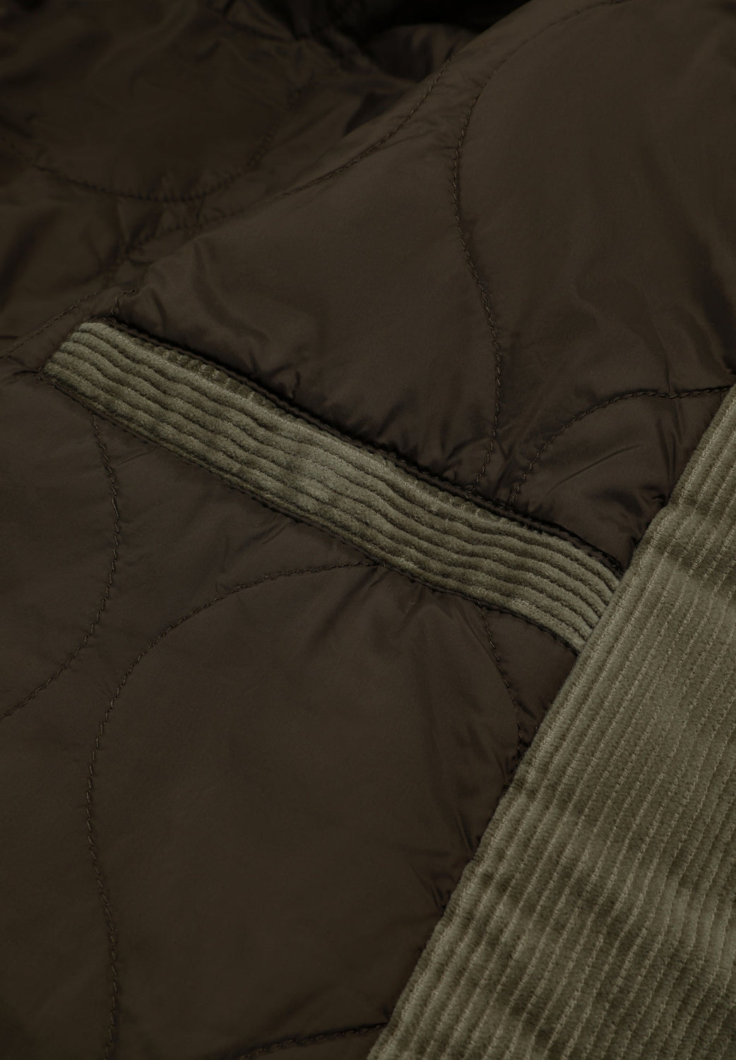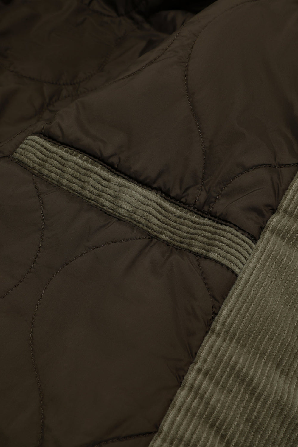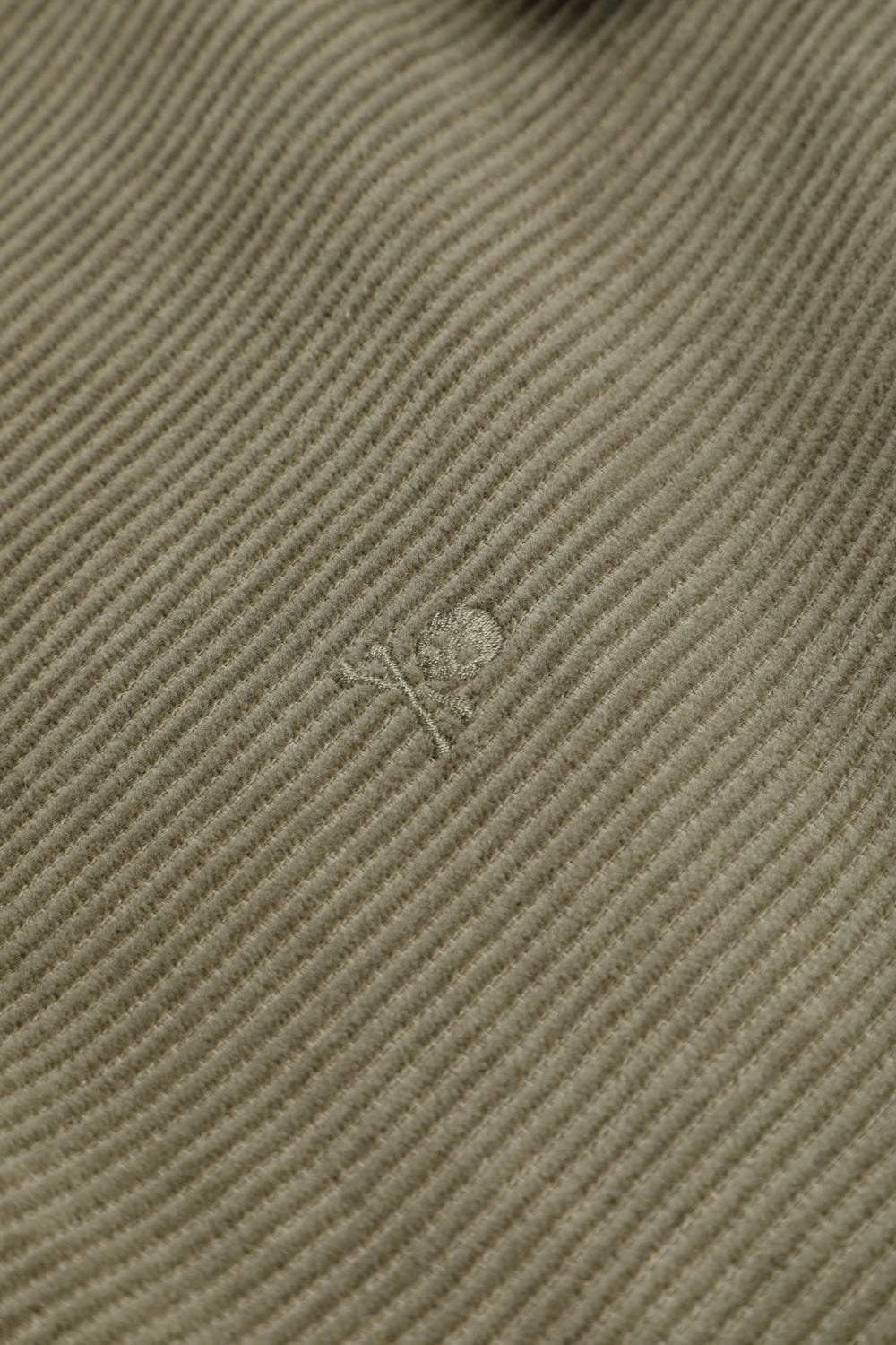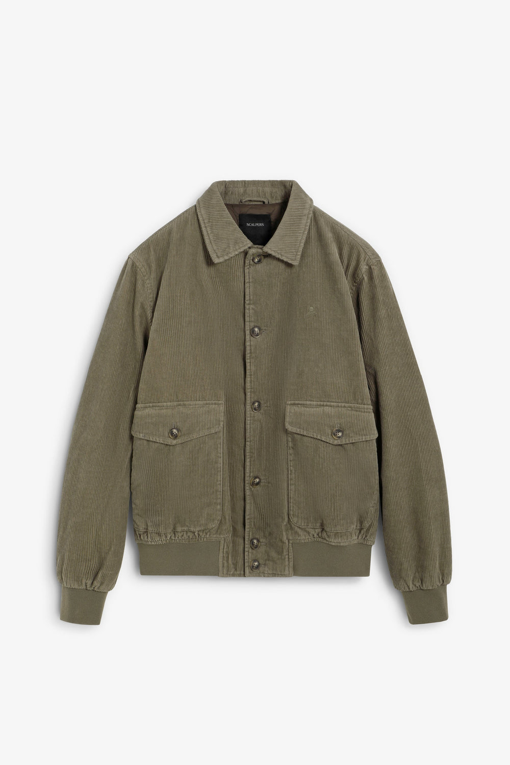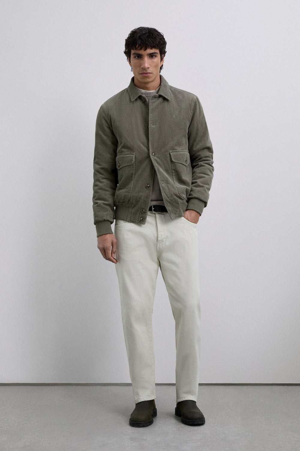Chaqueta bomber de pana confeccionada en 100% algodón BCI. Cierre frontal mediante botones. Dobles bolsillos delanteros con cierre mediante botón. Puños y cintura acabados en rib. Detalle de logo bordado a tono en pecho.