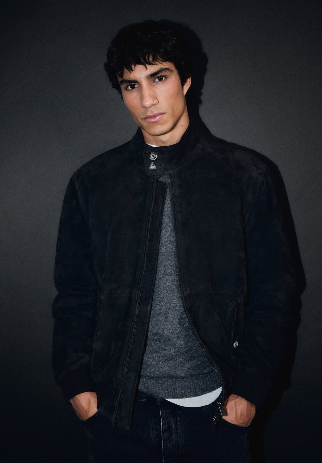 Chaqueta confeccionada 100% piel de cabra. Cremallera de doble carro. Puños y cintura acanalados. Dos bolsillos laterales con cierre de botón. Cuello de cierre dos botones.