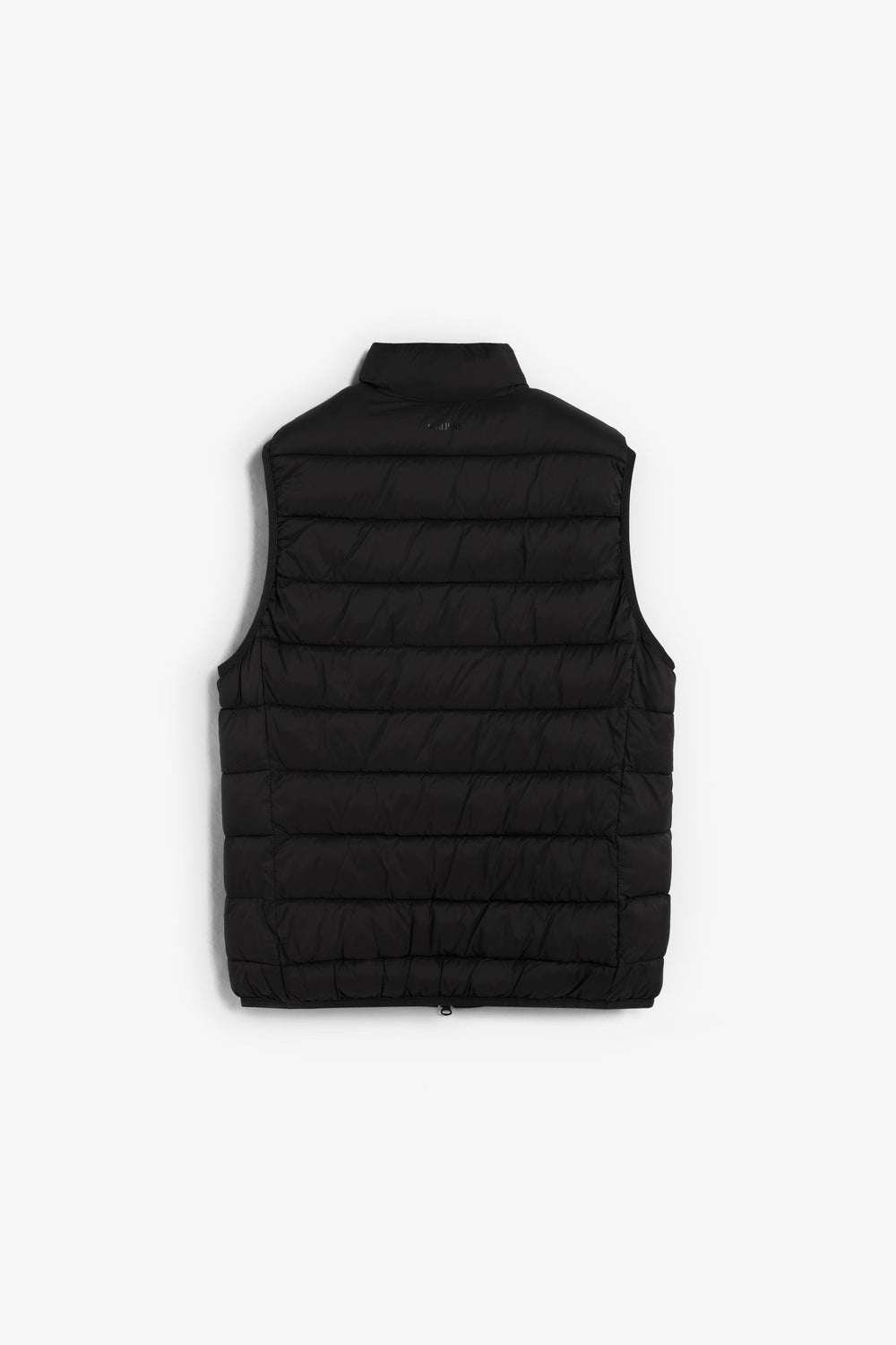 Chaleco acolchado. Repelente al agua. Forro interior confeccionado en tejido técnico. Bolsillos laterales ocultos con forro polar. Cierre mediante cremallera de doble carro grabada. Parche engomado con logotipo al tono en pecho.