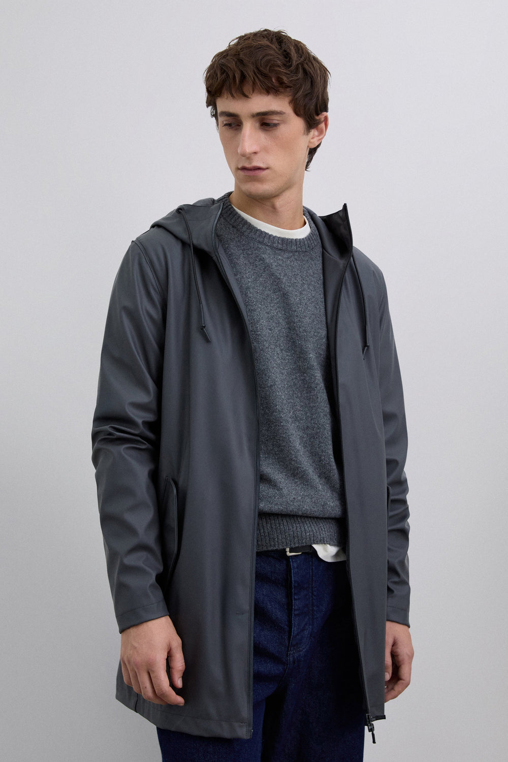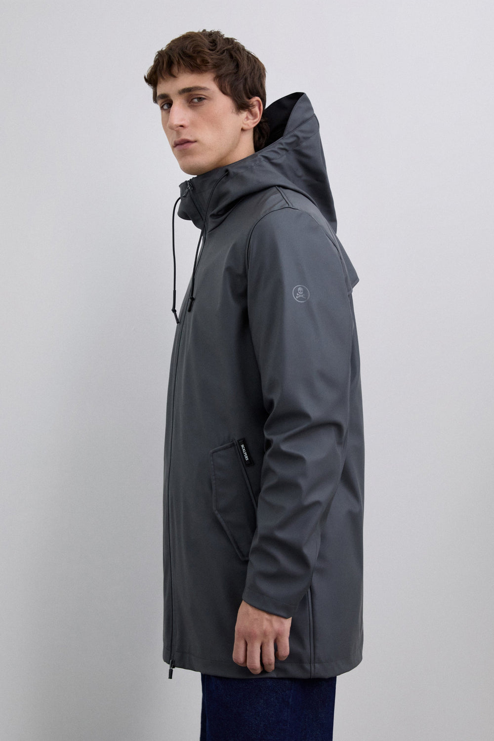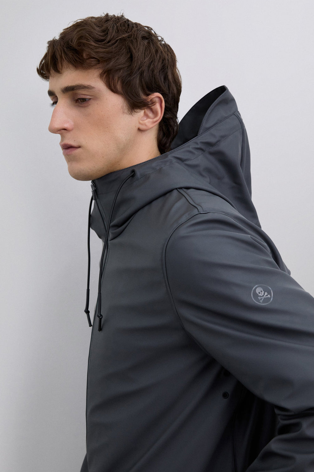 Chaqueta impermeable. Cuello con capucha ajustable con cordón. Cierre con cremallera de doble carro termosellada. Manga larga. Bolsillos laterales con tapeta y snap. Detalle logo engomado a contraste en frontal inferior y calavera a tono en cremallera.