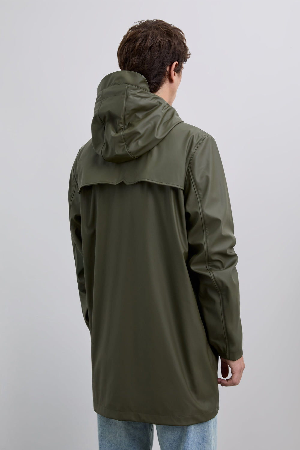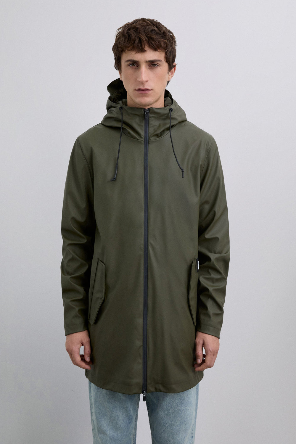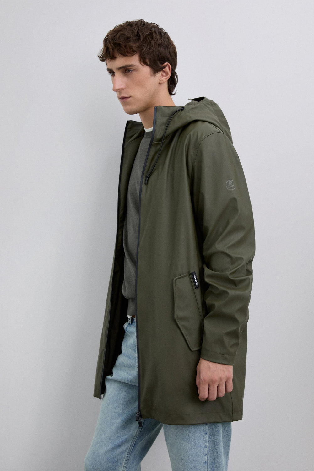 Chaqueta impermeable. Cuello con capucha ajustable con cordón. Cierre con cremallera de doble carro termosellada. Manga larga. Bolsillos laterales con tapeta y snap. Detalle logo engomado a contraste en frontal inferior y calavera a tono en cremallera.